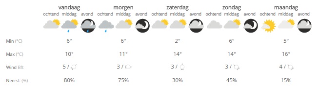 Dit weekend ziet er niet eens zo heel slecht uit. Een zwakke storing veroorzaakt wat regen in de avond en nacht naar zondag. Zaterdag overdag voor de neerslag uit schijnt de zon nog op veel plaatsen en zondagmiddag wordt het vanuit het zuiden droog met opnieuw opklaringen. Met een beetje geluk is de paraplu dus niet eens nodig. De wind is meest matig en de temperatuur schommelt tussen 12 en 15 graden.