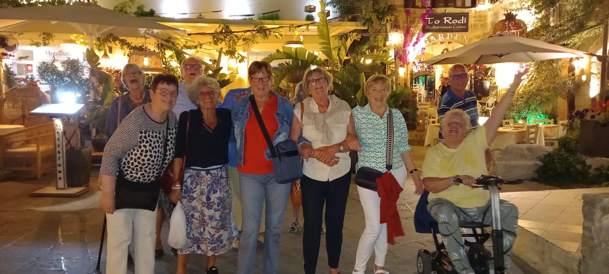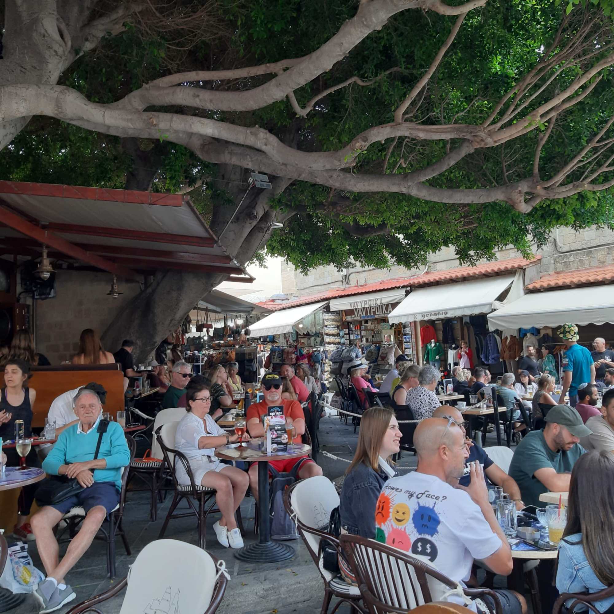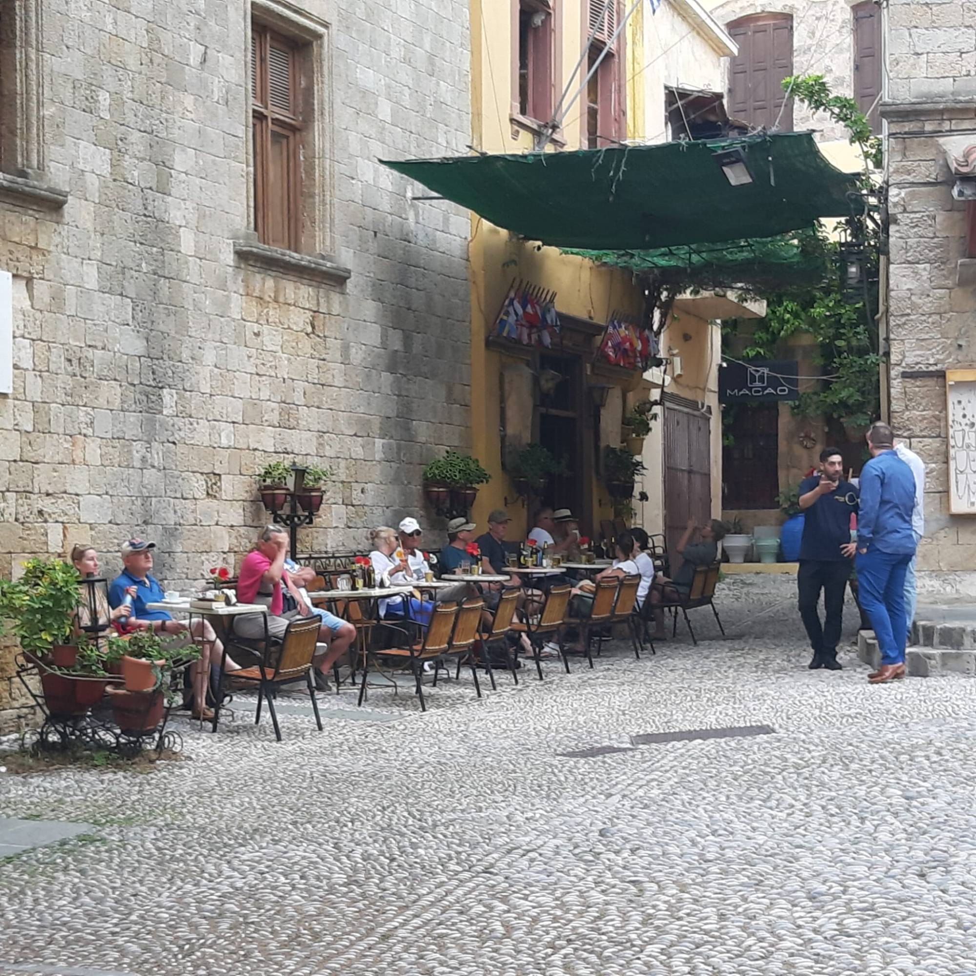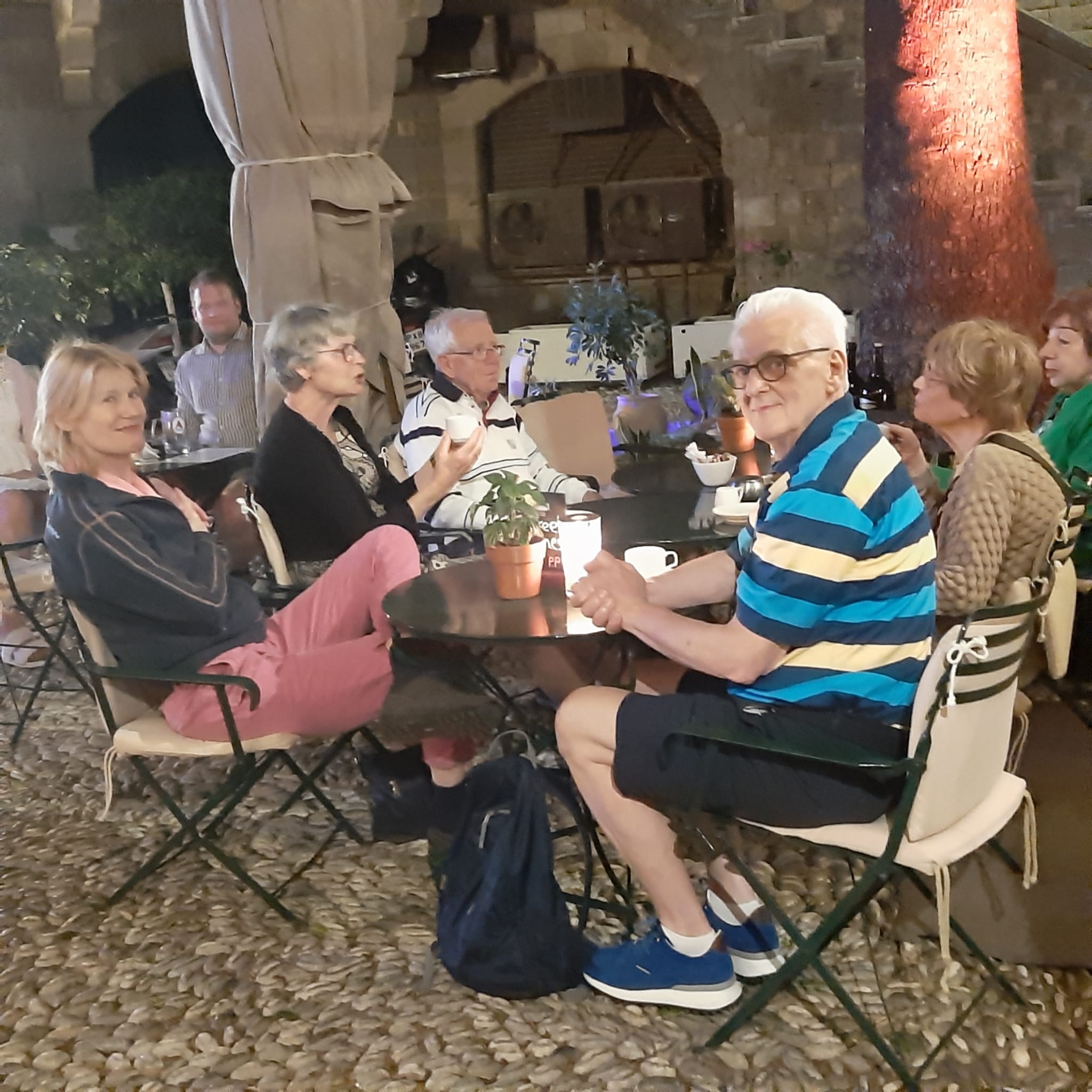 Ik, Jacqueline, ga eerder samen met Frido en Gjilke naar het restaurant, waar we met de groep gaan eten. Het wordt daar een vrolijke boel en omdat er nog wat tijd over is voordat het busje ons weer zal komen ophalen ga ik met wat gasten nog even de stad door en drinken we op een leuk pleintje koffie. De anderen zijn ook op de afgesproken tijd richting de uitgang van Rhodos stad gegaan. Om 22.00 uur rijden we weer richting hotel.