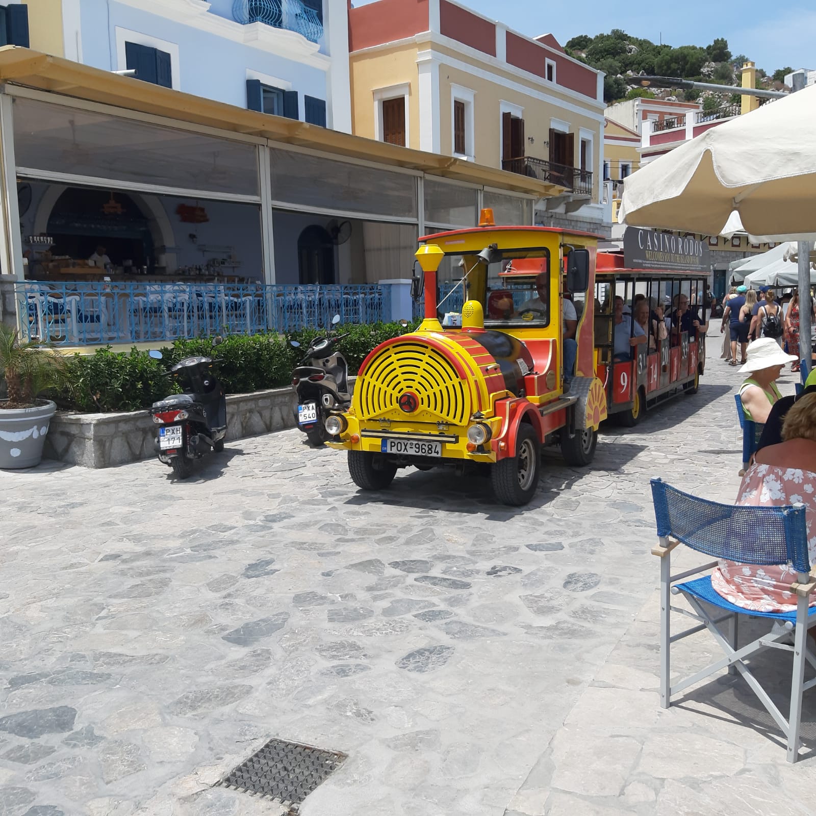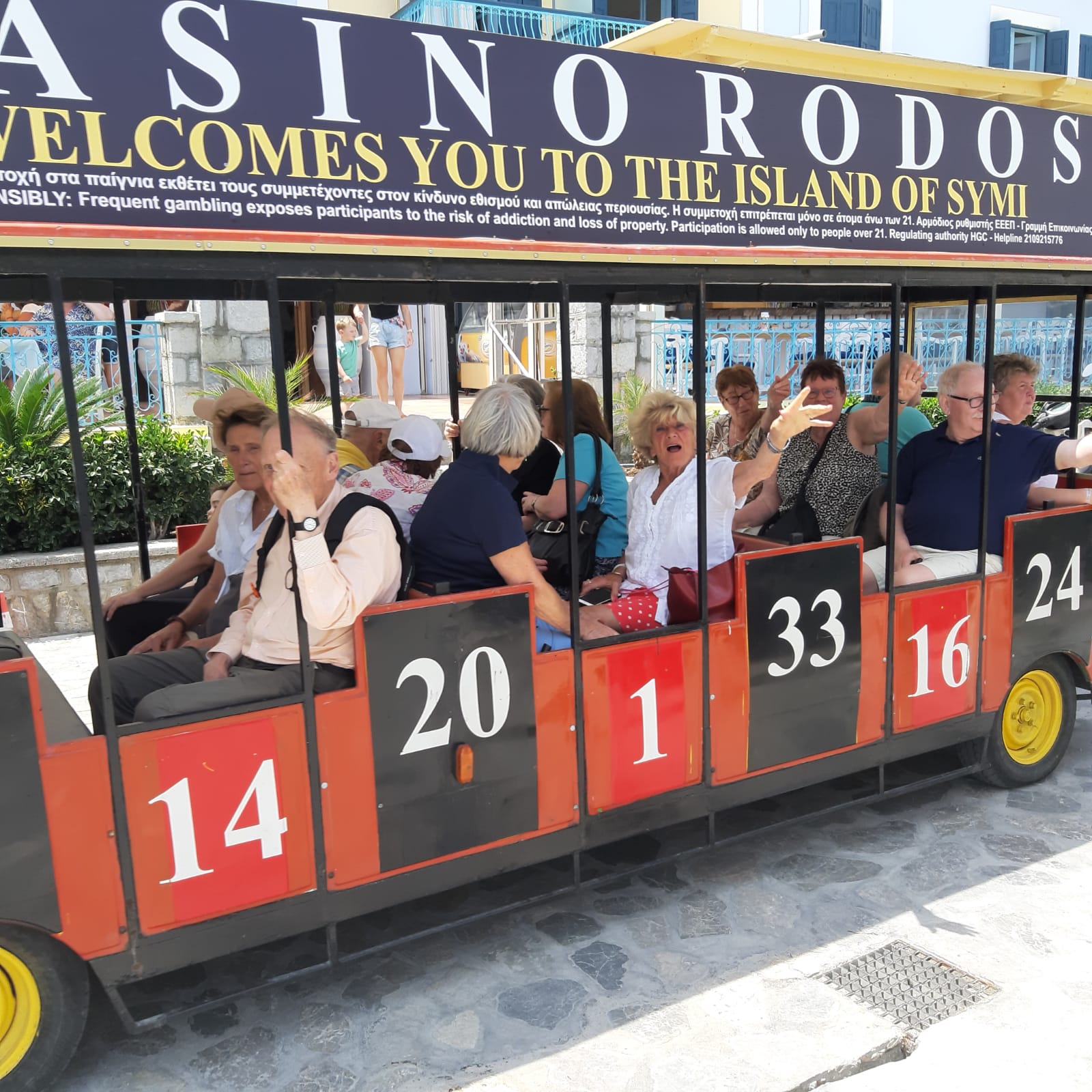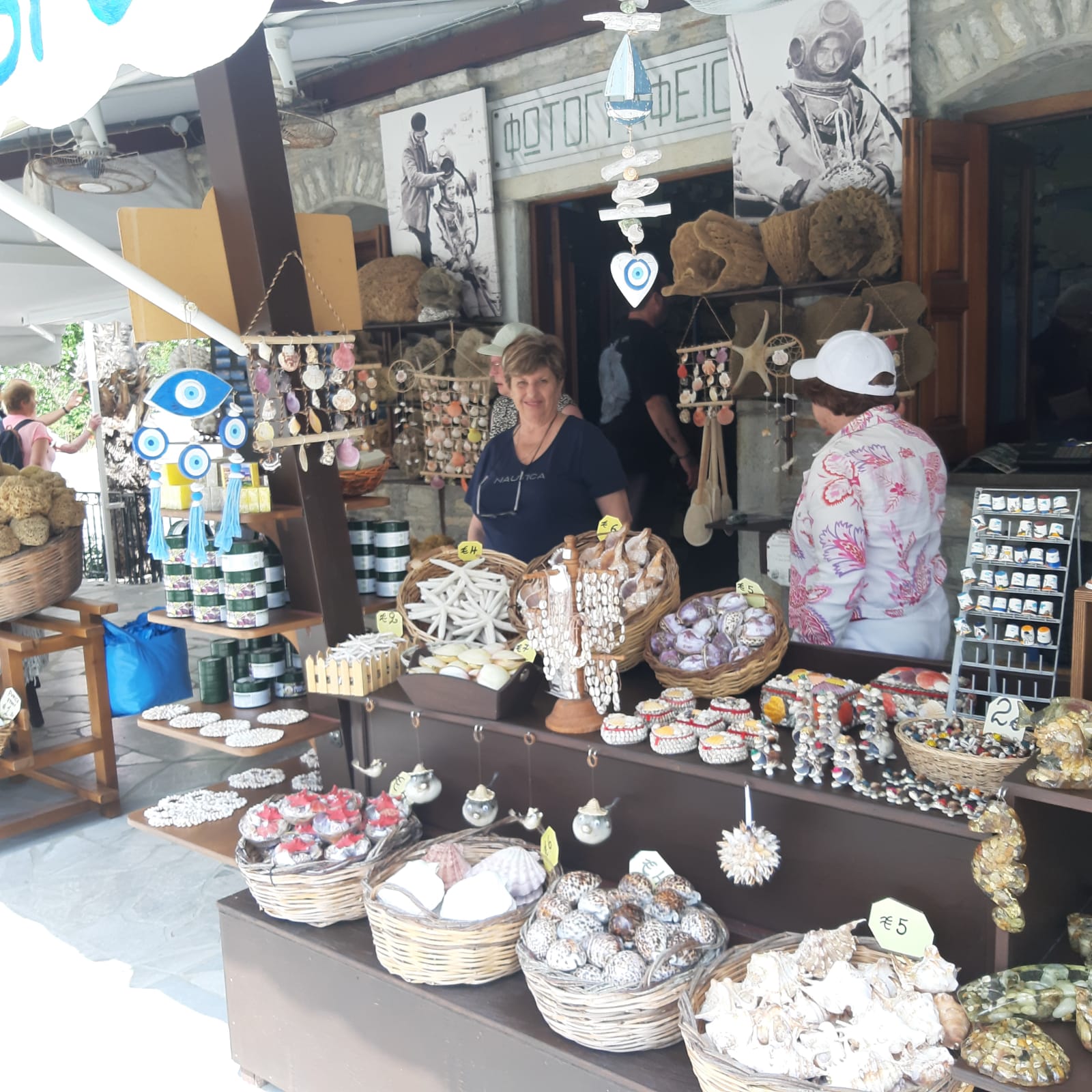 Na eerst even een kop koffie te hebben gedronken, zijn we een winkel ingelopen om alle sponzen die er zijn te bewonderen. De eigenaar heeft daarbij wat uitleg gegeven en er is het een en ander ingekocht. Vervolgens hebben verschillende gasten om 12.00 uur het treintje genomen om op deze manier meer van dit prachtige eiland te zien.