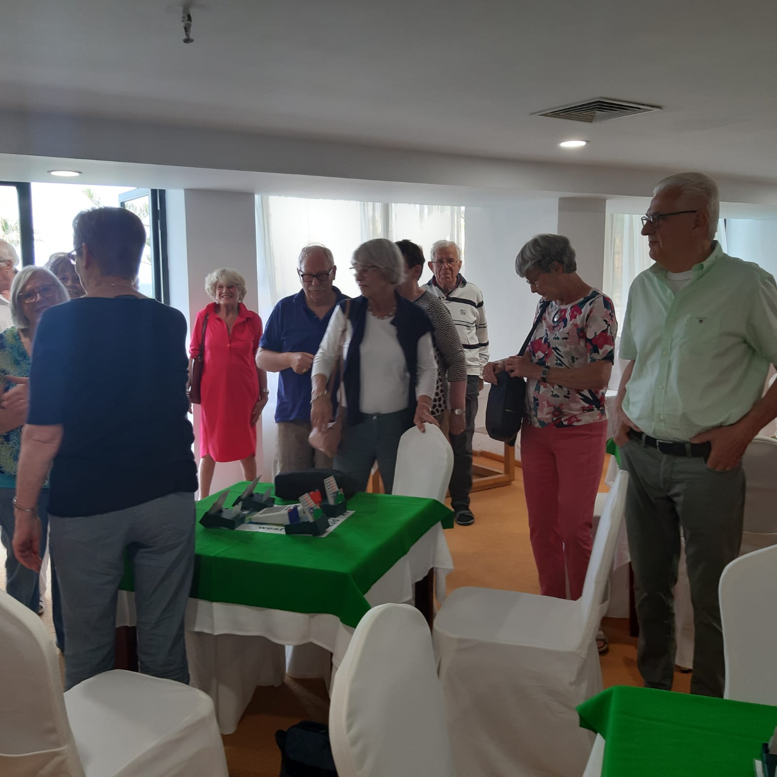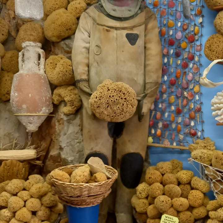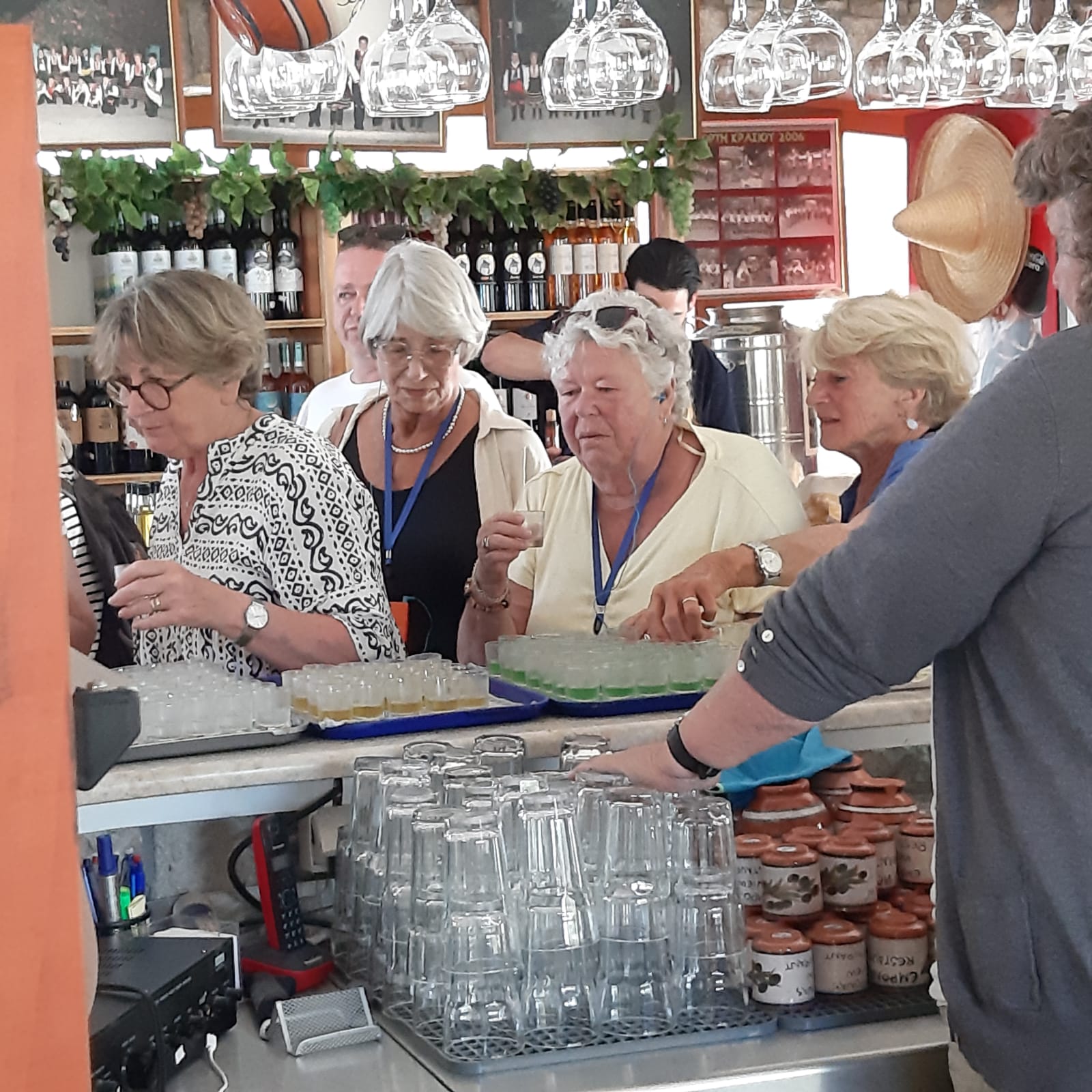 Na eerst even een kop koffie te hebben gedronken, zijn we een winkel ingelopen om alle sponzen die er zijn te bewonderen. De eigenaar heeft daarbij wat uitleg gegeven en er is het een en ander ingekocht. Vervolgens hebben verschillende gasten om 12.00 uur het treintje genomen om op deze manier meer van dit prachtige eiland te zien.