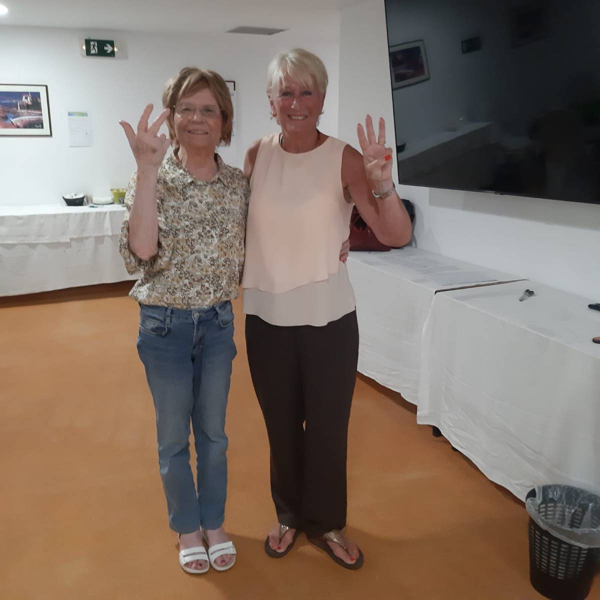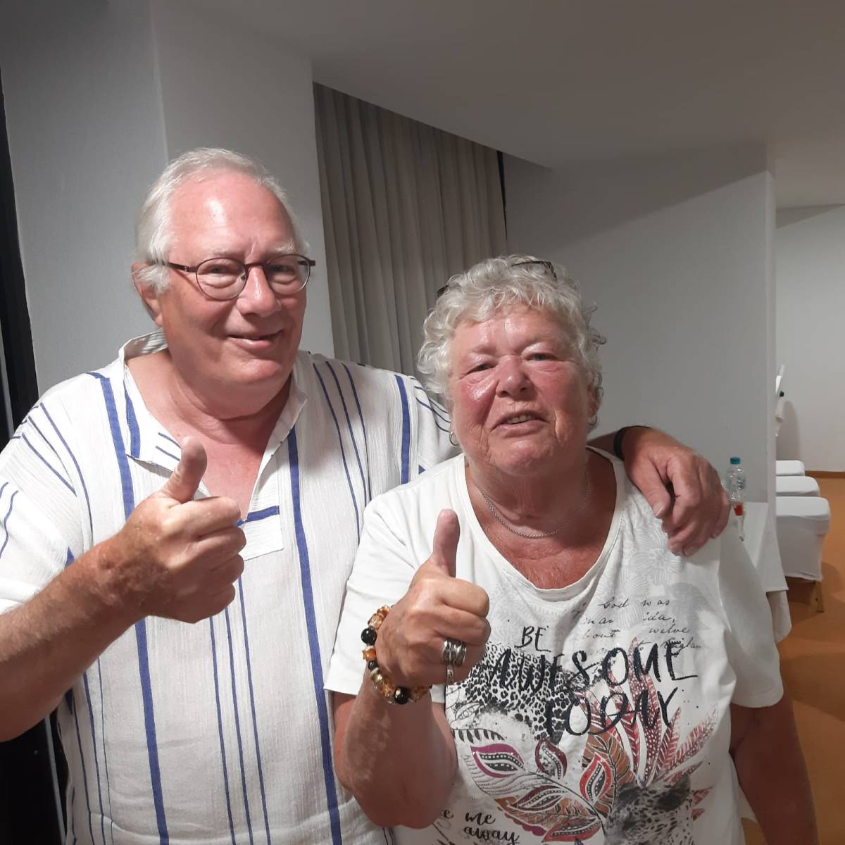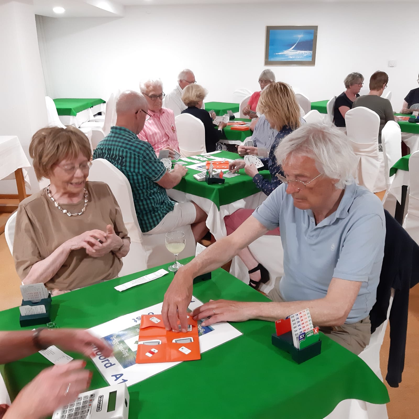 Mariet en Trudy spelen nog 2 rondjes mee voor het diner en worden rond 20.00 uur opgehaald. We kunnen ze dan nog even gezamenlijk uitzwaaien voordat wij de laatste 4 ronden gaan spelen. Na het eten was het dan zover. Mariet en Trudy zijn uitgezwaaid en op weg naar huis. Wij hebben het bridgen afgemaakt en daarna nog een drankje genomen in de bar. Toen gauw naar onze kamers want de wekkers gaan vroeg, morgen gaan we met 9 mensen naar Simy. Vandaag zijn Han en Petra weer 1e geworden (laatste afbeelding). Zij staan net aan op de 1e plaats in de competitie gevolgd door – met een verschil van 0,19% – Rosy en Frido. Het wordt een spannende strijd de komende dagen. Naar de uitslag.