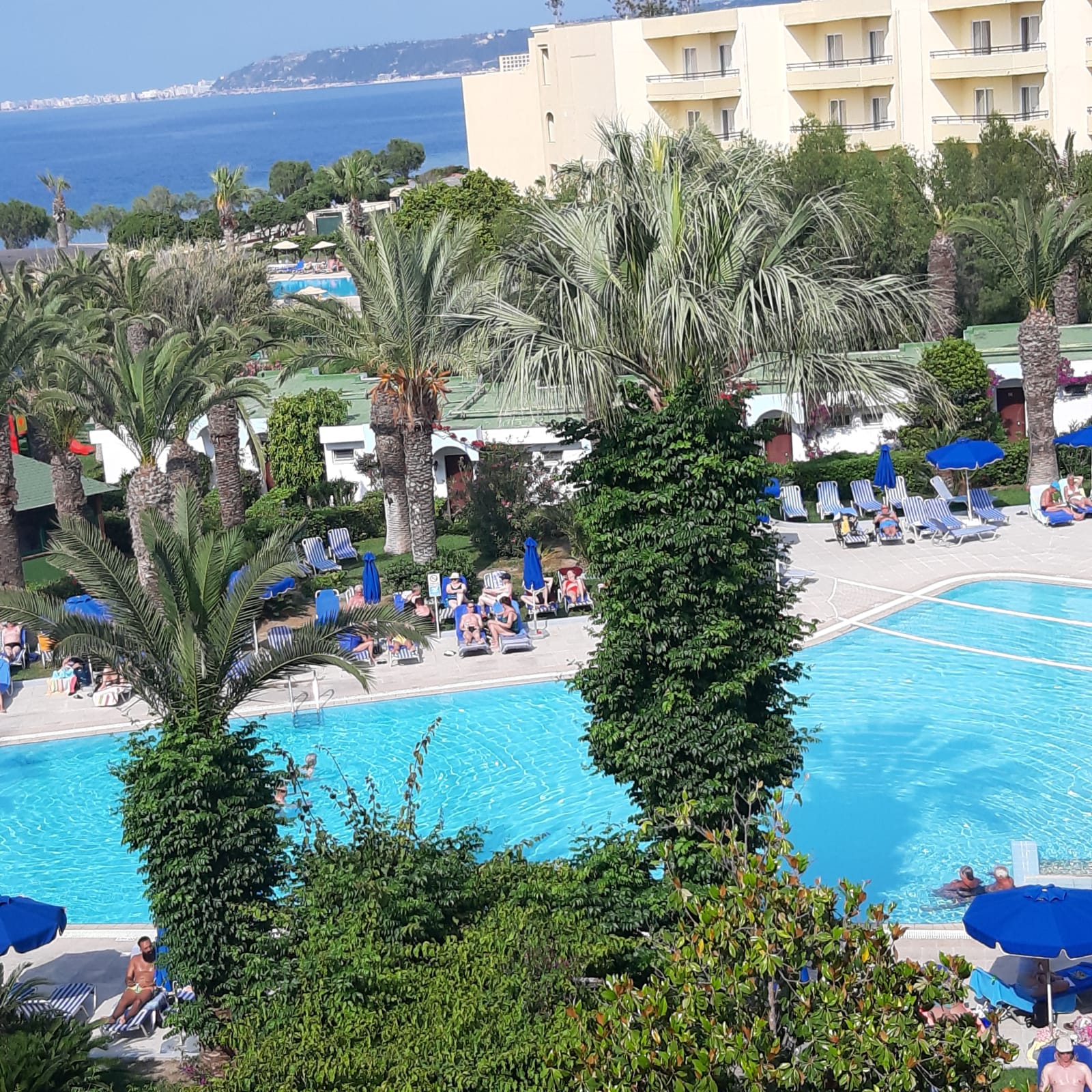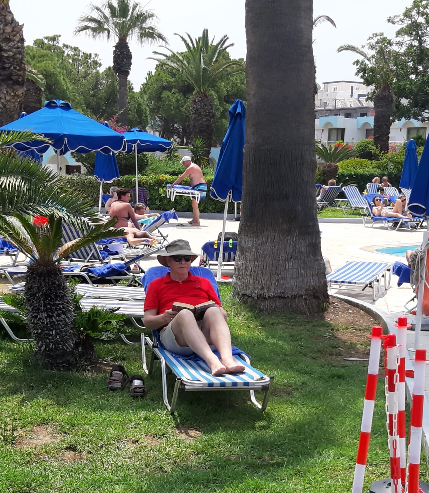 Op Schiphol komen we de eerste bekende gasten tegen. We begroeten elkaar uitbundig, wat een leuk weerzien! Na een voorspoedig vlucht landen we op Rhodos. Aangekomen in het hotel werden we door het personeel met knuffels begroet. Als begeleiding komen we hier al jarenlang en maakt dat we het voelen als een soort thuiskomen. De kamers zien er weer keurig uit met in de badkamer een set verzorgingsproducten. Tijdens het welkom maakt iedereen kennis met elkaar en heffen we het glas op een fijne bridgevakantie. Vanavond is er inloopbridge. Morgen start de competitie.
