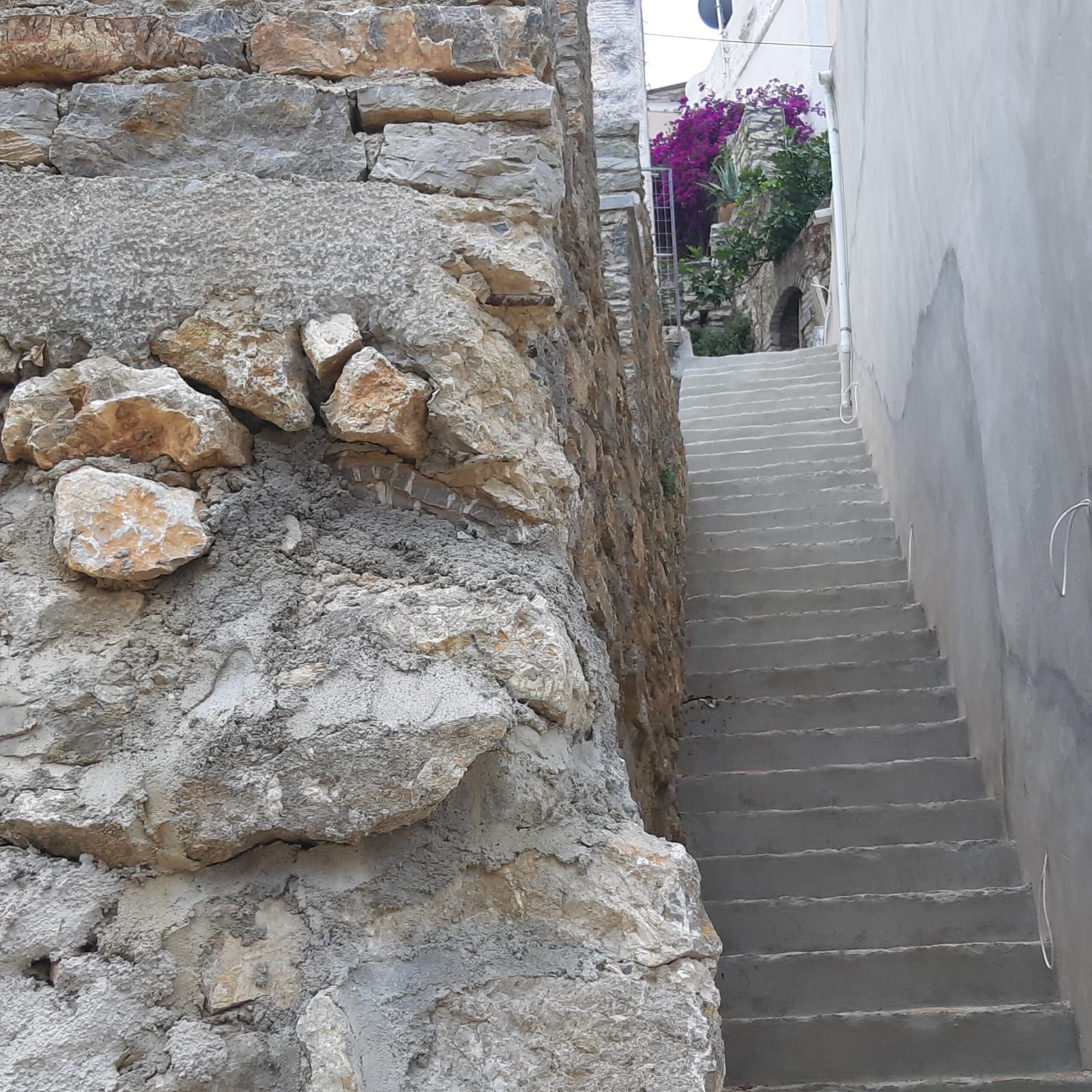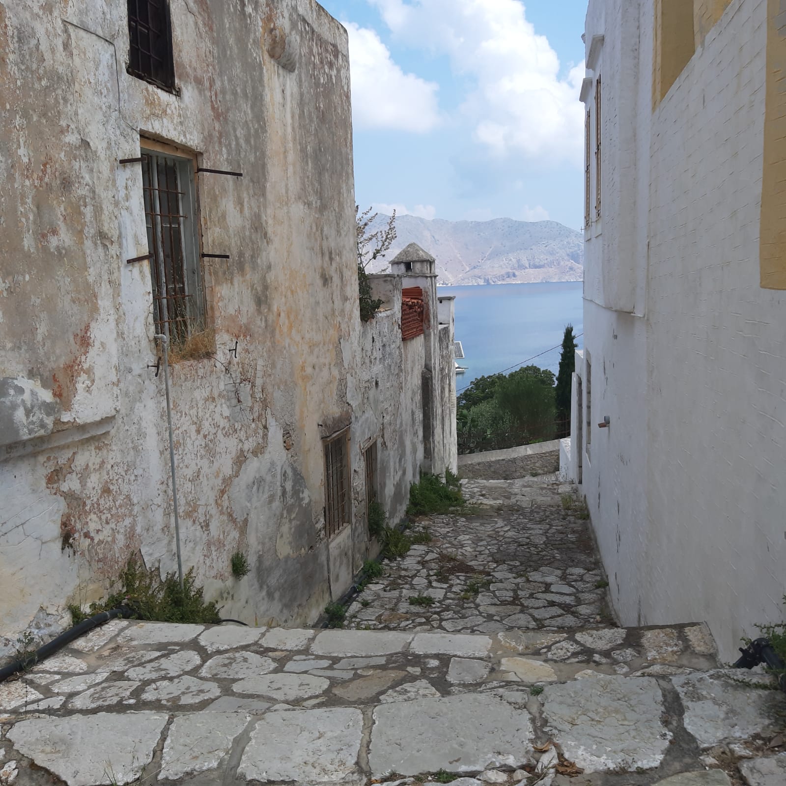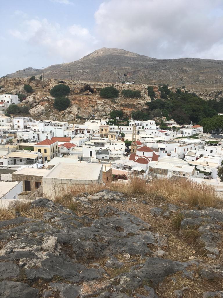 Jan en Coco hebben de voorkeur gegeven aan een heerlijk terrasje en zijn lopend door het kleine centrum gelopen. Ikzelf ben alle trappen opgelopen naar de bovenstad, zo’n 400 treden. Deze trap wordt ironisch Kali Strata of goede weg genoemd. Eenmaal boven heb je een gigantisch uitzicht over het eiland, maar ook een flesje water nodig.