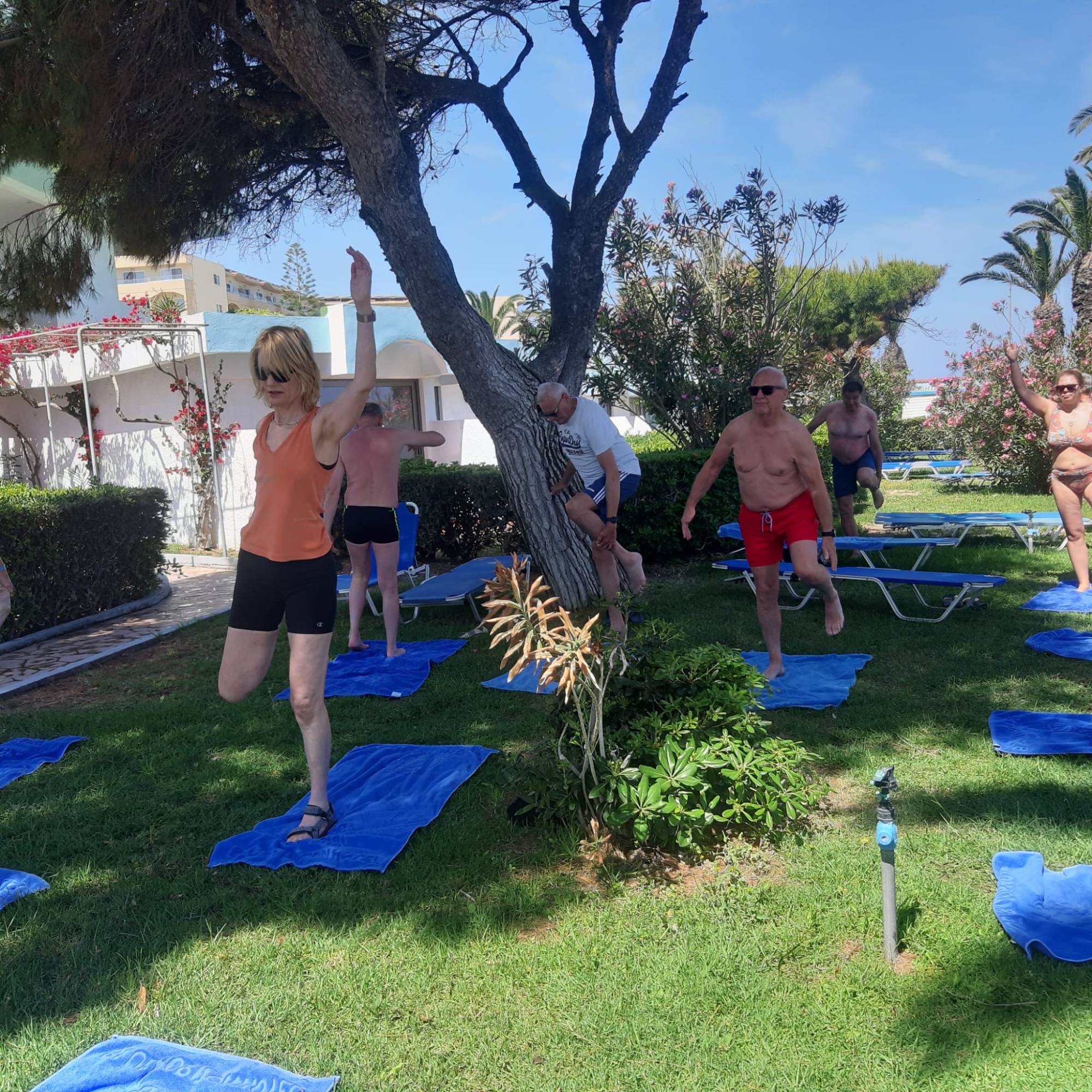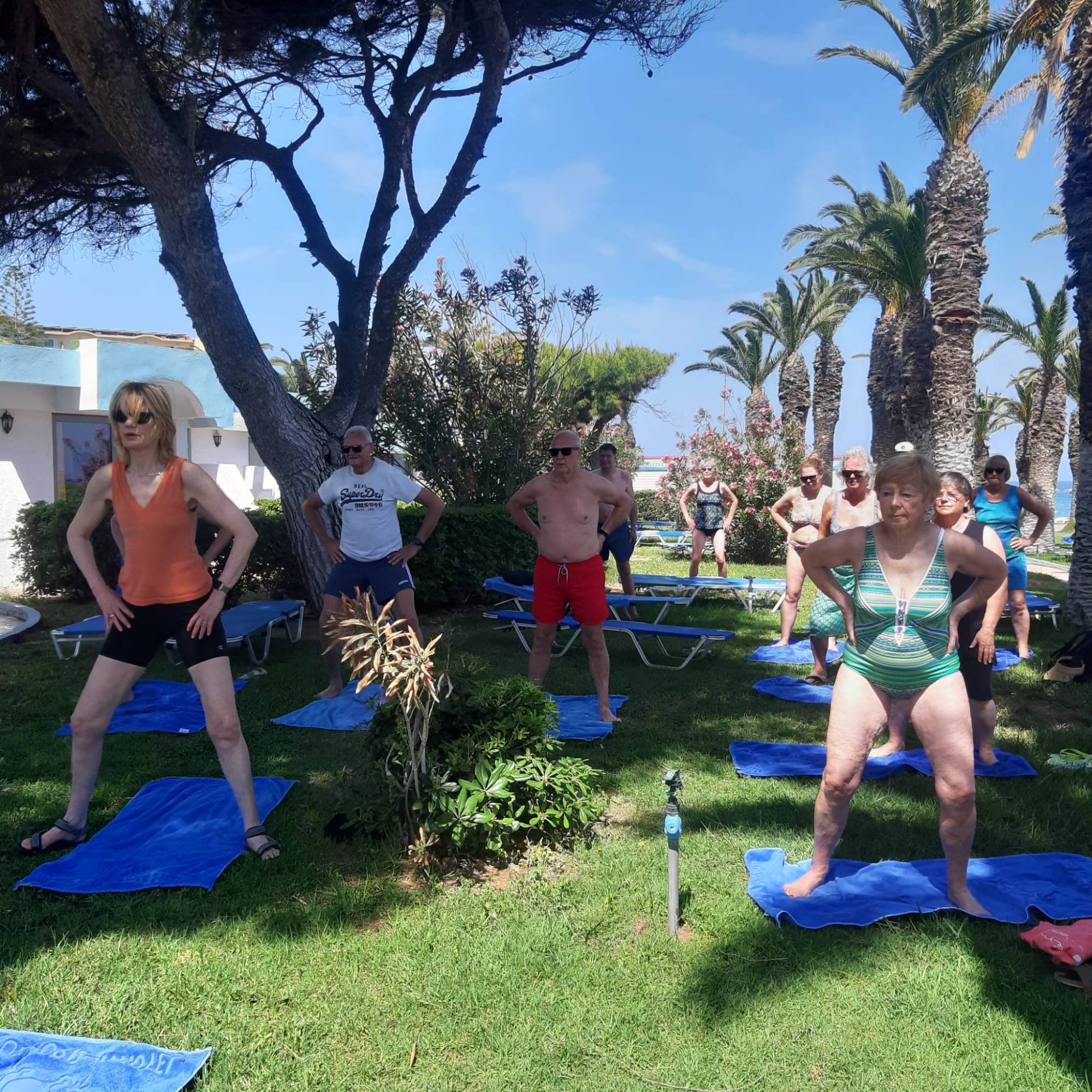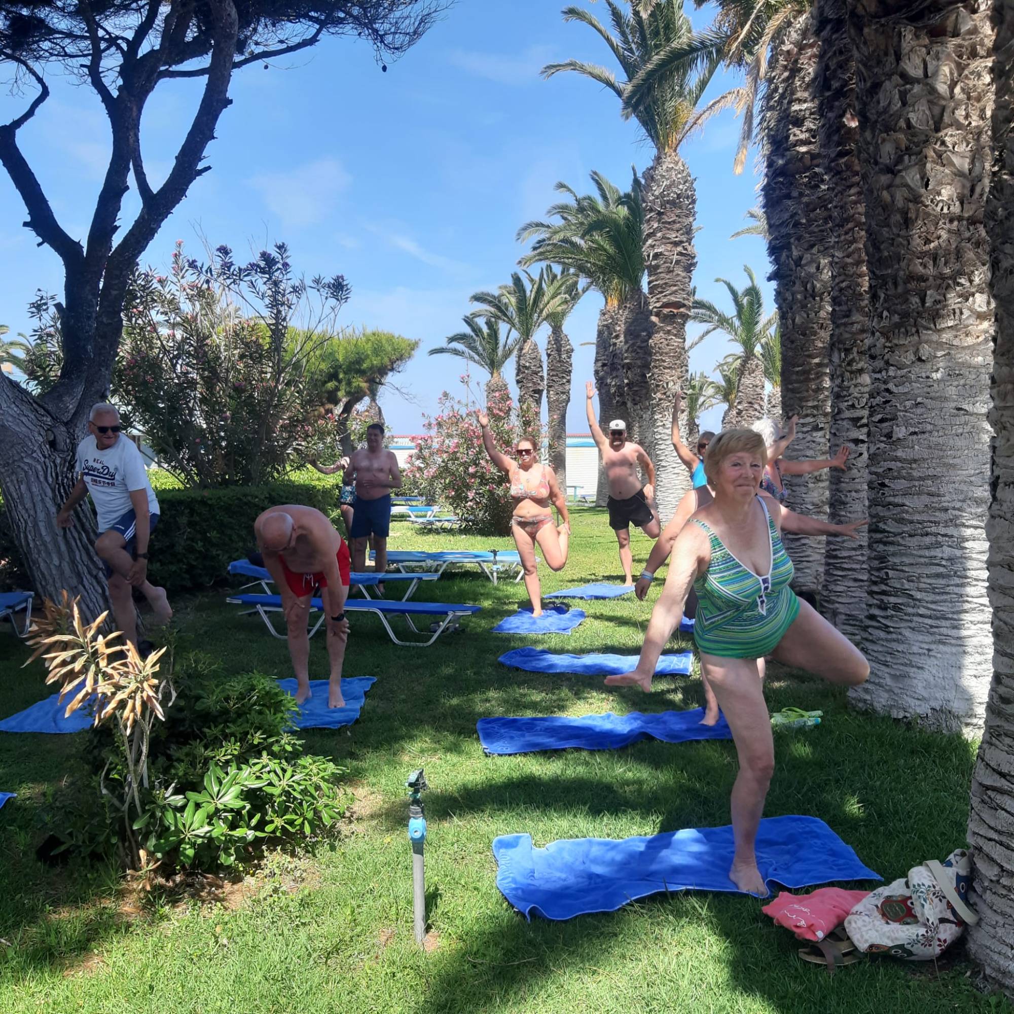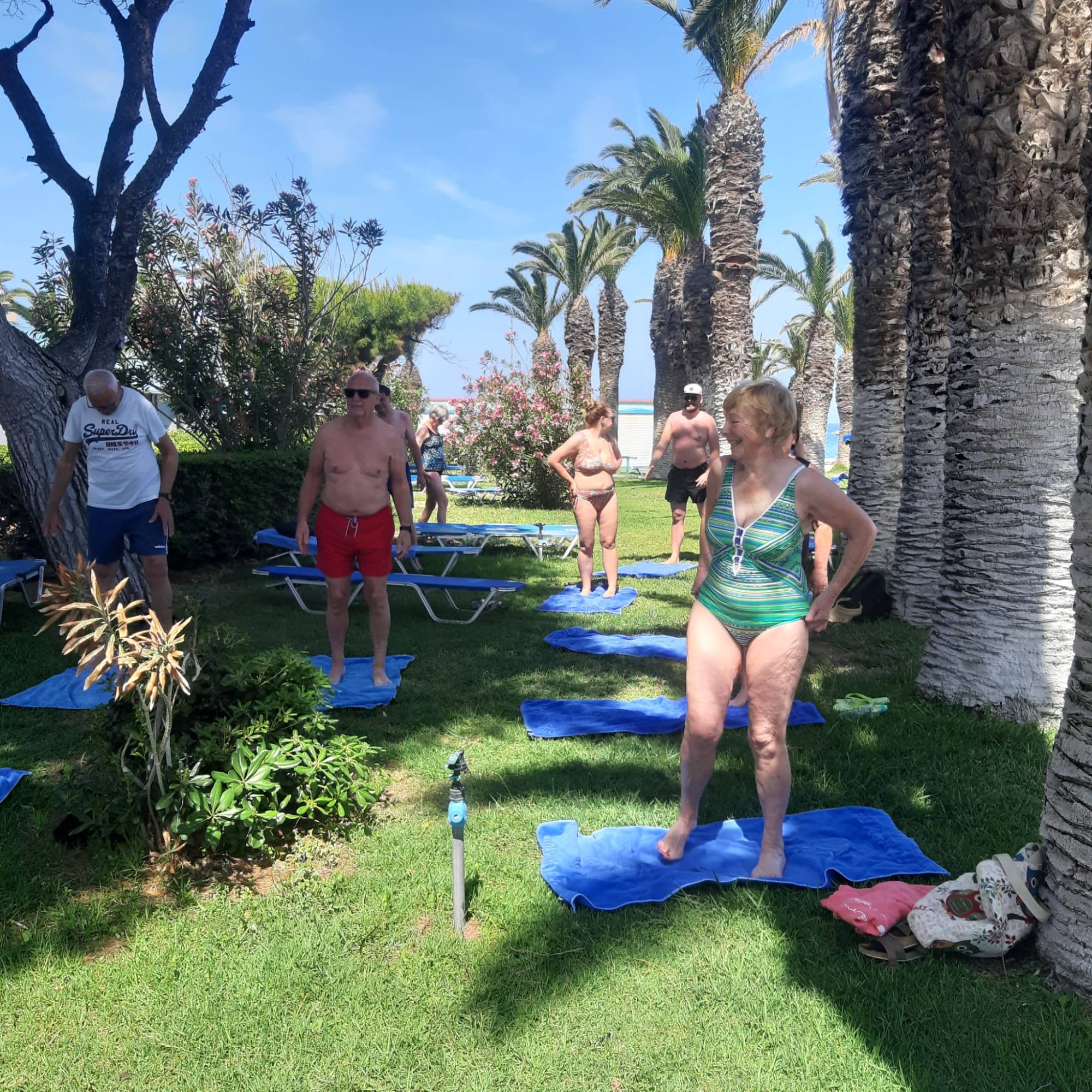 Na een toch wel vermoeiende dag gisteren zijn er gasten die toch weer om 10.30 uur paraat stonden voor de rek- en strekoefeningen hier op het grasveld. Gevolgd door de aqua gym in het zwembad. Het is inspanning maar zeker ook ontspanning.