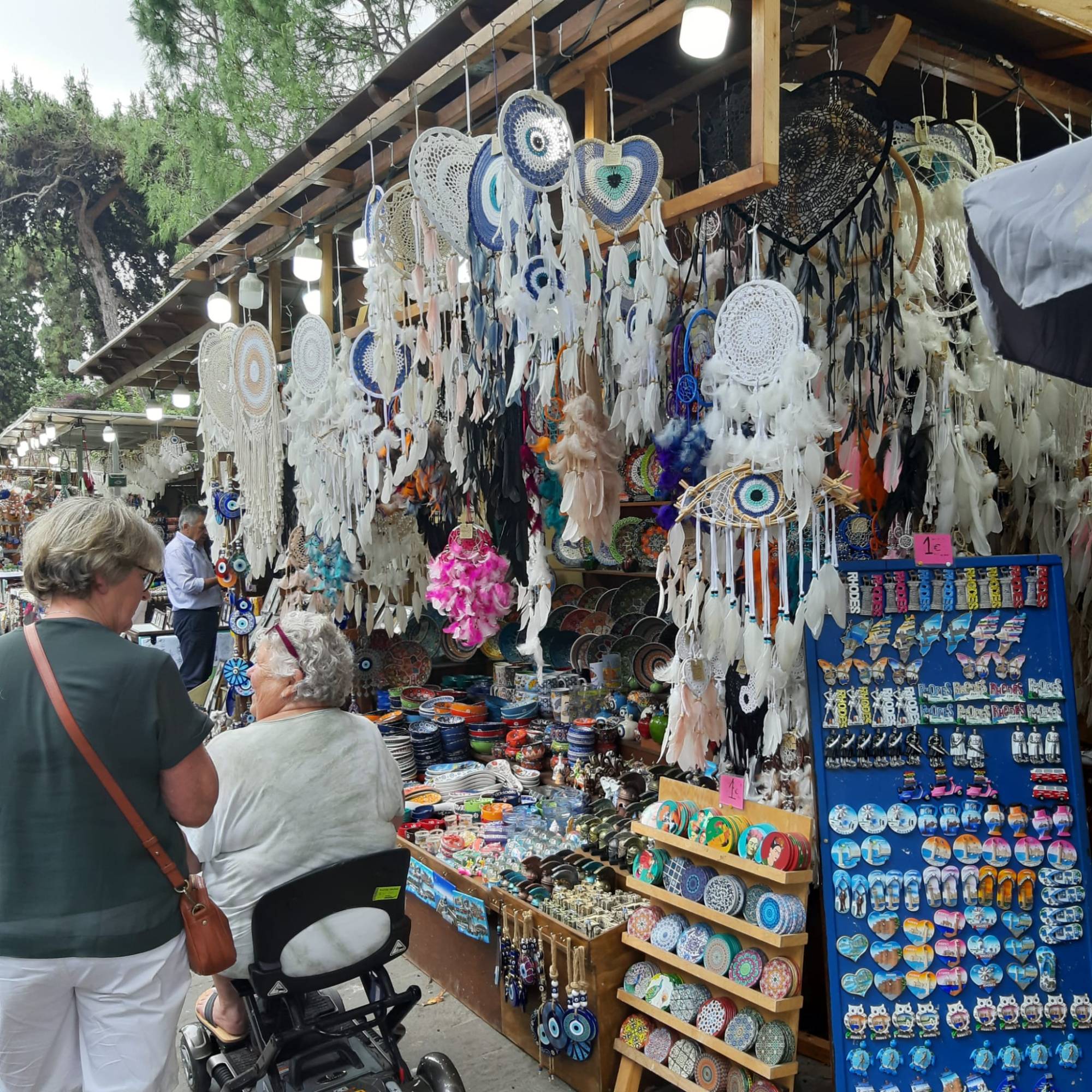 Vanmorgen zijn Mariet, Trudy, Tini en ik met de taxi naar Rhodos gegaan. Met de pinpas in de tas en goede bedoelingen om niet te veel uit te geven zijn we het oude gedeelte van Rhodos ingegaan. Maar met al die winkels en toch wel leuke kleding voor betrekkelijk weinig geld is de verleiding te groot en kwamen we met tasjes vol thuis. Tiny heeft belooft dat ze haar nieuwe jurk zal showen.