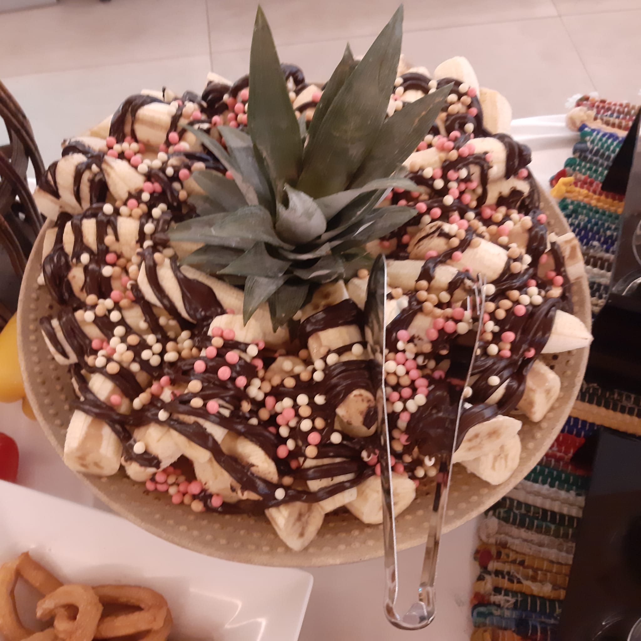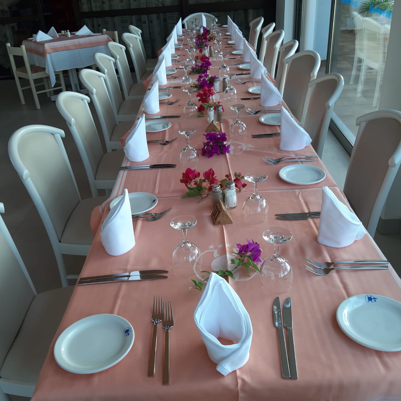 Na een gesprekje met de manager mogen de gasten deze laatste avond toch gewoon mee dineren. Er was speciaal een grote tafel gedekt voor 18 personen en leuk versierd met bloemen.