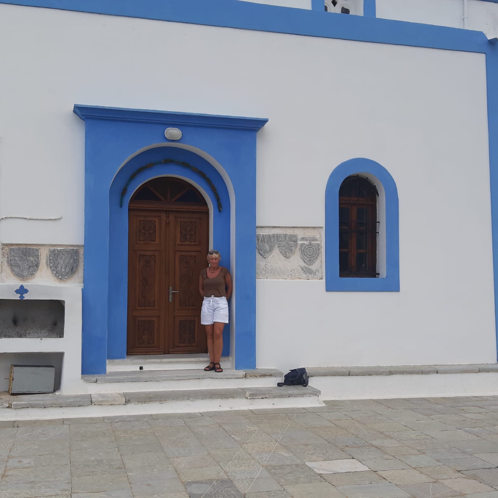 Vandaag is de groep met de boot naar Simy. Omdat ik, Edith, altijd zeeziek word op een boot heb ik een mooie strandwandeling gemaakt. Mooi altaartje gezien en overal picknickhutjes en rotsblokken om uit te rusten!