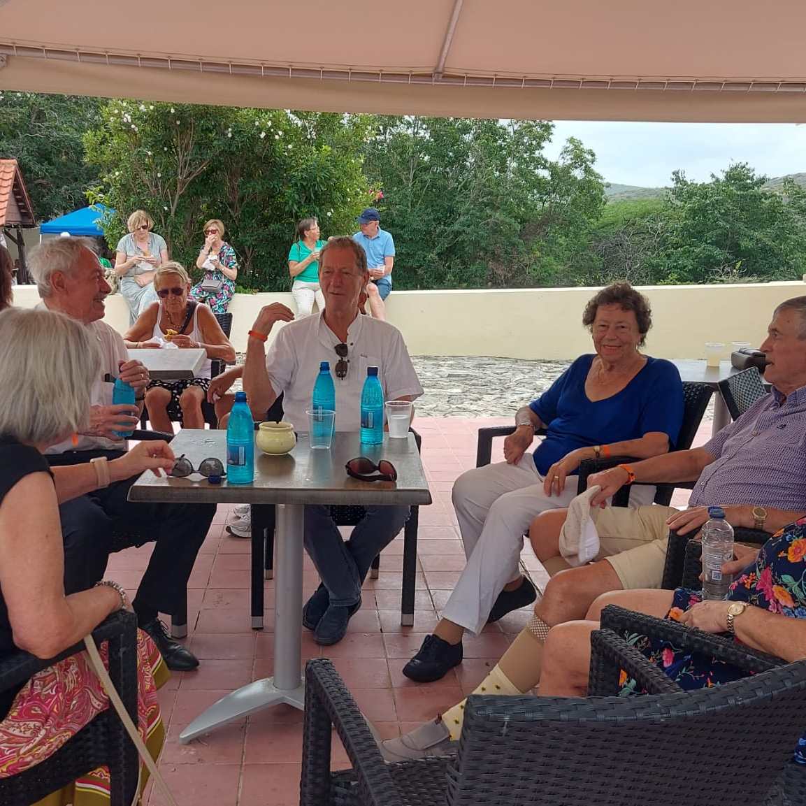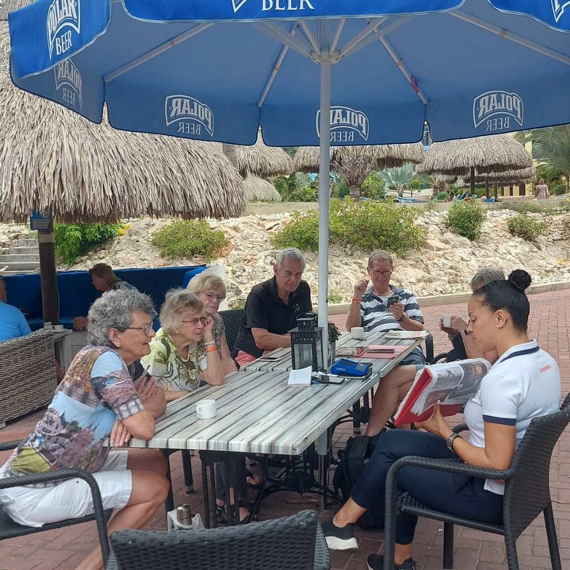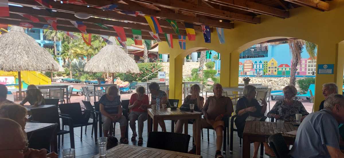 Om 10.00 uur zaten we allemaal te wachten op de Corendon dame. Na een half uur gewacht te hebben zijn we met elkaar naar de Bridgezaal gegaan. Tanja heeft al het een ander over de excursies verteld en Anja over het bridgen. Zaterdag 3 februari gaan we een rondwandeling doen in Otrobanda. Verder is er belangstelling voor de rondtour over het eiland. De mensen die eerder geweest zijn bevelen dat ook aan, aan de groep. De telefoonnummers worden al geappt en dan krijgen de gasten de link van het verslag.