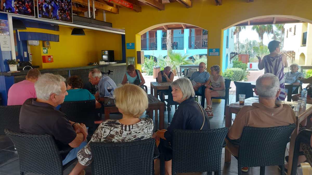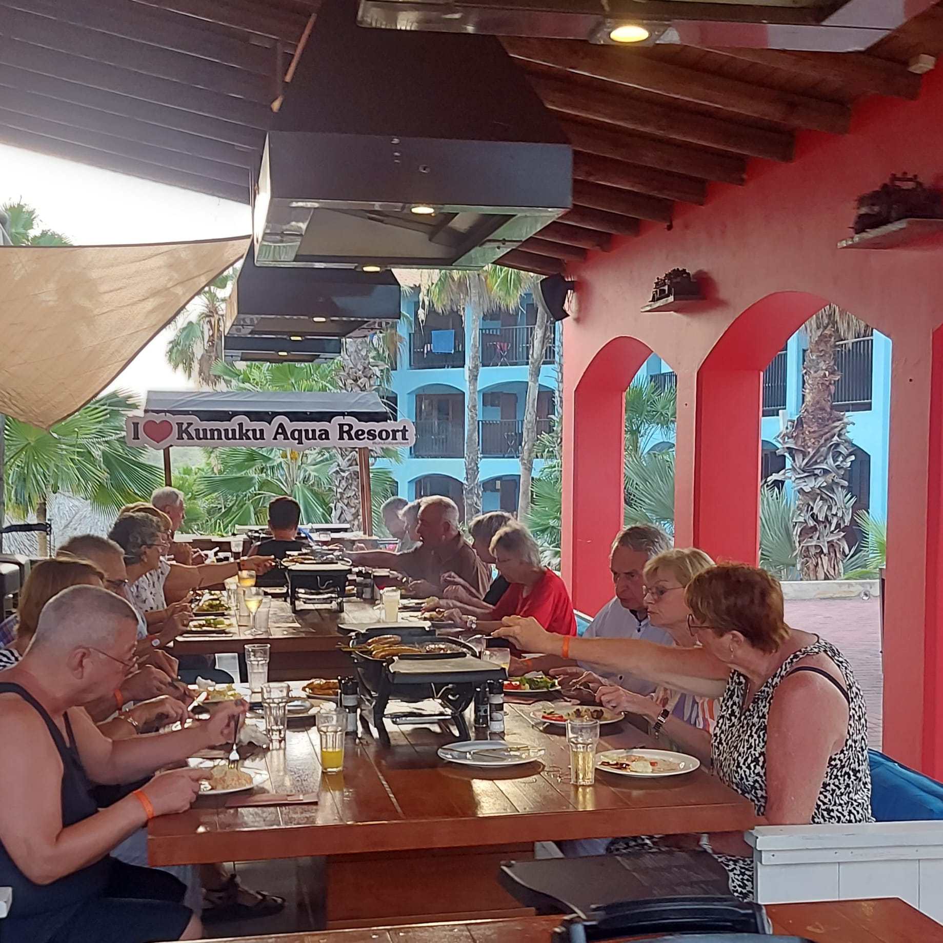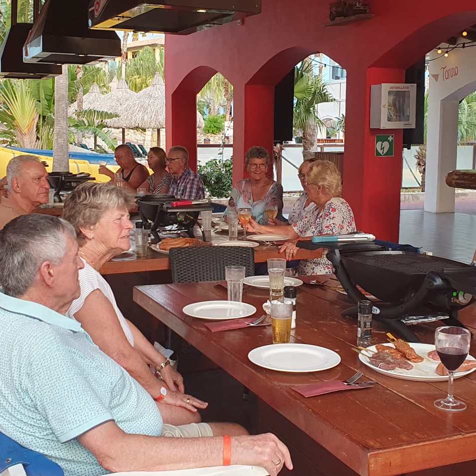 De bus met onze gasten kwam om 21.45 uur het resort op rijden. Altijd weer leuk om bekende gezichten te zien. Ook gasten die elkaar eerder gezien hebben op eerdere reizen hadden gelijk weer een gesprek. Omdat de incheckrij lang was hebben we voorgesteld om eerst even lekker wat te drinken en wat te eten. Daarna verliep het inchecken soepel en kon iedereen naar de kamer of nog een drankje nemen. Want hoe heerlijk is het om ’s avonds laat nog buiten te zitten?