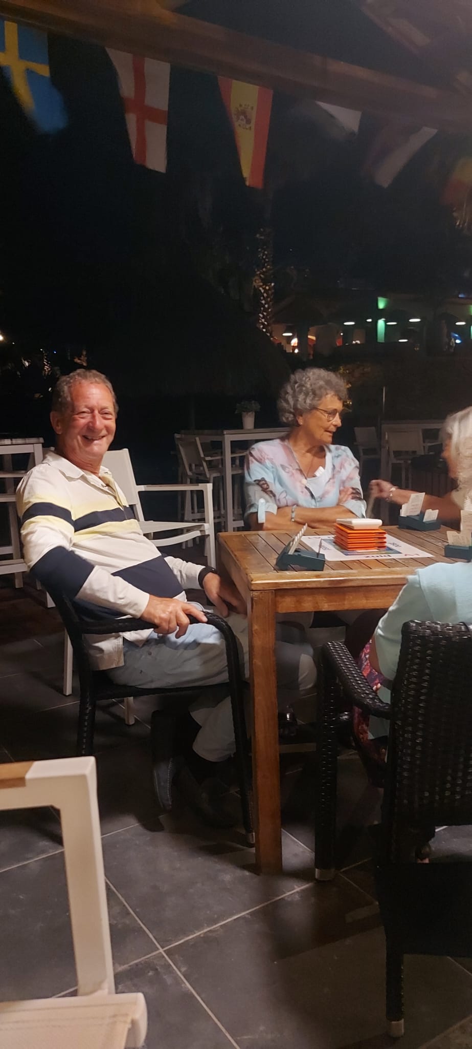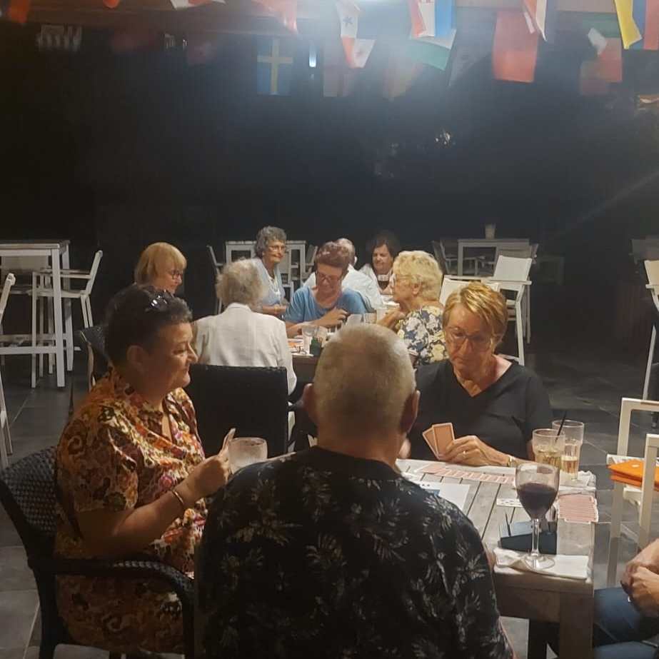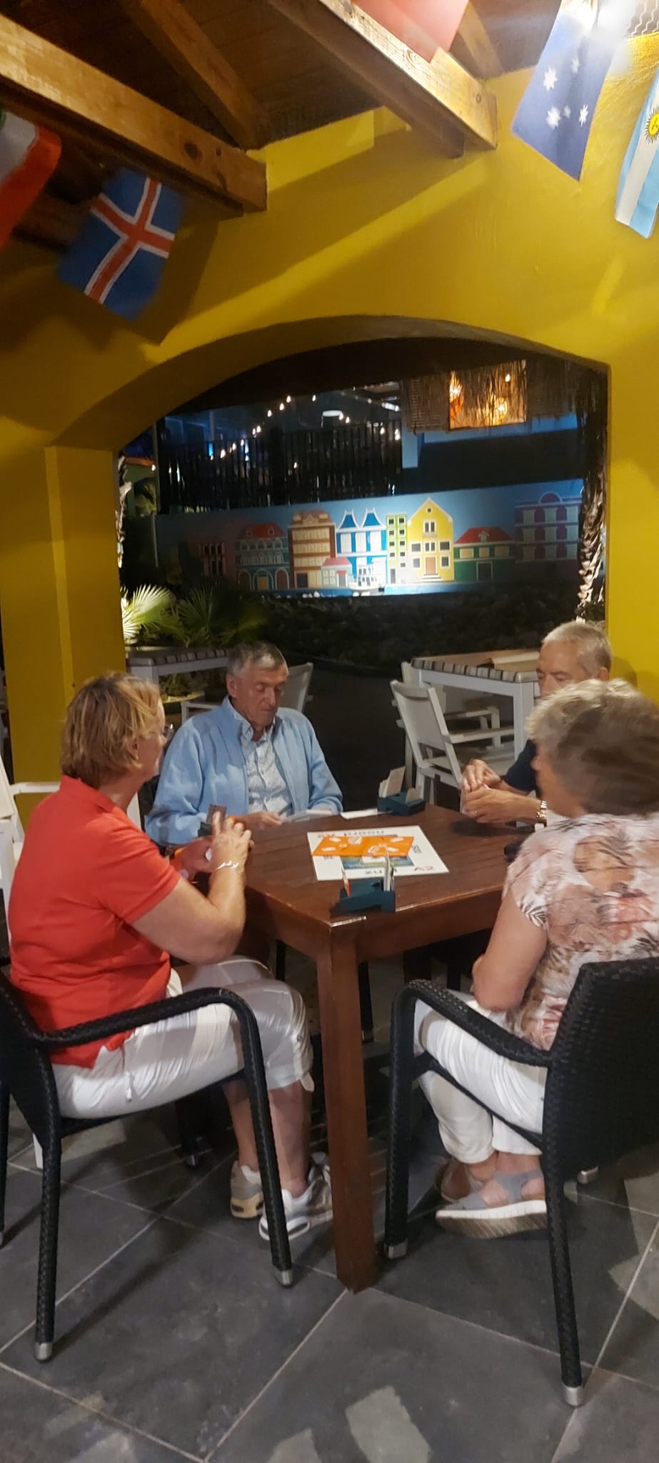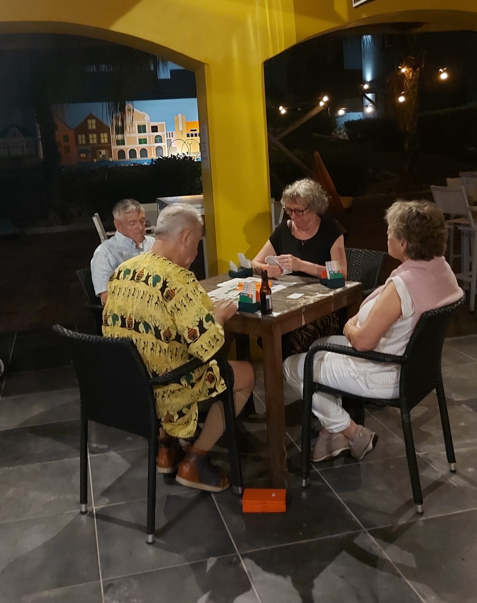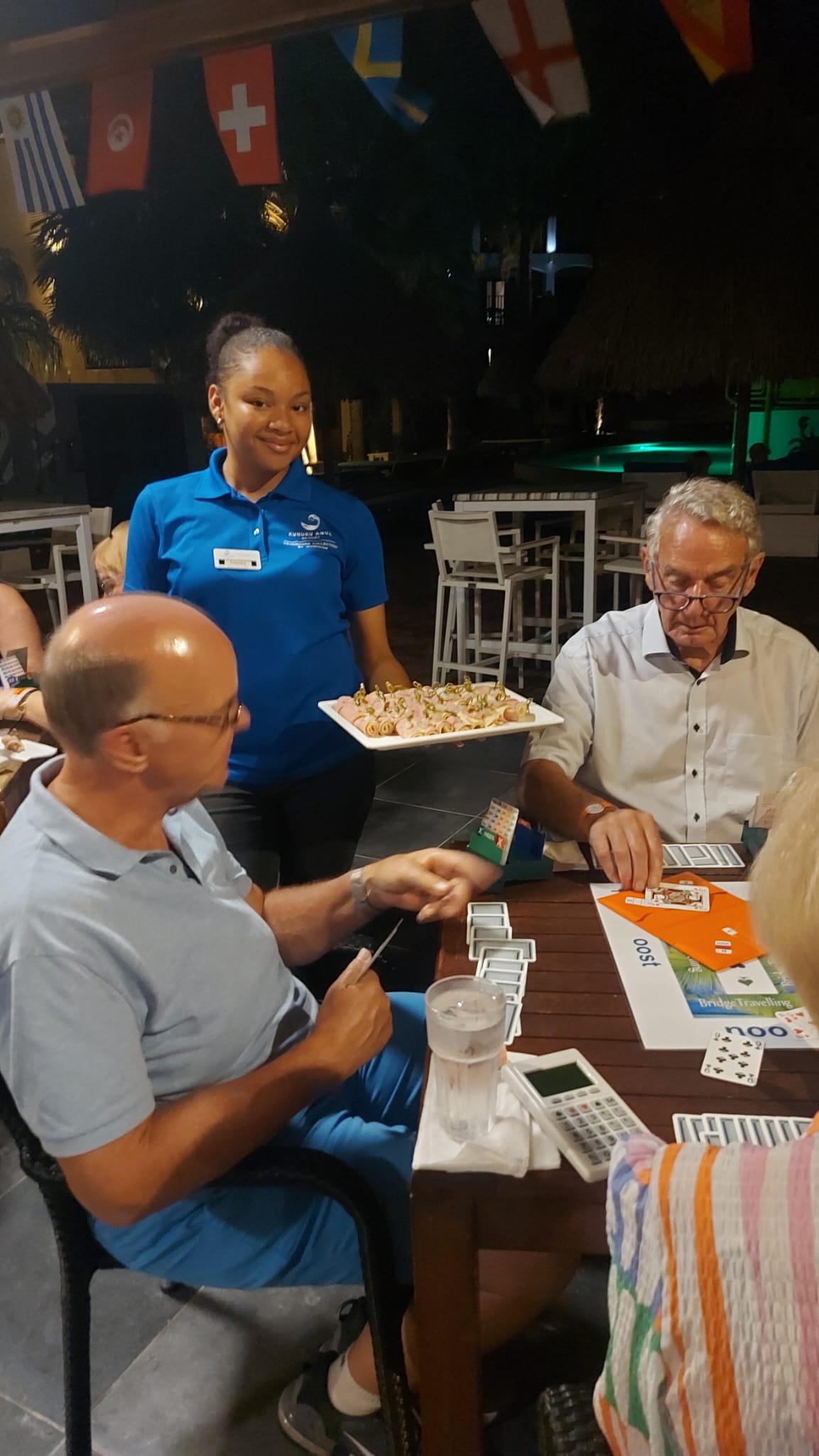 We spelen elke avond bridge in een ruimte met open zijkanten, een heerlijke plek met een zacht briesje en wat geruis van palmbomen. Vanavond wordt er weer een lekker hapje geserveerd. We feliciteren wederom Ellen en Raymond die op de 1e plek zijn geëindigd. Naar de uitslag