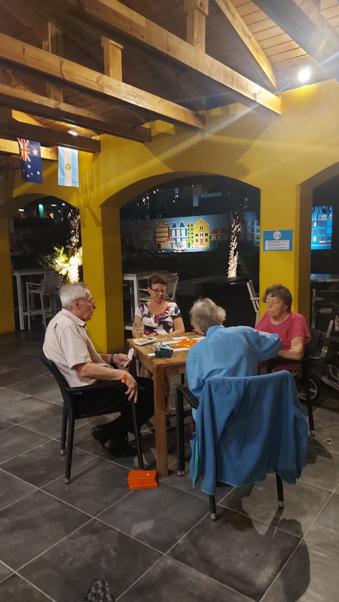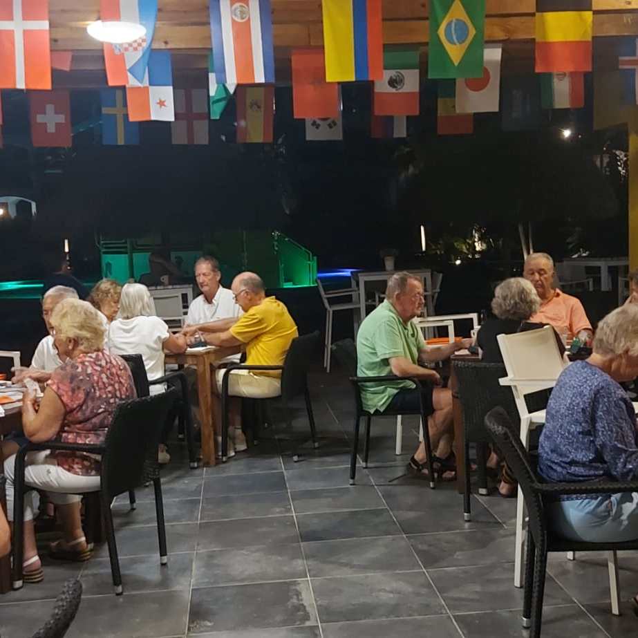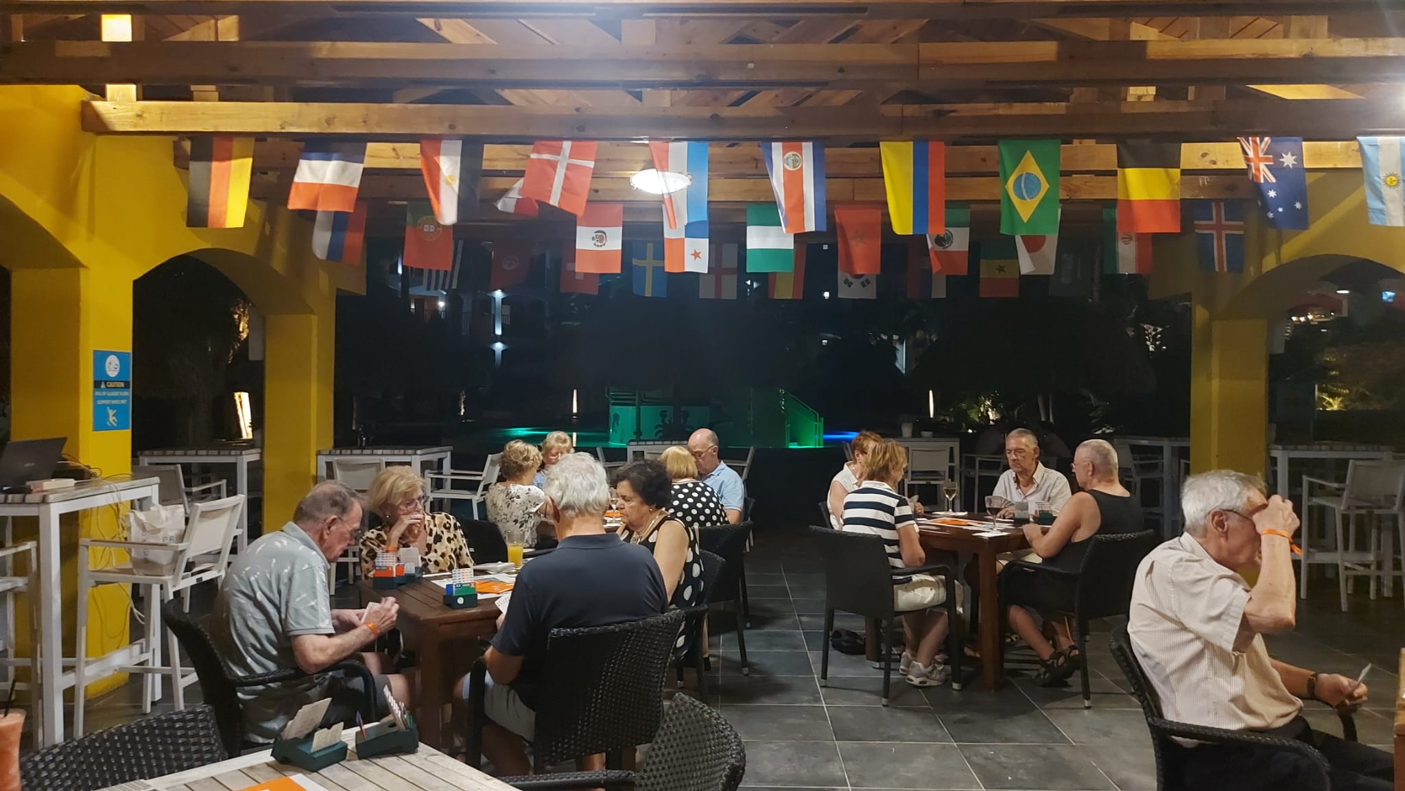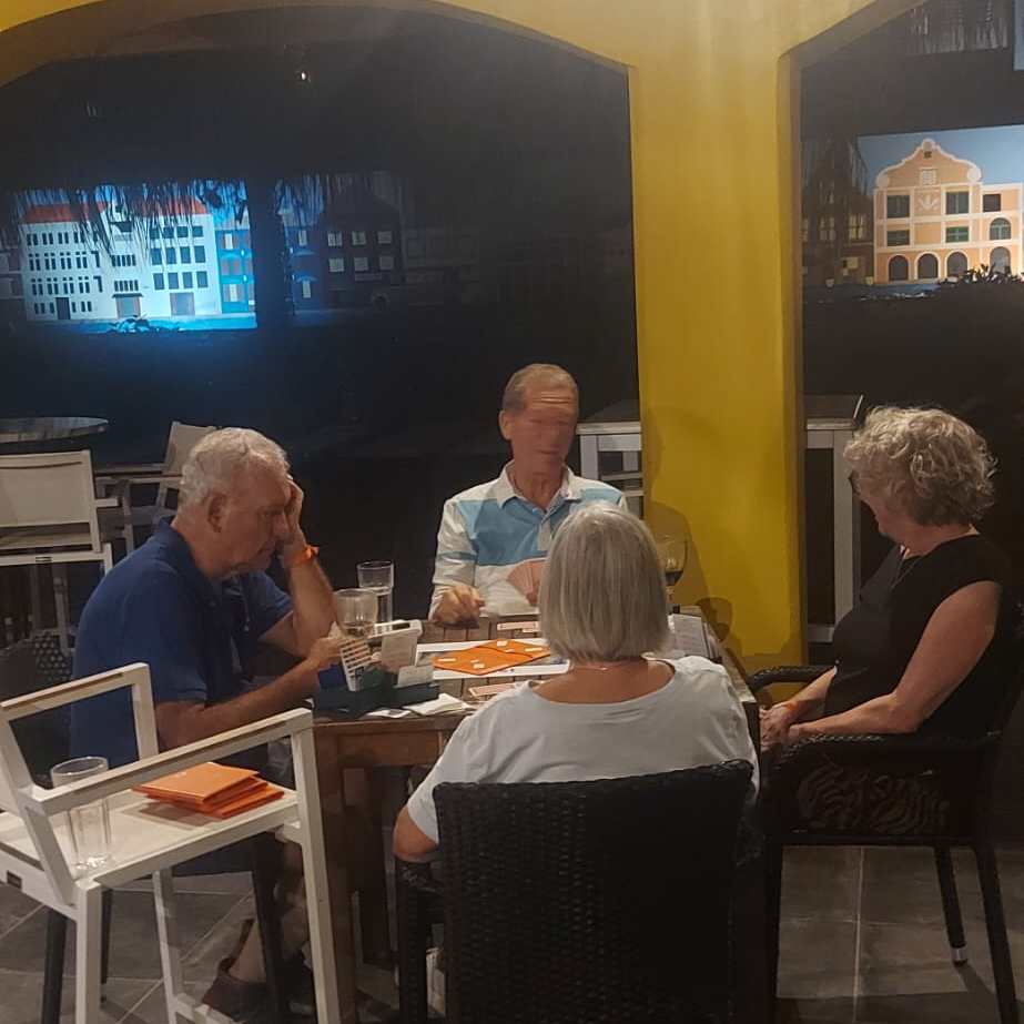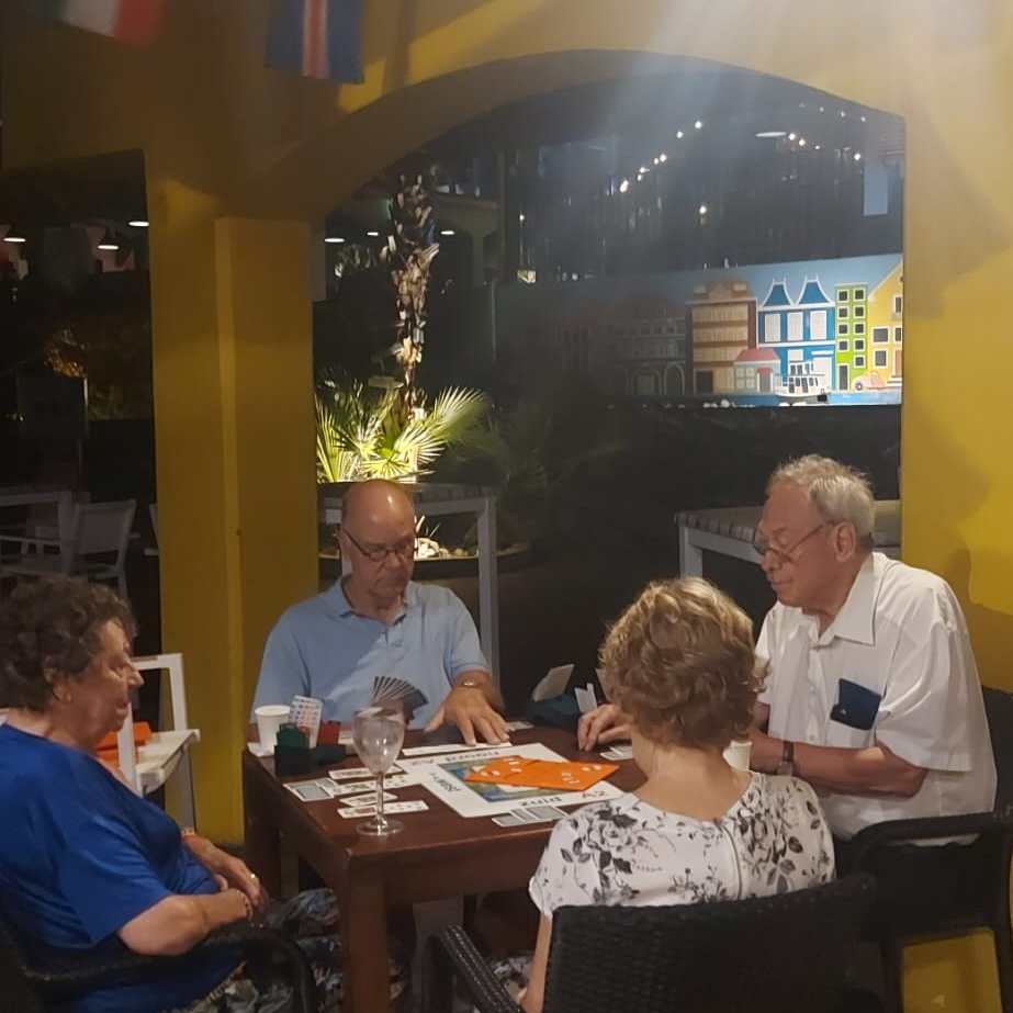 We spelen elke avond bridge in een ruimte met open zijkanten, een heerlijke plek met een zacht briesje en wat geruis van palmbomen. Vanavond wordt er weer een lekker hapje geserveerd. We feliciteren wederom Ellen en Raymond die op de 1e plek zijn geëindigd. Naar de uitslag