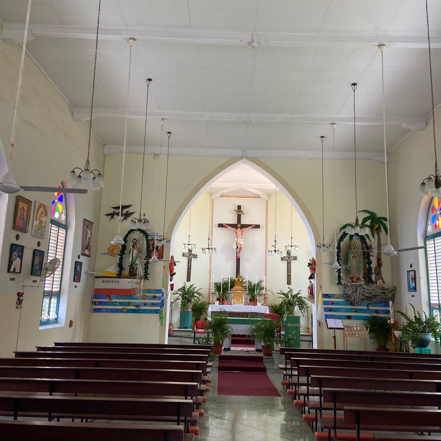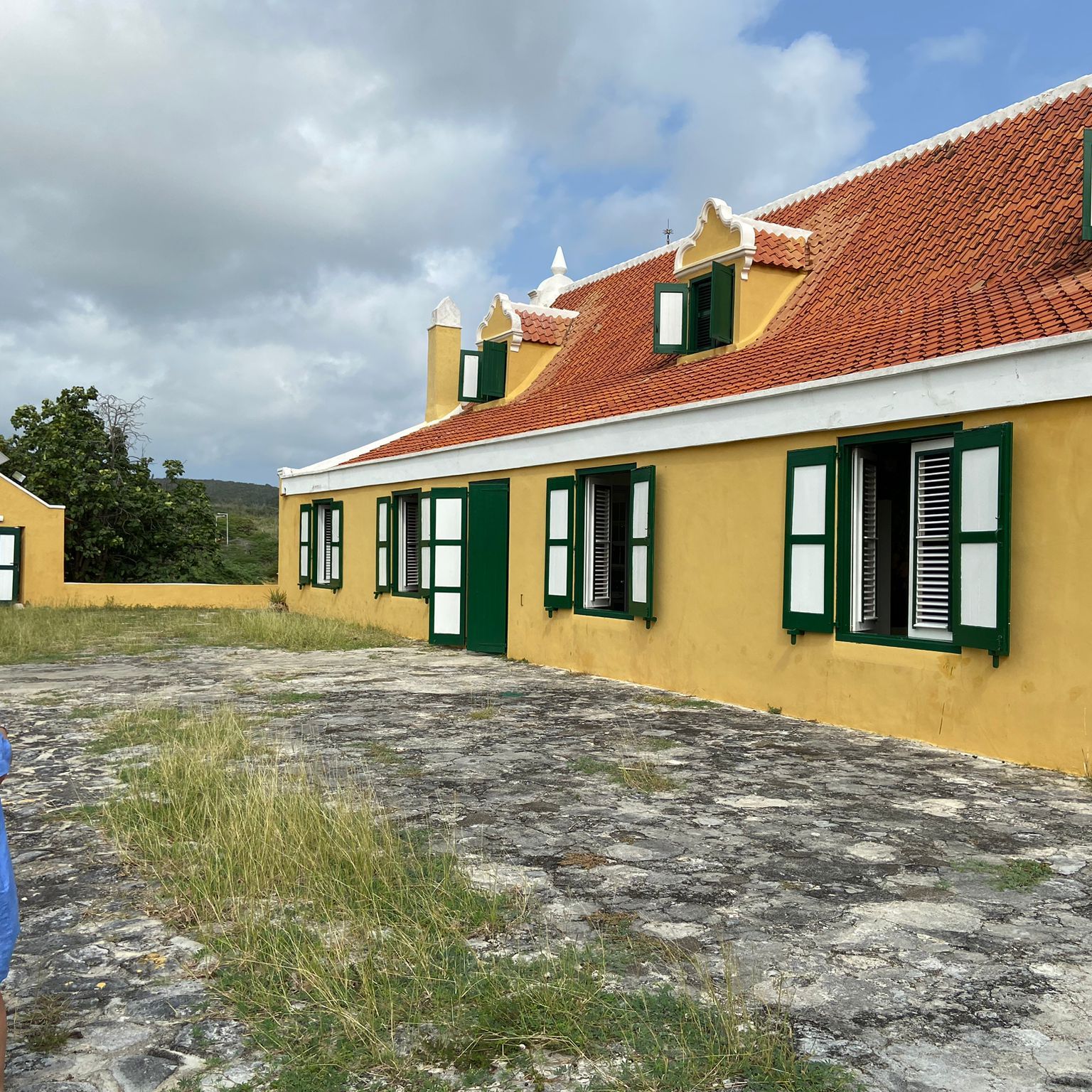 We gaan met een 12-tal en 3 auto’s op pad. Als eerste rijden we naar Landhuis Ascencion. Het uit 1672 daterende plantagehuis is één van de mooist gerestaureerde en gemeubileerde Landhuizen van Curaçao. Elke eerste zondag van de maand komen daar kunstenaars bij elkaar om wat te verkopen. Tevens is er een live band en kan er gedronken en gegeten worden. Naast het landhuis bevindt zich tevens een kerk waar een mis gehouden zou worden.