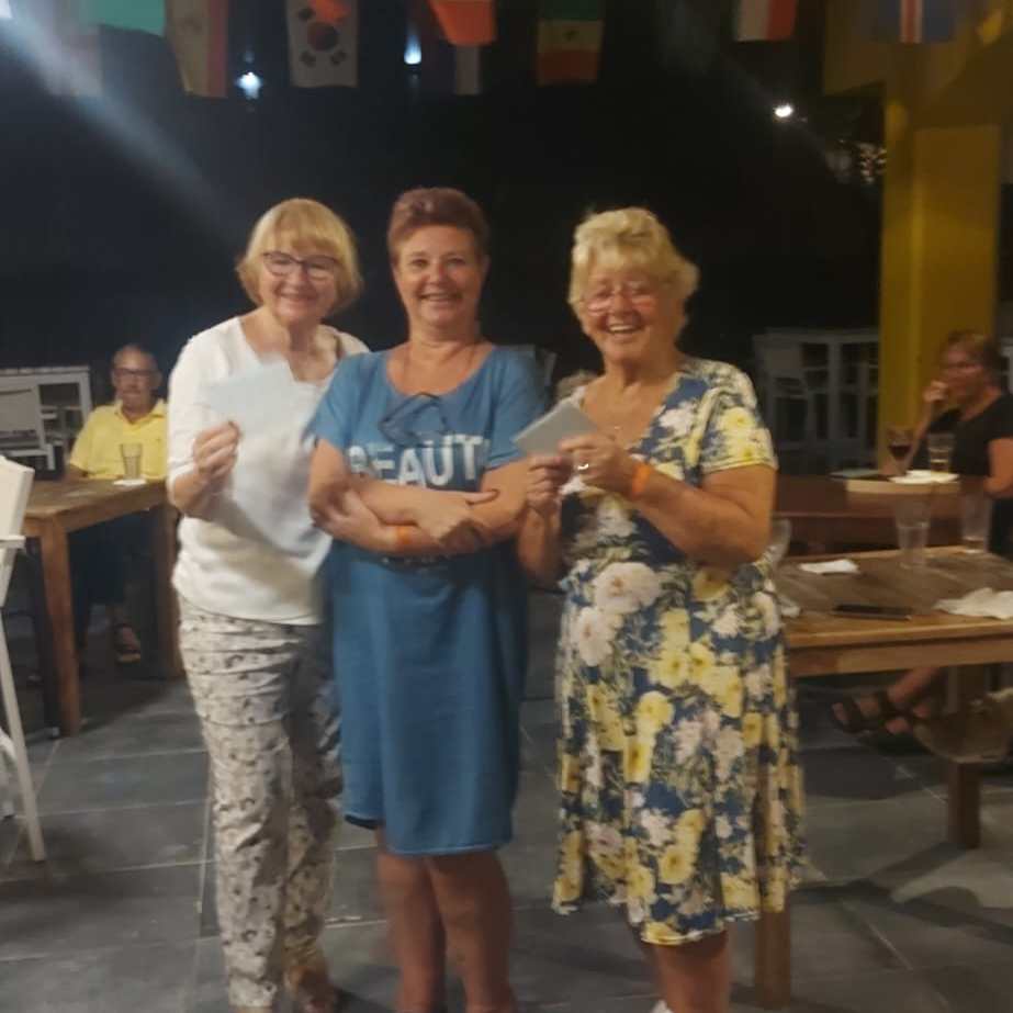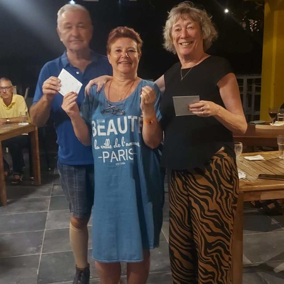 Anja maakt de einduitslag bekend. Onder applaus worden de winnaars gefeliciteerd. Op de eerste plaats Ellen en Raymond met 62,39%, op de tweede plaats Francisca en Jacques met 61,29% en op de derde plaats zijn geëindigd Nel en Fieke met 55,70%. Van harte allemaal! Naar de uitslag