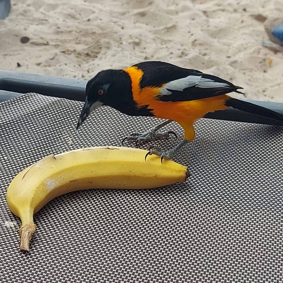 De lokale bus kwam mooi op tijd zodat we al om 11.30 uur op Grote Knip aankwamen. Een mooi strand met ook prachtige, brutale vogeltjes. Leg een banaan op je strandbedje die wordt gewoon open gepikt en opgegeten. Ook loopt er een varken rond, die probeert in tassen wat eetbaars te vinden.
