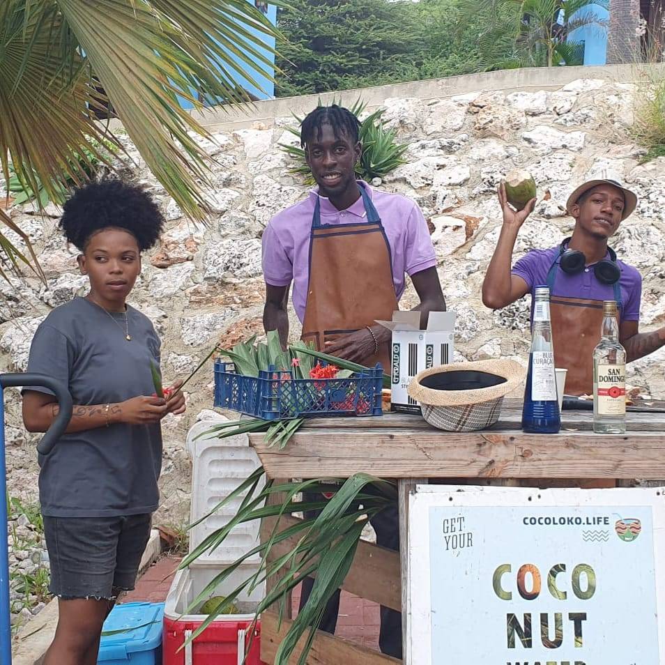 Jarenlang verbleef de flamingo in de buurt van St. Willibrordus. Daar is momenteel te weinig water en daardoor te weinig te eten. Deze inheemse vogels zijn in grote getalen verhuisd naar Bullebaai. Op ons resort stonden 3 jongelui kokosnotenmelk te serveren. Vers en de keuze was puur of met alcohol.