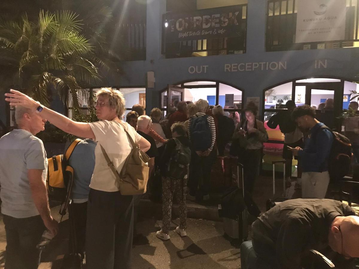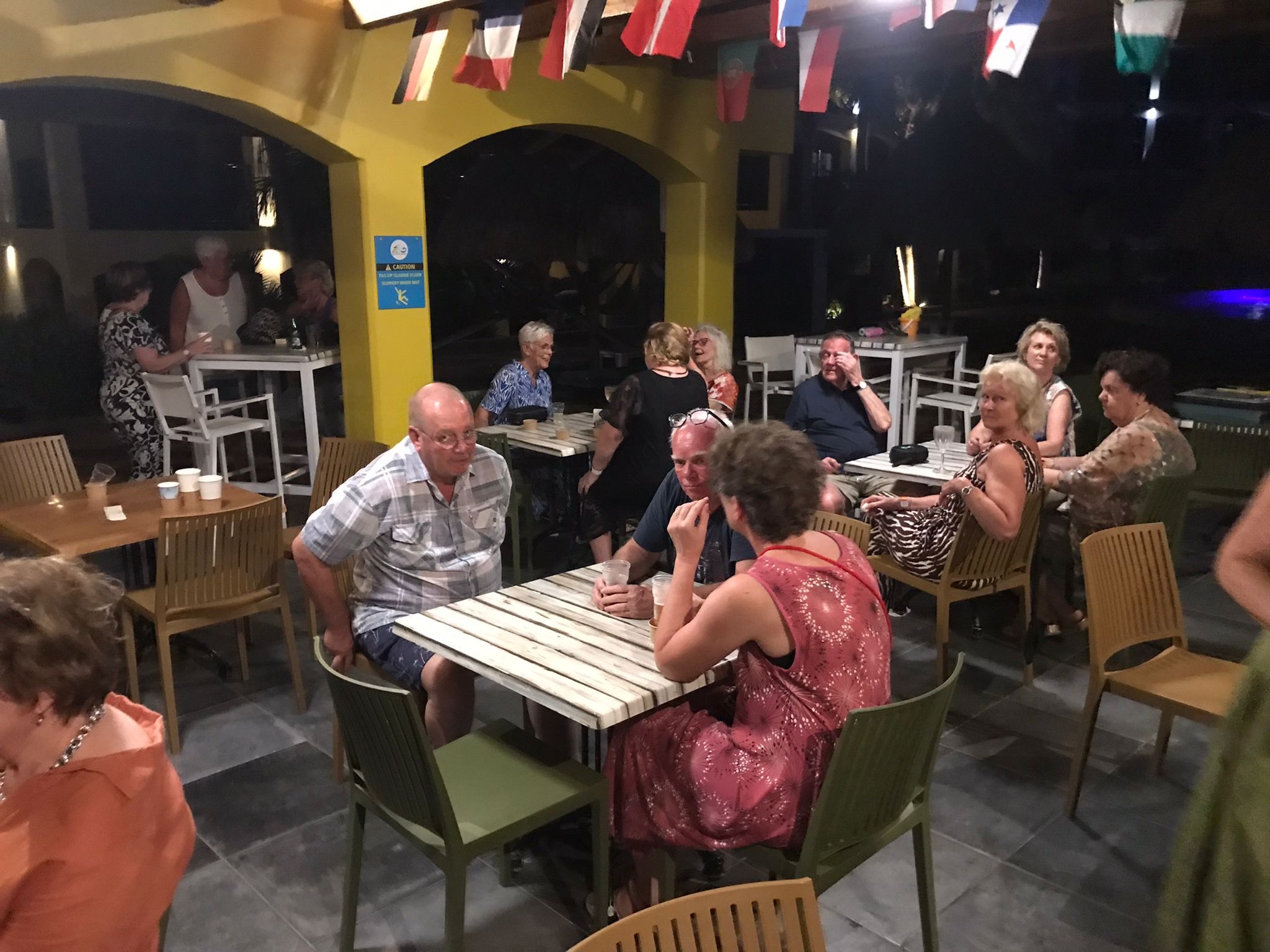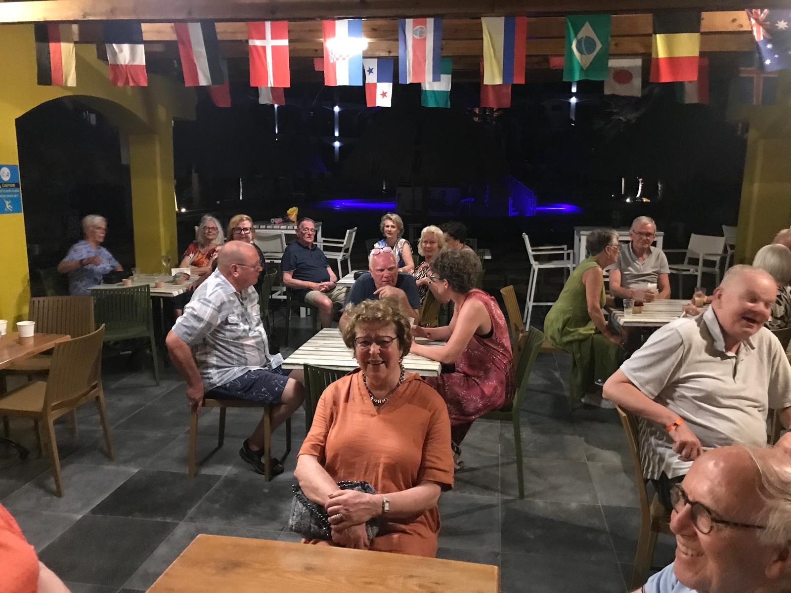 Na een enorme vertraging op Hato vanwege de aankomst van vier vluchten bijna gelijktijdig waren de gasten rond 21.00 uur op het resort. De receptie en ik hadden een splitsing van bridgers en niet bridgers verzonnen omdat ik de bridgers op de app en vanavond info kon geven waardoor de incheck ietsjes sneller kon. Dat heeft nog ruim voor de hele groep een uur gekost. Er was een mini buffetje gemaakt wat brood met beleg en fruit. Verder hebben we nog gezellig met ruim de helft van de groep zitten borrelen tot 23.00 uur.