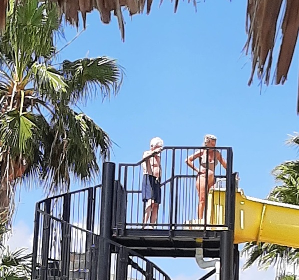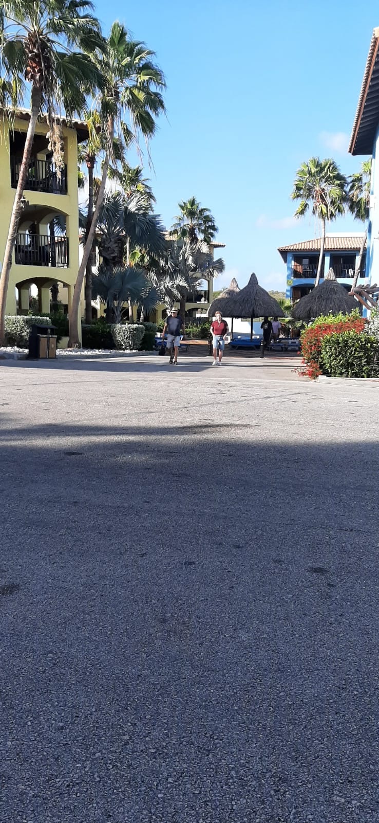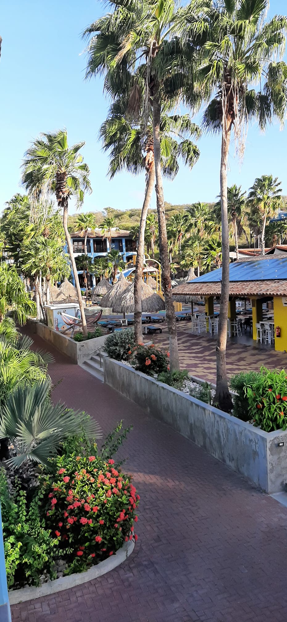 Na het ontbijt vertrekken veel gasten met de shuttle naar Willemstad. We zien ook gasten vertrekken naar het strand van Piratebay en Boka Pistol, een natuurverschijnsel (zie video verder). Het is warm en drukkend, vannacht is een flinke bui gevallen. Voorspellingen zijn dat er veel dagtoeristen vandaag op het Resort zijn voor de glijbanen.