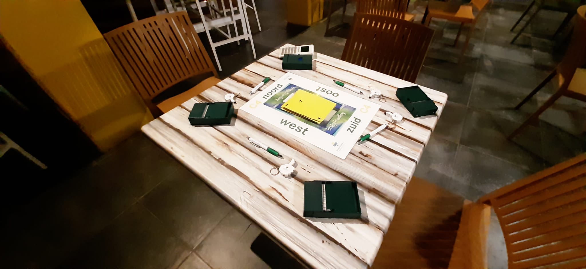 We hebben een drukke eerste bridgeavond achter de rug. Op iedere tafel lag een welkomstcadeautje klaar, wat meteen zorgde voor veel hilariteit. De handige sleutelhouder viel bijzonder in de smaak: een duim omhoog wanneer partner het goed deed, en het lampje aan als er nog even over de bieding nagedacht moest worden. 😀