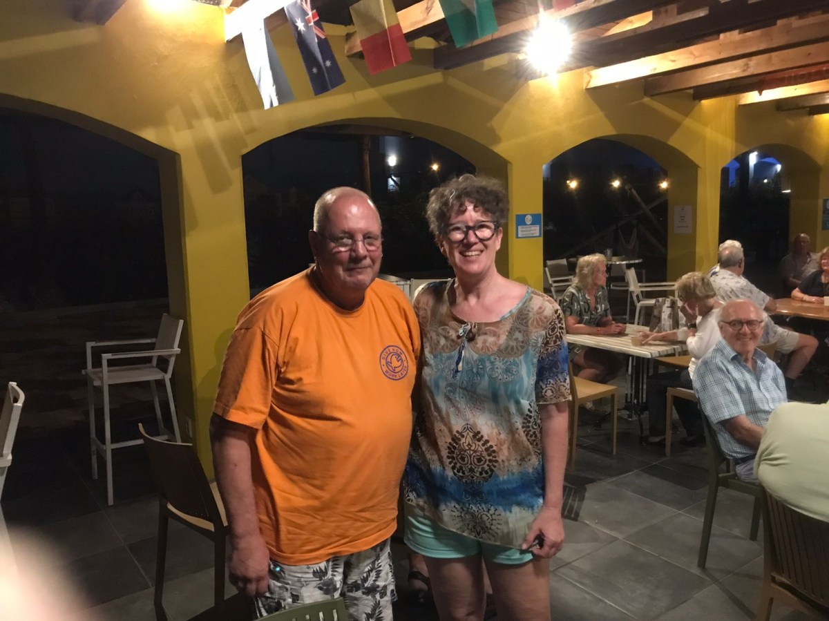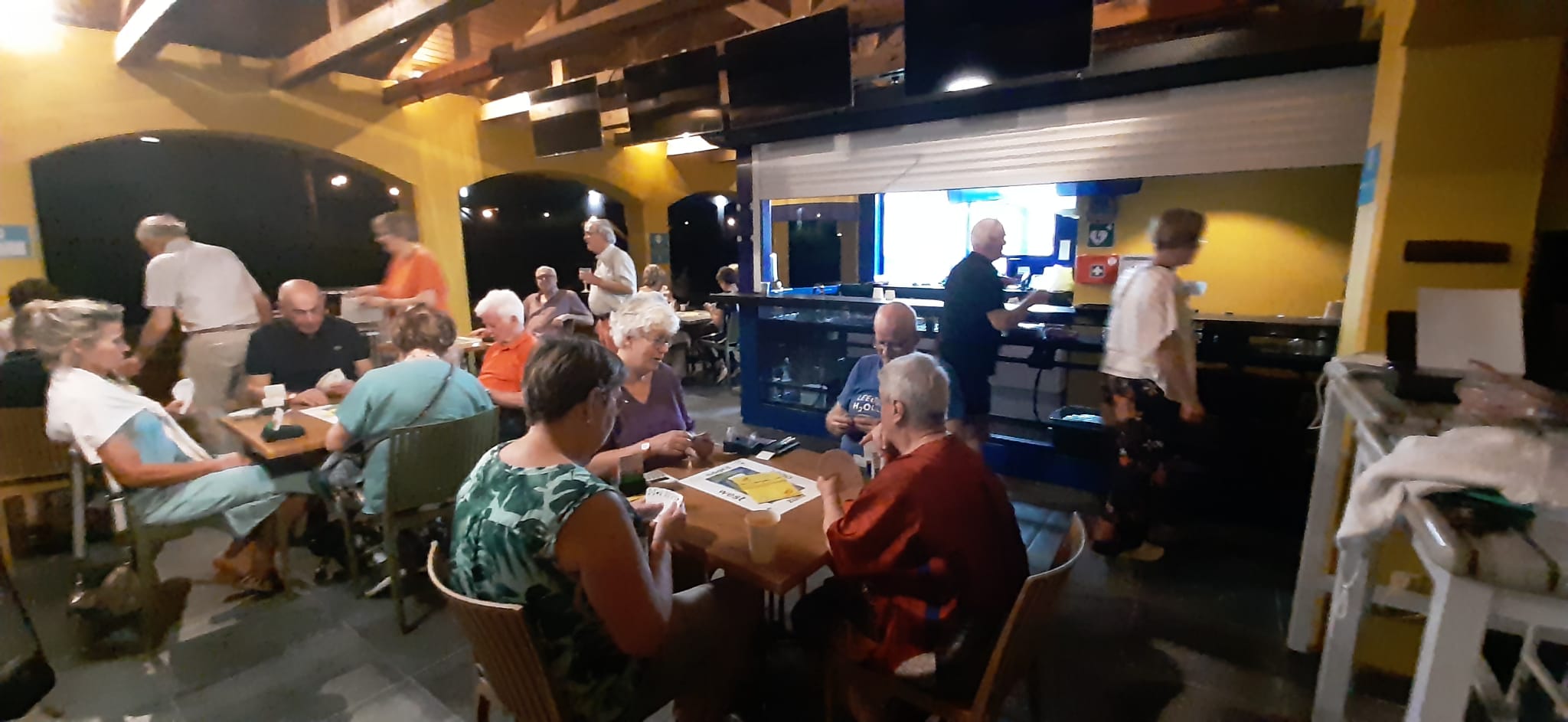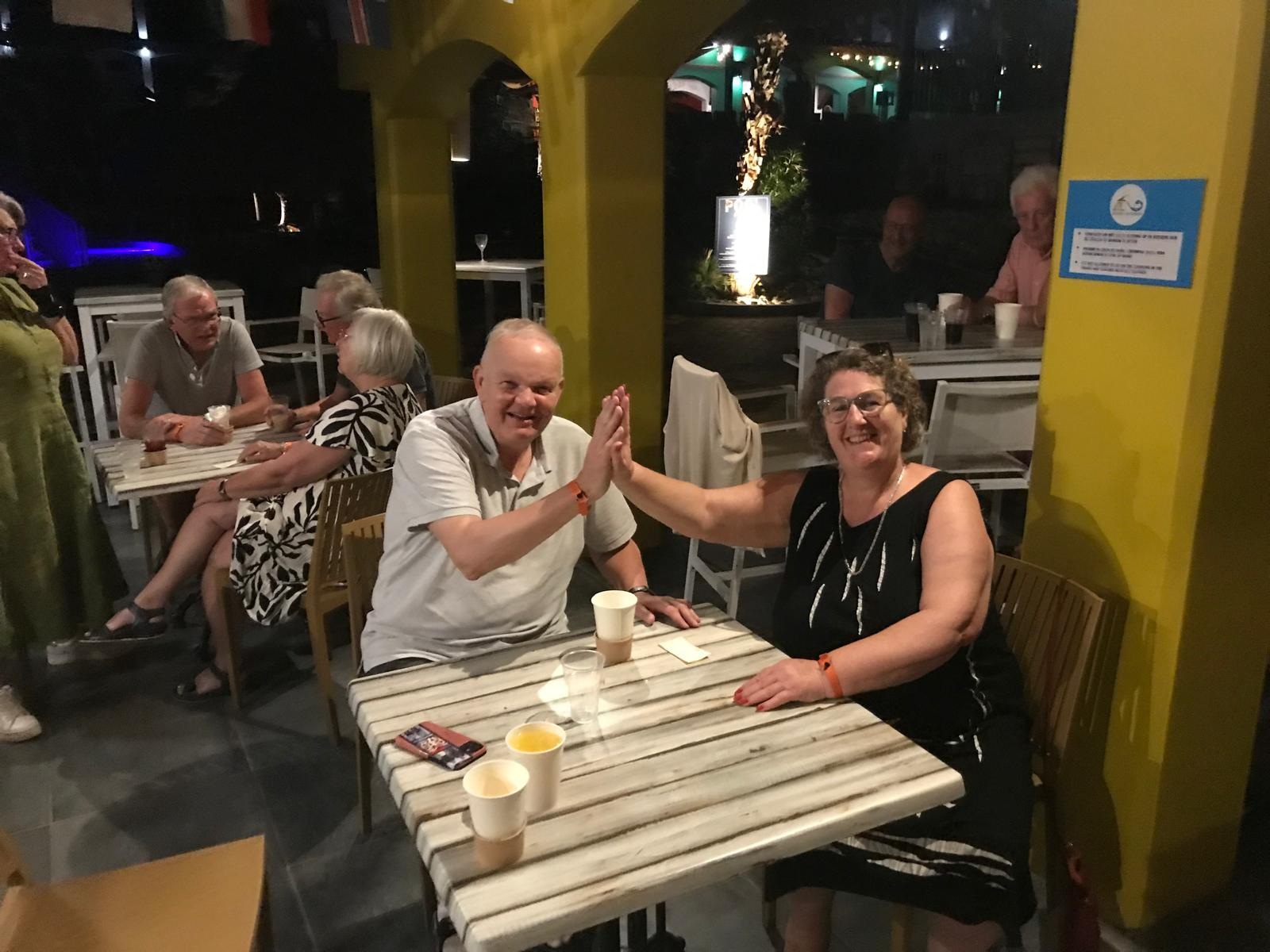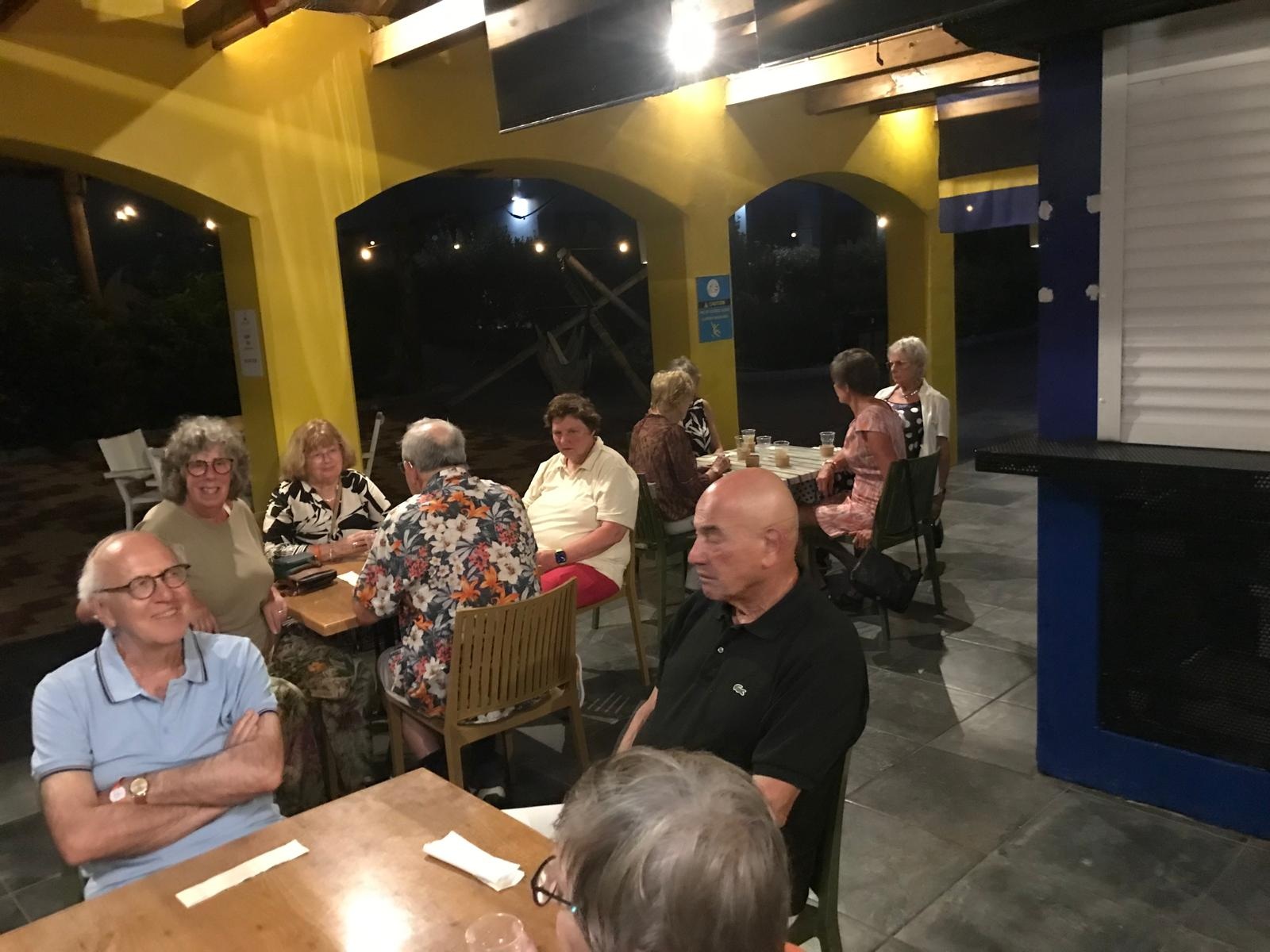 We beschikten over onze eigen bar tot 22.00 uur; daarna maakten we een klein wandelingetje naar de volgende bar. Het was even wennen aan elkaar, aan het heerlijke buiten bridgen én voor sommigen ook aan hun nieuwe bridgepartner. Omdat drie paren deze avond afwezig waren, speelden wij, Marcel en Caroline mee. Wij wisten deze zitting winnend af te sluiten. We kregen felicitaties van de groep. Naar de uitslag.