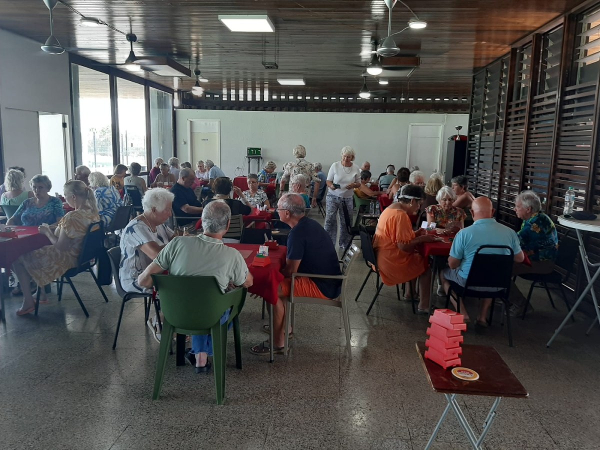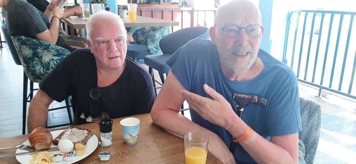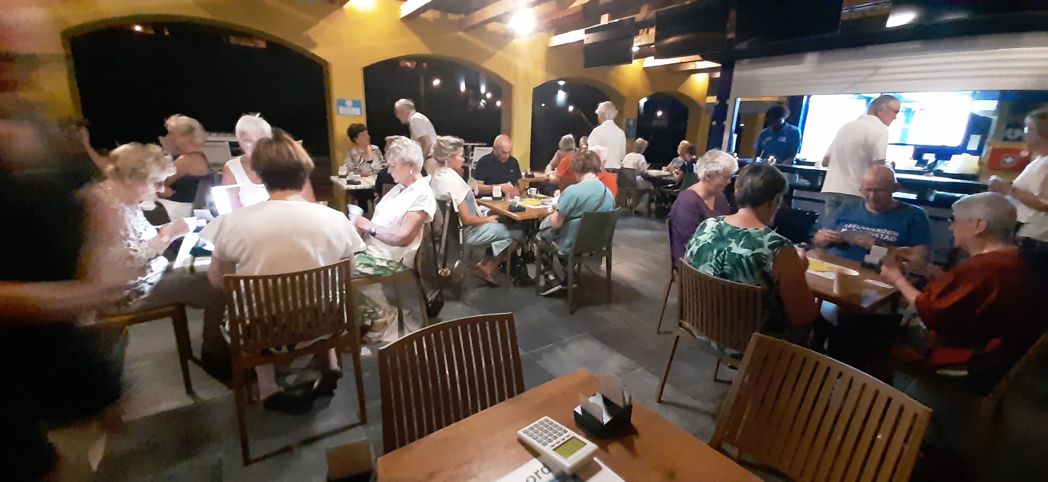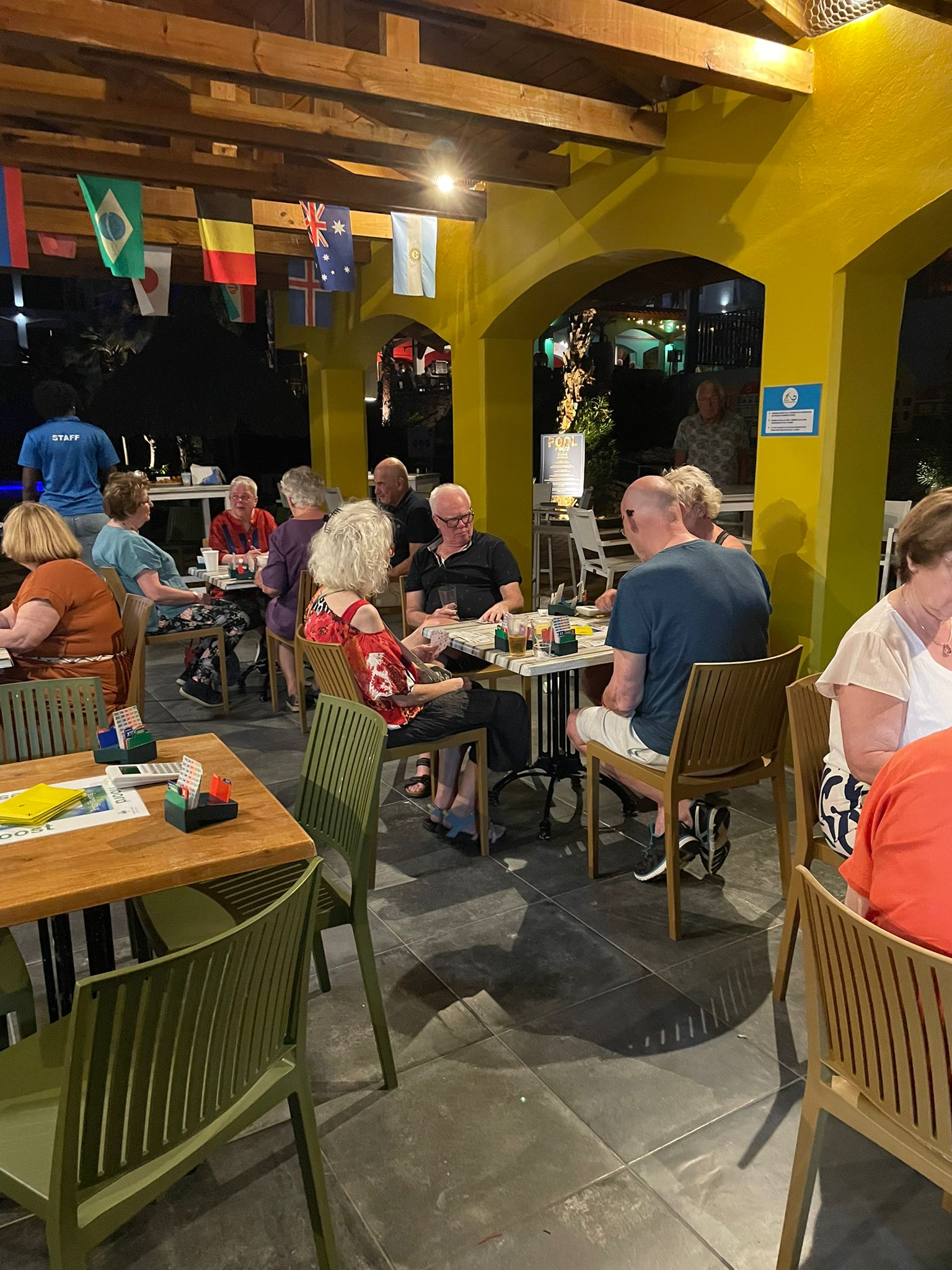 We beschikten over onze eigen bar tot 22.00 uur; daarna maakten we een klein wandelingetje naar de volgende bar. Het was even wennen aan elkaar, aan het heerlijke buiten bridgen én voor sommigen ook aan hun nieuwe bridgepartner. Omdat drie paren deze avond afwezig waren, speelden wij, Marcel en Caroline mee. Wij wisten deze zitting winnend af te sluiten. We kregen felicitaties van de groep. Naar de uitslag.