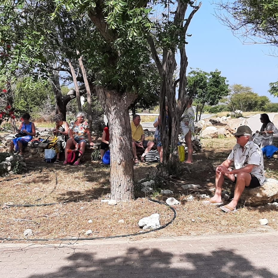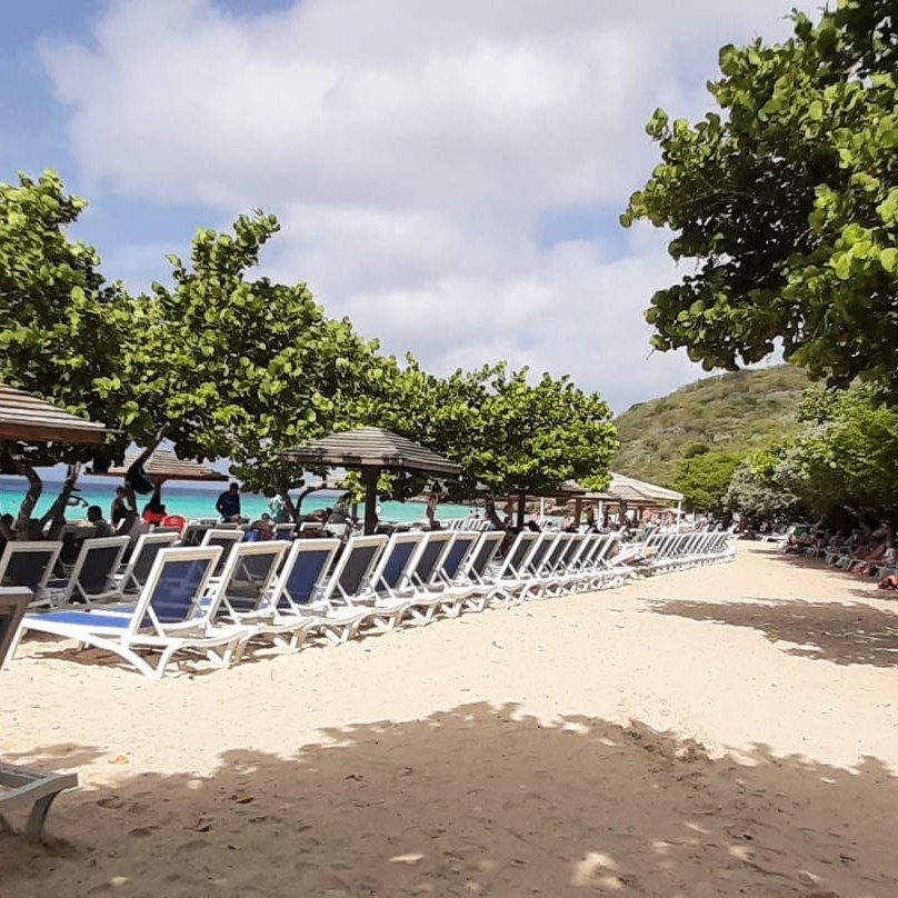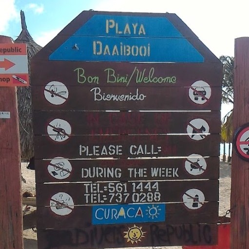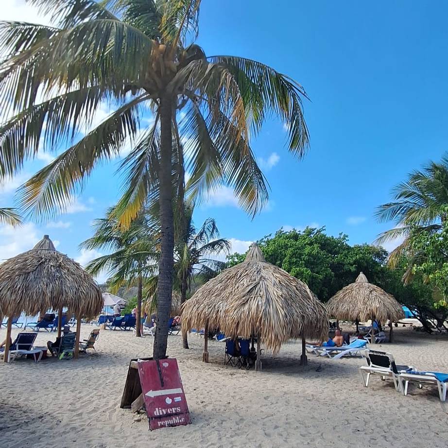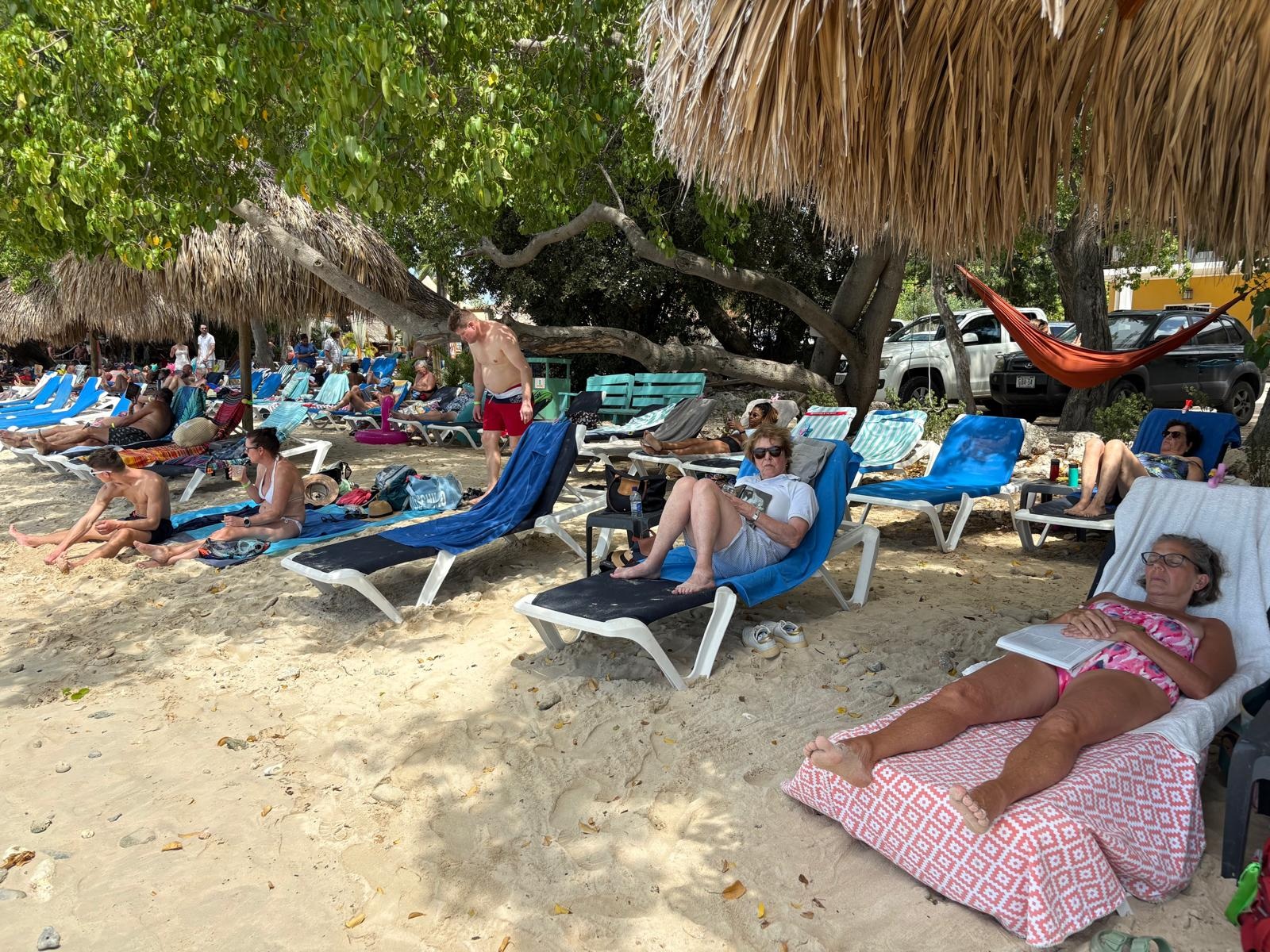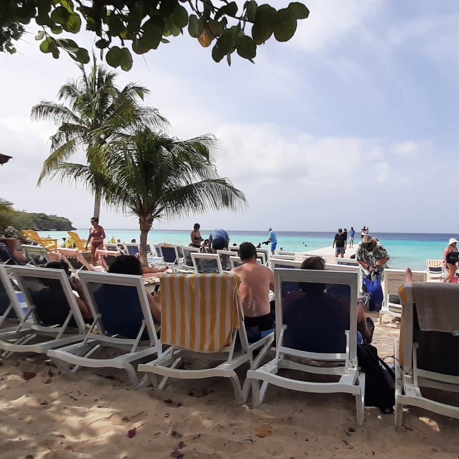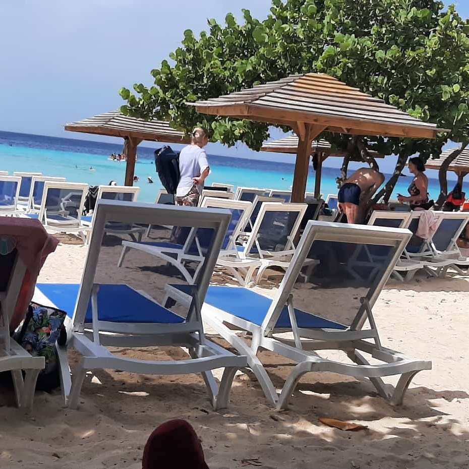 Veel gasten pakten vandaag de Shuttlebus naar Daaibooi strand. Een strand omgeven door kliffen waar je tussen de schildpadden zwemt. De schildpadden mag je niet voeren, doe je dat wel mag je het strand verlaten. Een bedje kost CG 10,- (€ 4,60) maar daar is CG 5,- borg van en je krijgt ook een kopje koffie of wat ranja wanneer je zelf je bedje sjouwt. Bij het terugbrengen krijg je dus ook nog eens CG 5,- terug😁 . Tanja heeft al snorkelend de baai verkend.