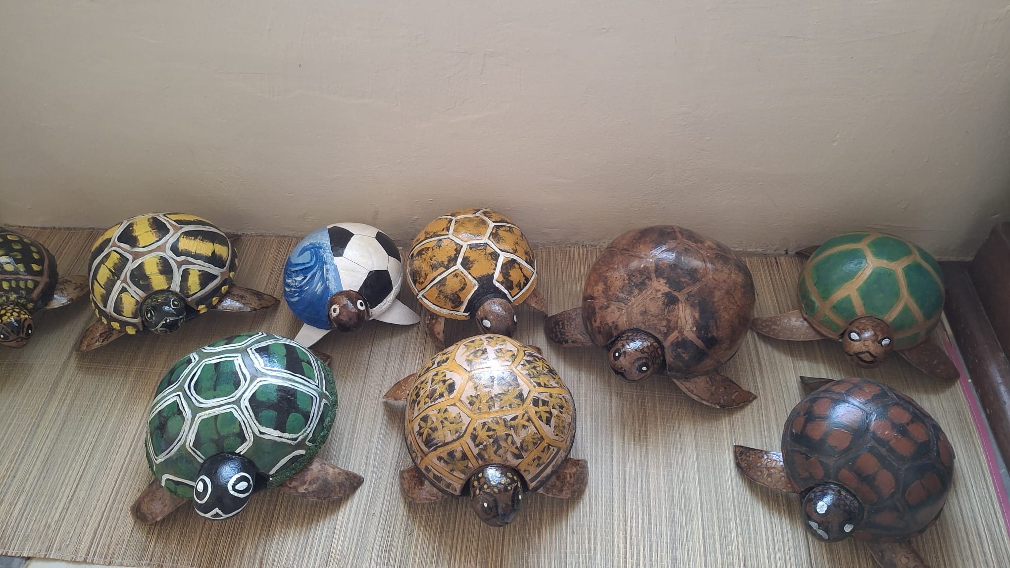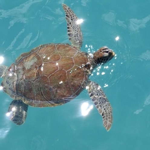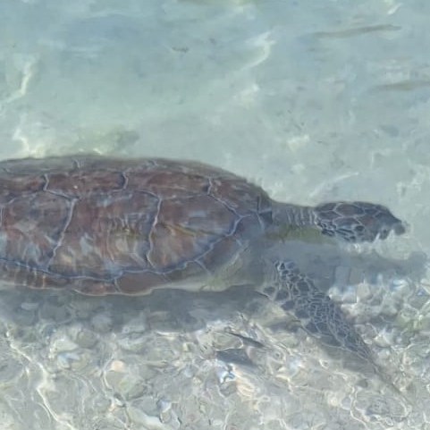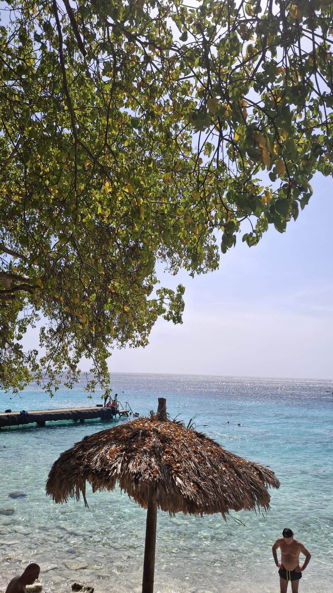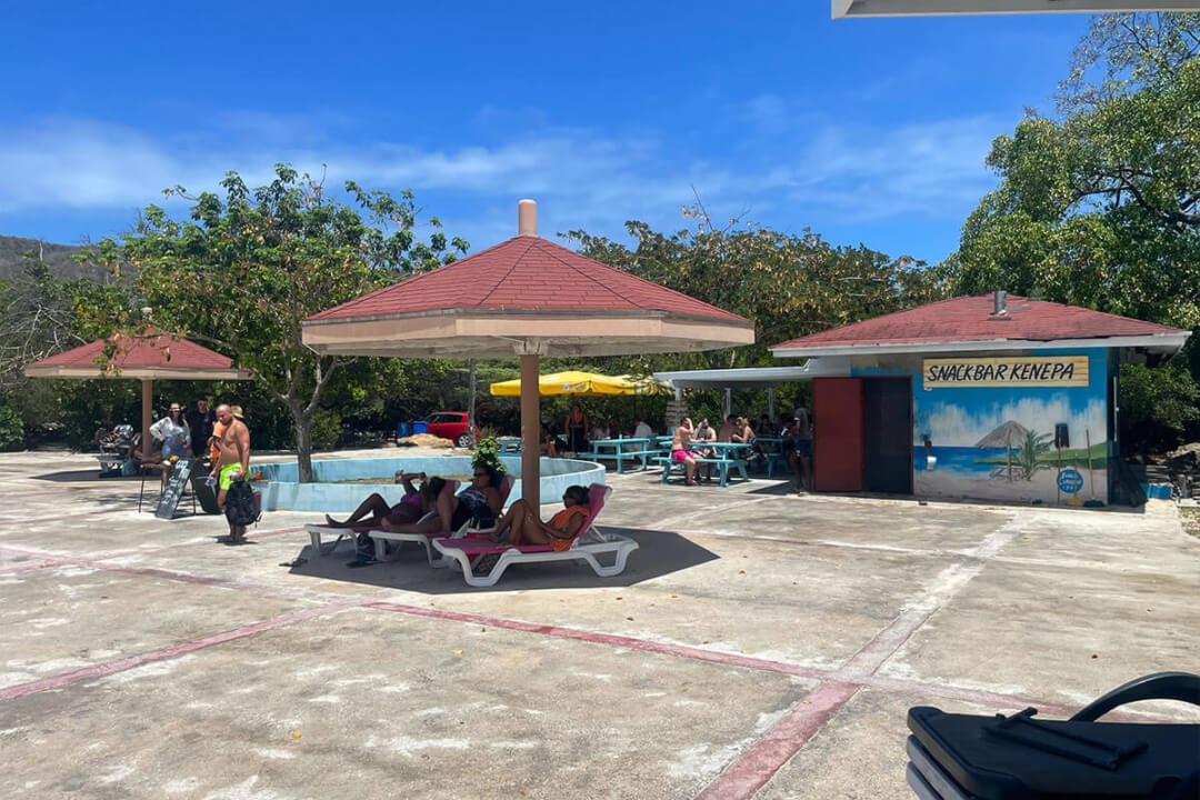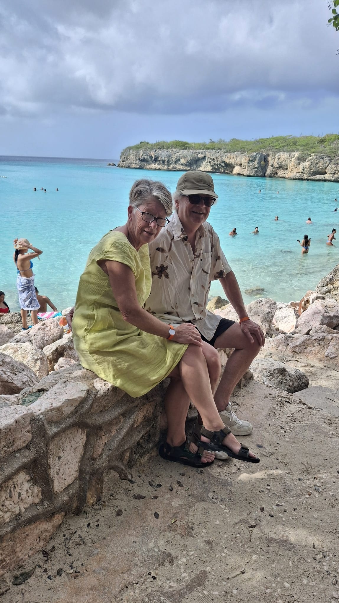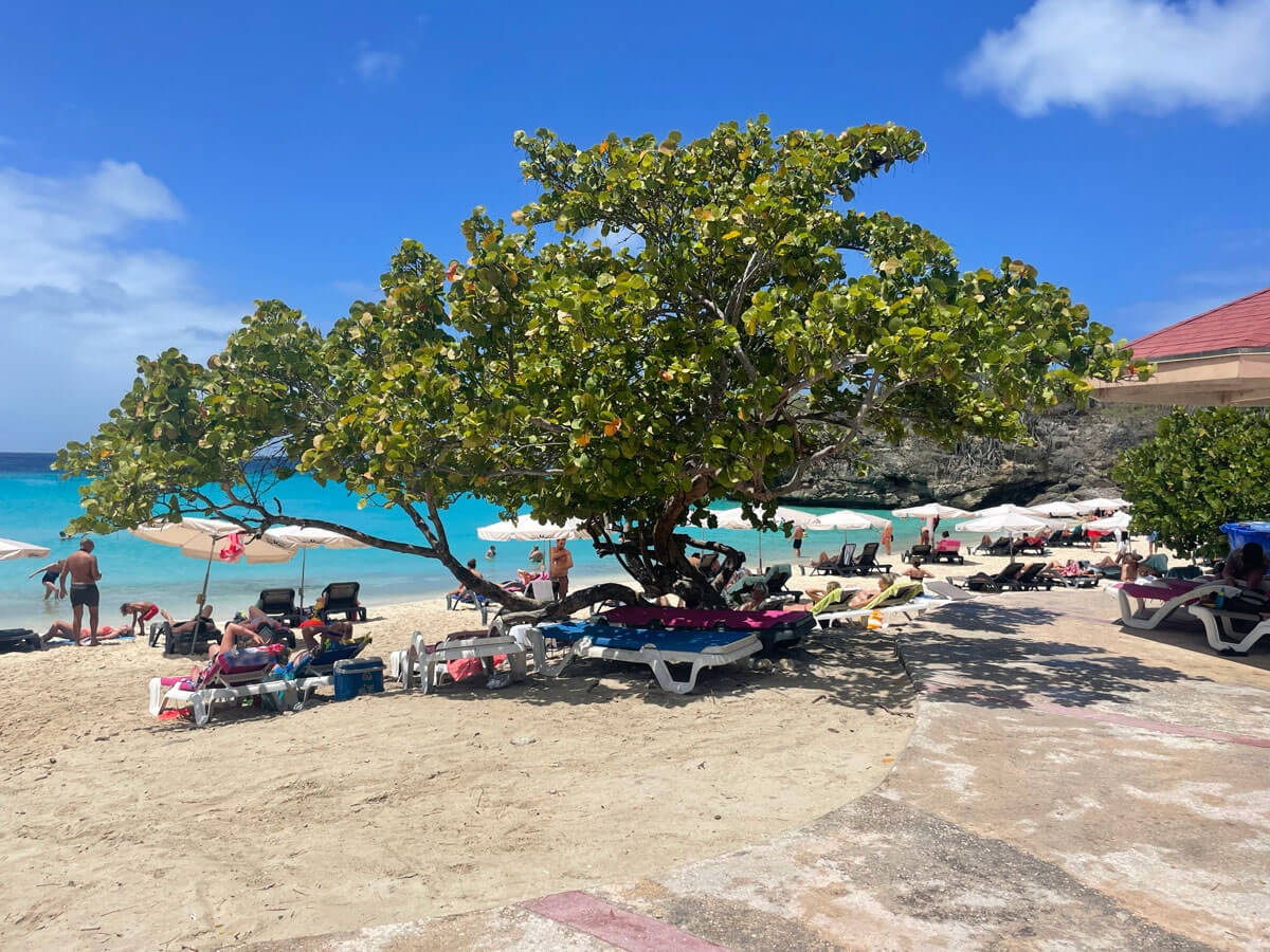Veel gasten pakten vandaag de Shuttlebus naar Daaibooi strand. Een strand omgeven door kliffen waar je tussen de schildpadden zwemt. De schildpadden mag je niet voeren, doe je dat wel mag je het strand verlaten. Een bedje kost CG 10,- (€ 4,60) maar daar is CG 5,- borg van en je krijgt ook een kopje koffie of wat ranja wanneer je zelf je bedje sjouwt. Bij het terugbrengen krijg je dus ook nog eens CG 5,- terug😁 . Tanja heeft al snorkelend de baai verkend.