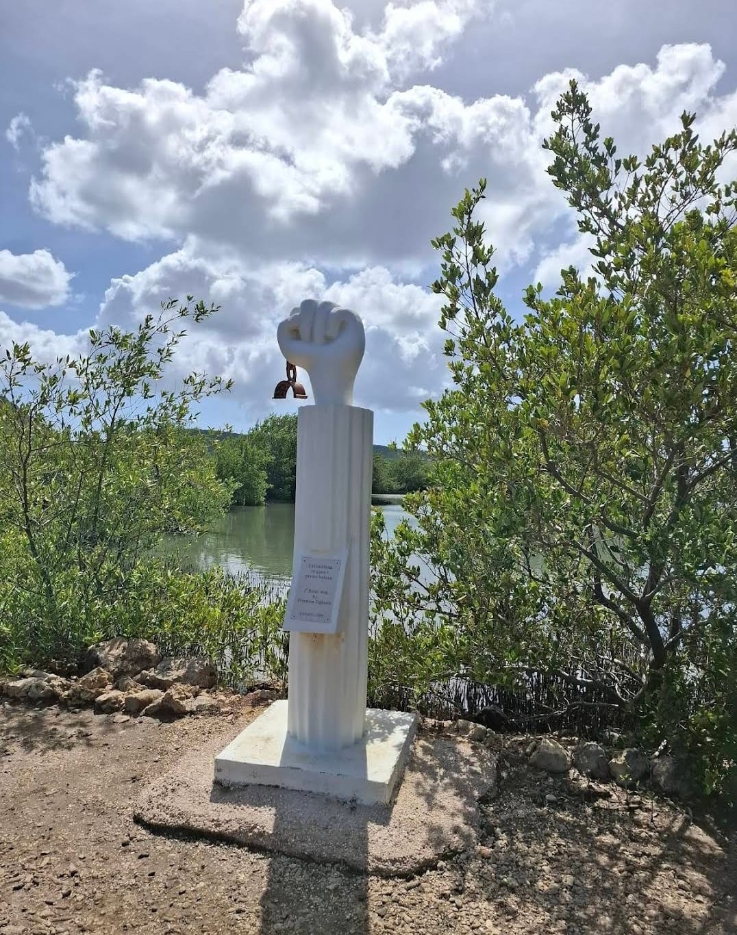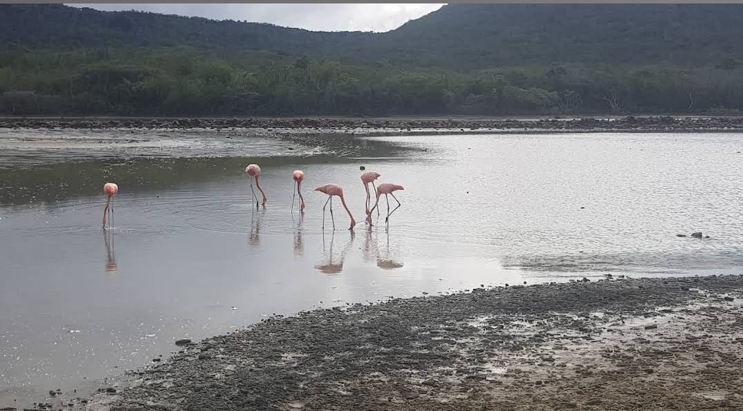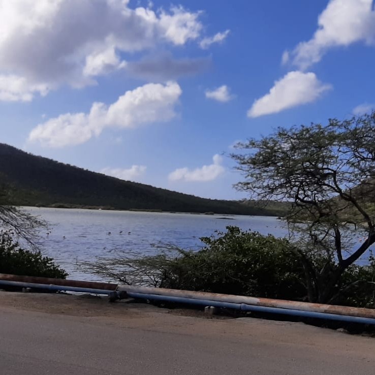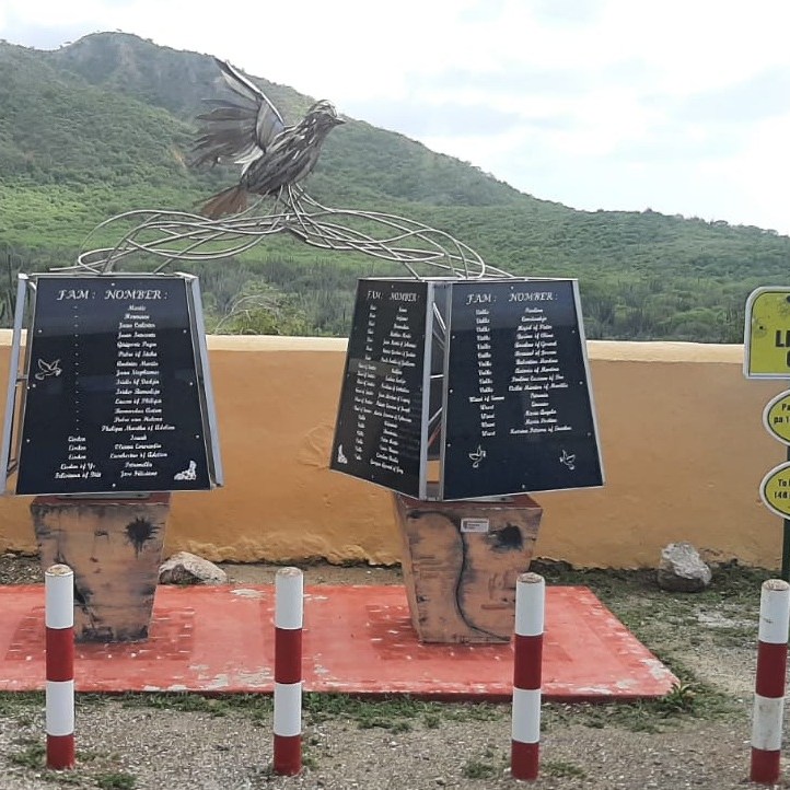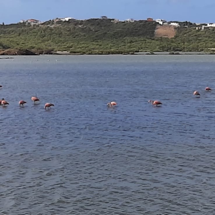 Op de terugweg via Willibrordus langs een nationaal monument. Dit monument symboliseert de bevrijding van slaven en het einde van de slavernij in het gebied. Langs de weg bij de zoutpannen van Jan Kok werden we beloond met een prachtig gezicht: meerdere flamingo’s, statig foeragerend in het ondiepe water.