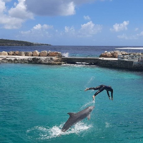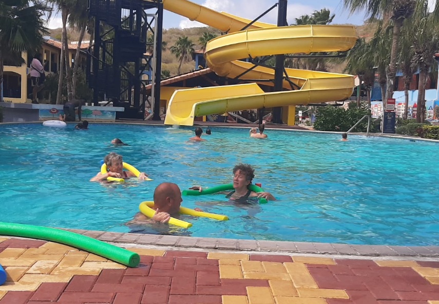 Een aantal van ons kiest ervoor het vandaag rustig aan te doen en blijft op het resort met een goed boek genieten van de vakantie, de warmte en de laatste dagen van ontspanning op Curaçao. We zien ook een aantal gasten meedoen aan een verfrissende aquajogging.
