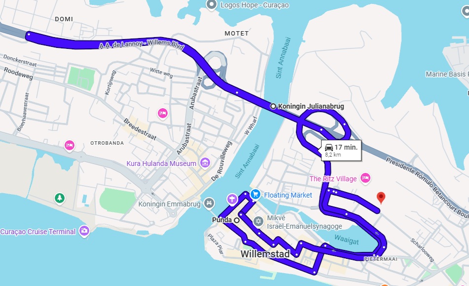Via Willemstad rijden we langs de mooie, oude huizen in Otrobanda en steken we de Julianabrug over naar Punda. Deze wijk is gebouwd in de stijl van de oude Amsterdamse panden. Sinds 1917 is hier ook de drijvende groentemarkt, een van de bekendste bezienswaardigheden van het eiland.