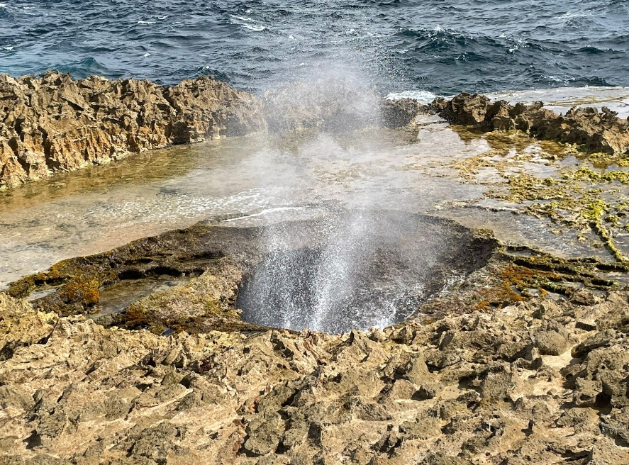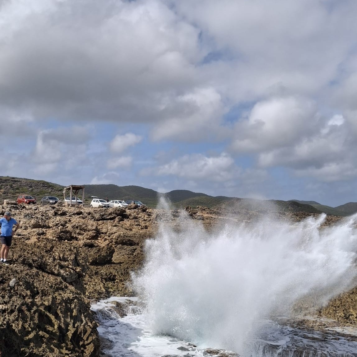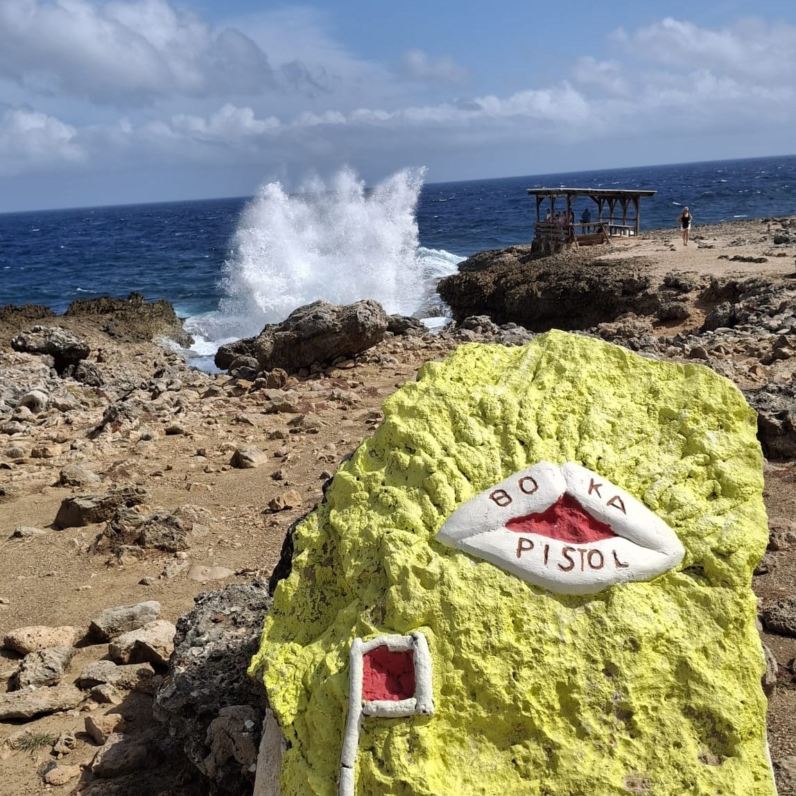 Boka Pistol is aangedaan, een spectaculaire natuurlijke bezienswaardigheid. Boka Pistol is een speciale inham waar de golven van de Caribische zee met enorme kracht tegen de smalle opening slaan. Tanja heeft een mooi filmpje gemaakt.