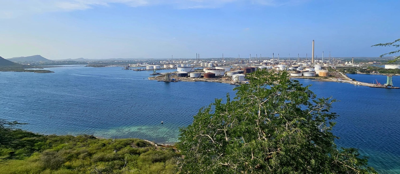 Eerst rijden we vanaf de Noordpunt richting het oosten, naar Jan Thielbaai. Onderweg passeren we Julianna Dorp, een wijk die oorspronkelijk door Shell werd aangelegd voor de werknemers van de raffinaderij. De raffinaderij is in 2019 gesloten.