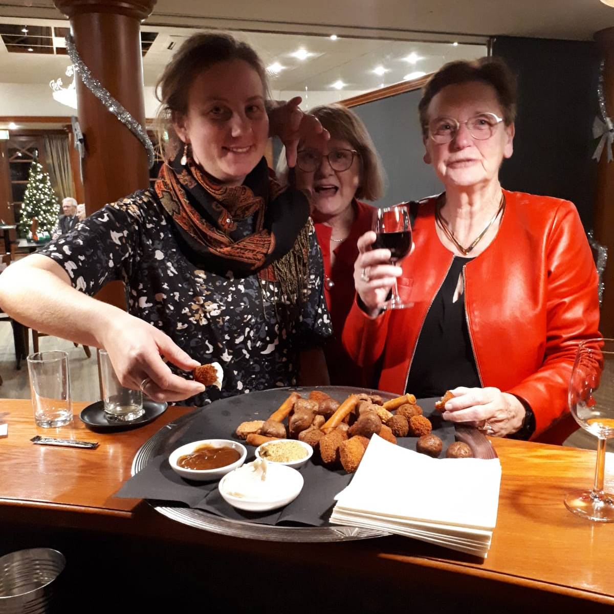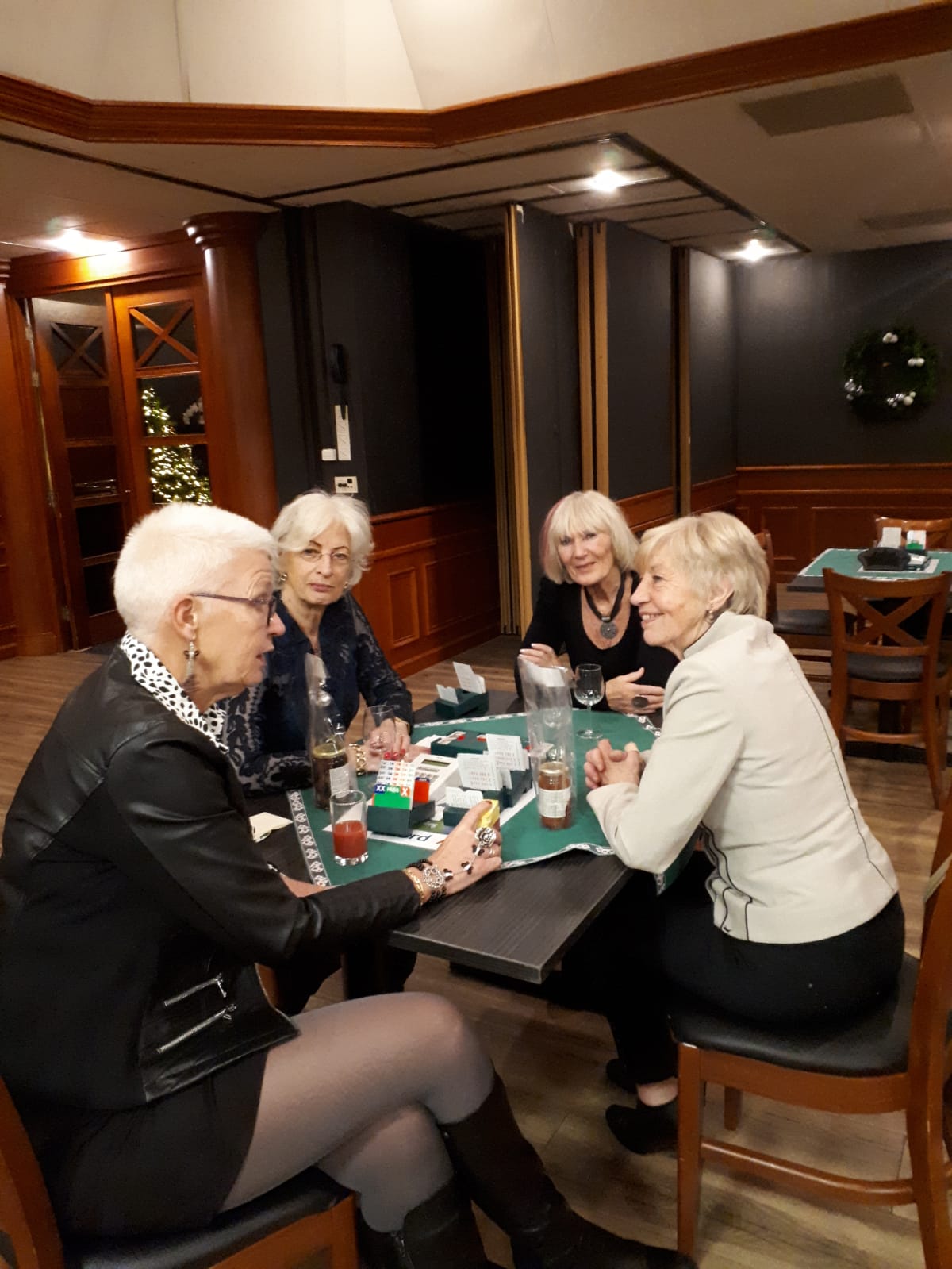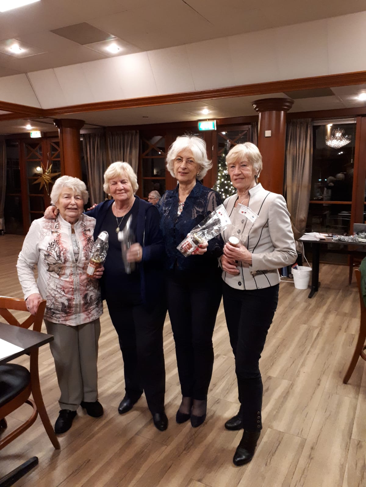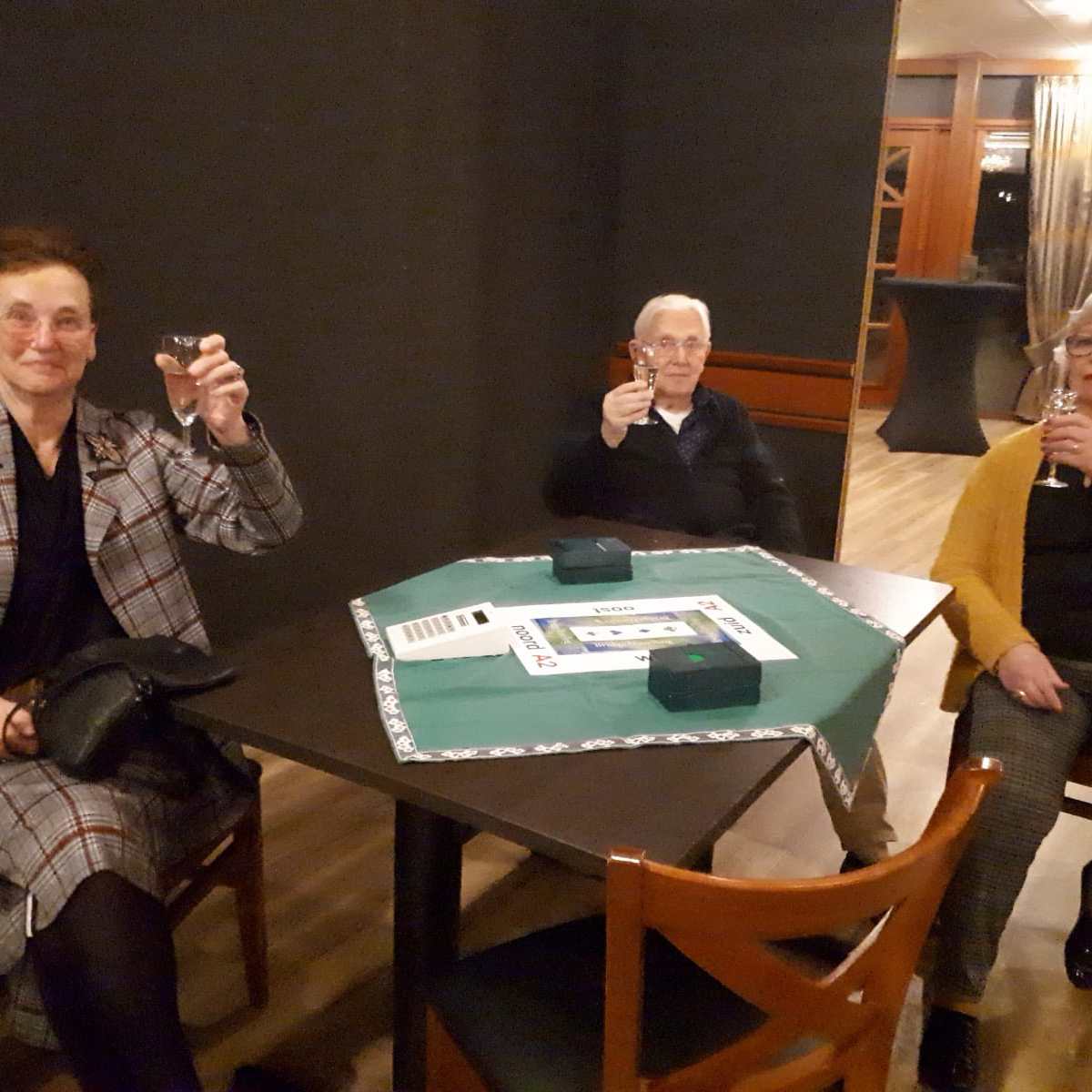 De dagprijs gaat naar Pien en Jaap en de 50%-prijs naar twee paren; Trees en Loes en Henny en Gertruud. Van harte! Tijdens de nababbel worden nog wat spellen besproken, een laatste drankje gedronken en dan is het tijd om de kamers op te zoeken. Morgen 1e Kerstdag kunnen we ontbijten tot 11 uur. Wat een luxe. Naar de uitslagen.