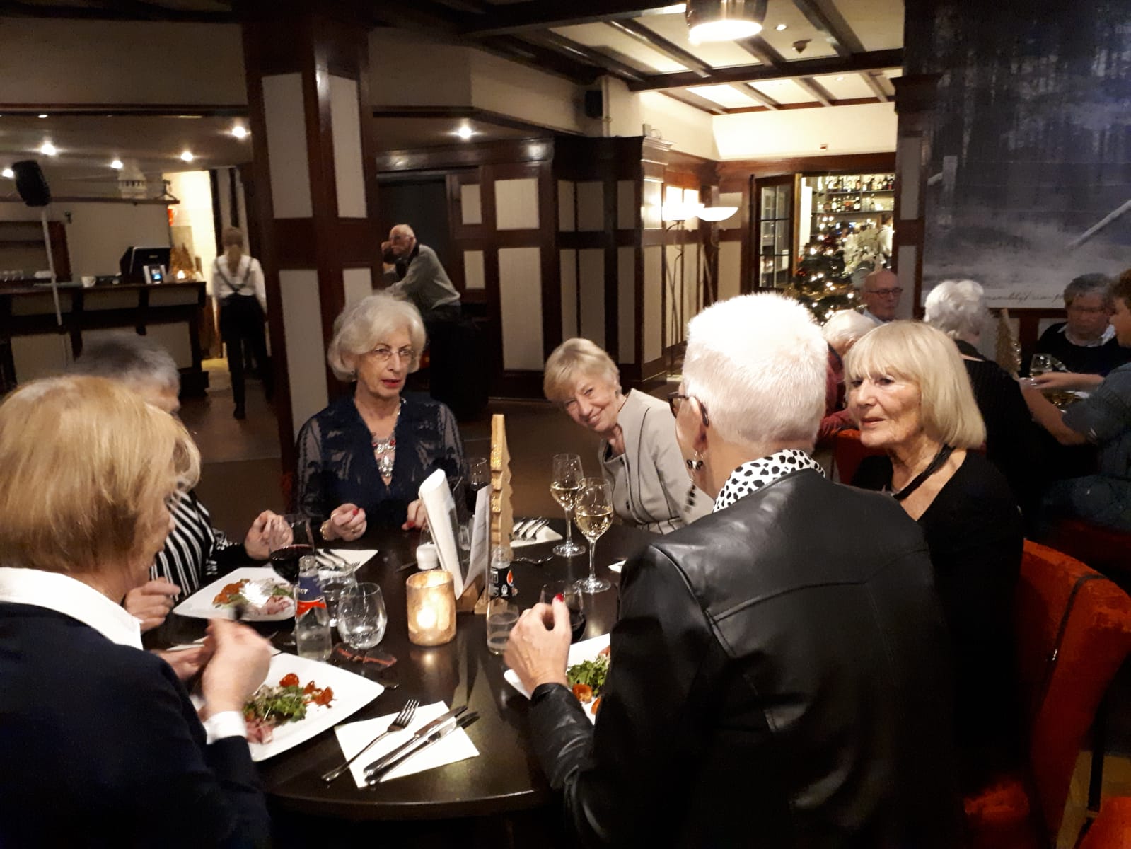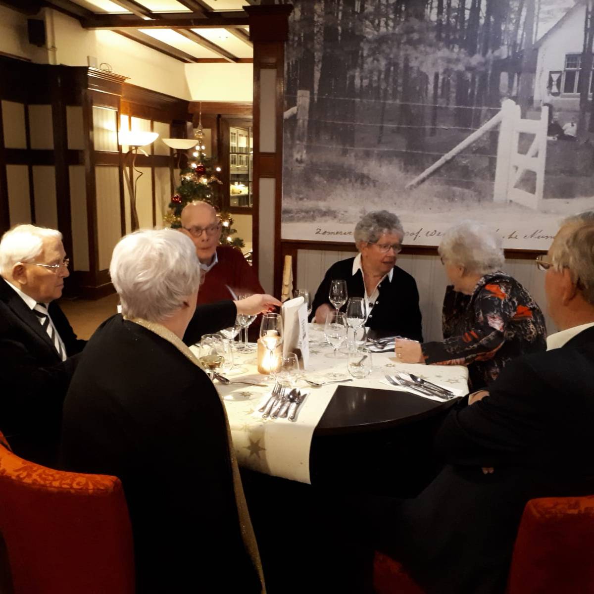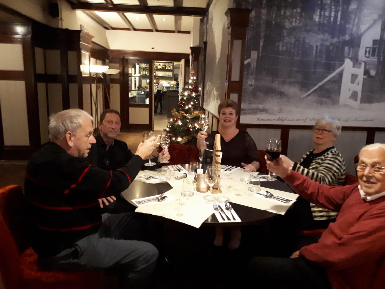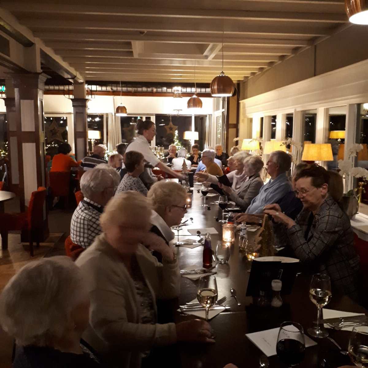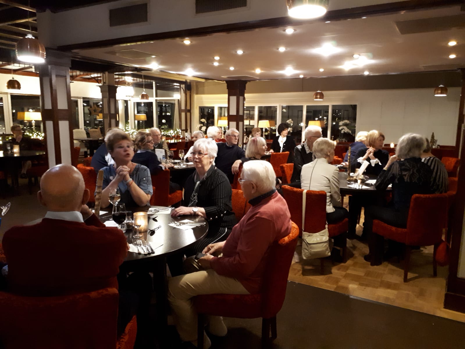 Om half zes werden we aan de tafels verwacht voor ons 4-gangenmenu. Het voor- en hoofdgerecht kon gekozen worden. De tafels waren feestelijk gedekt en de gasten meer dan feestelijk aangekleed. Het eten was naast dat het prachtig gepresenteerd was zeer smakelijk en ook de drankjes smaakte prima.