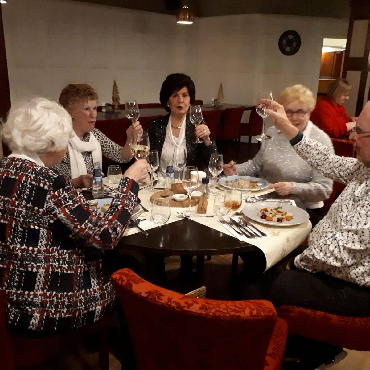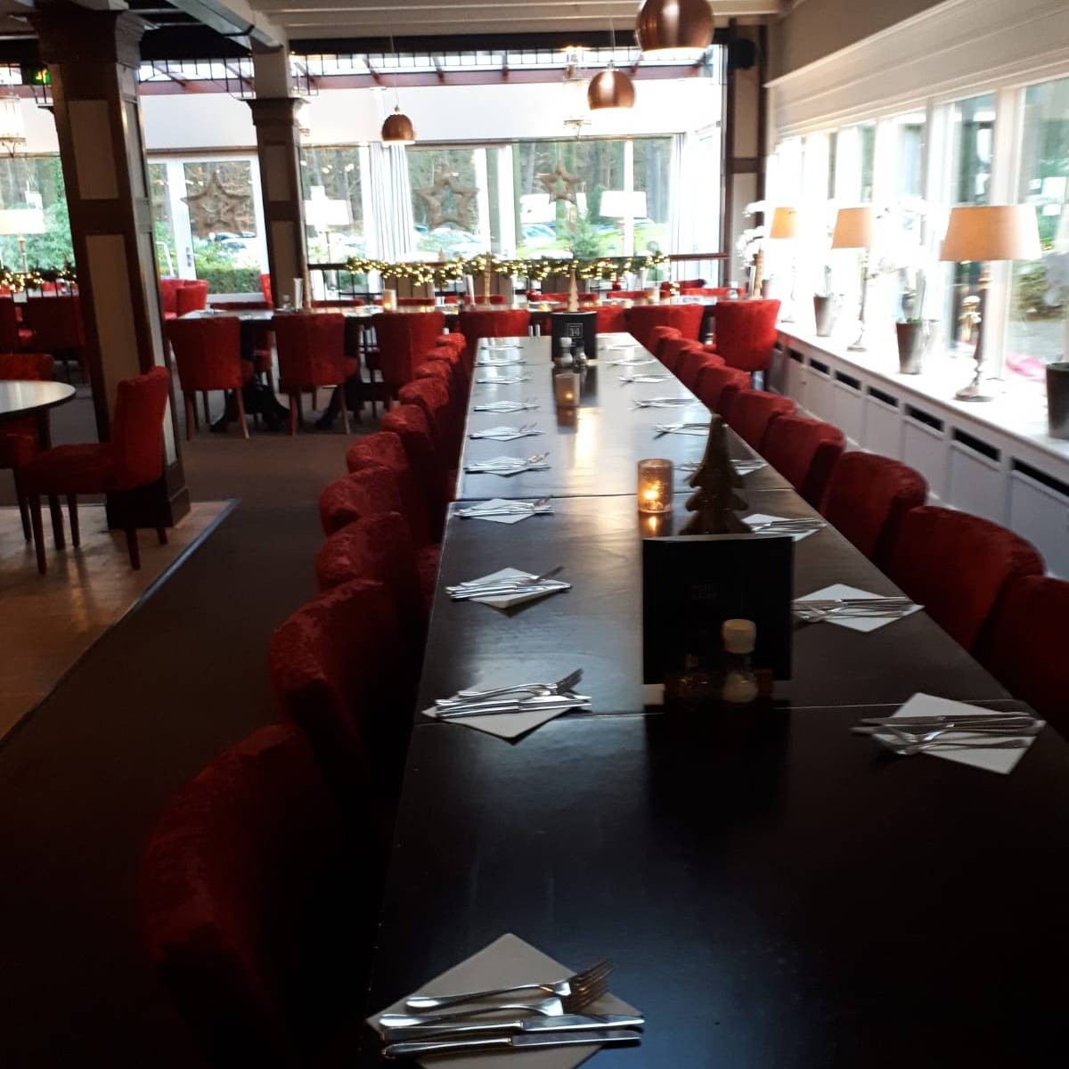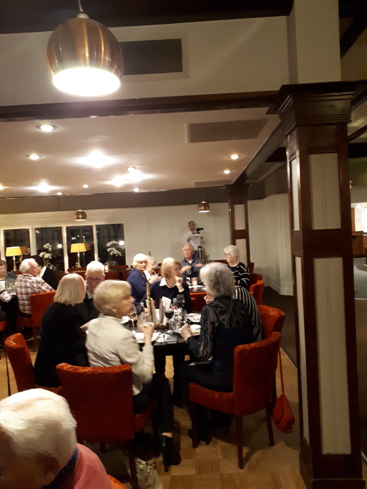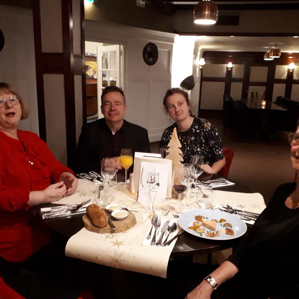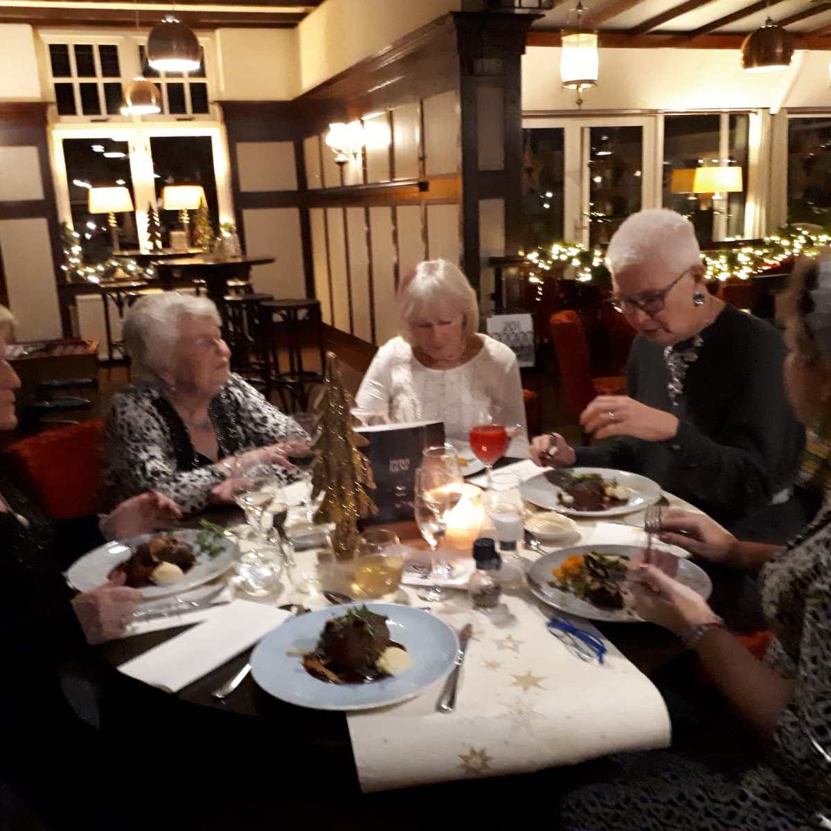 Om half zes werden we aan de tafels verwacht voor ons 4-gangenmenu. Het voor- en hoofdgerecht kon gekozen worden. De tafels waren feestelijk gedekt en de gasten meer dan feestelijk aangekleed. Het eten was naast dat het prachtig gepresenteerd was zeer smakelijk en ook de drankjes smaakte prima.