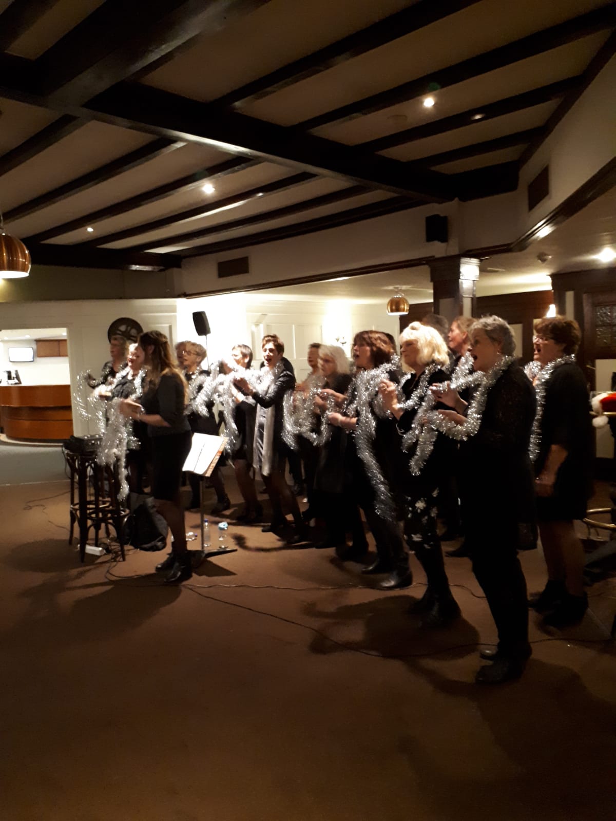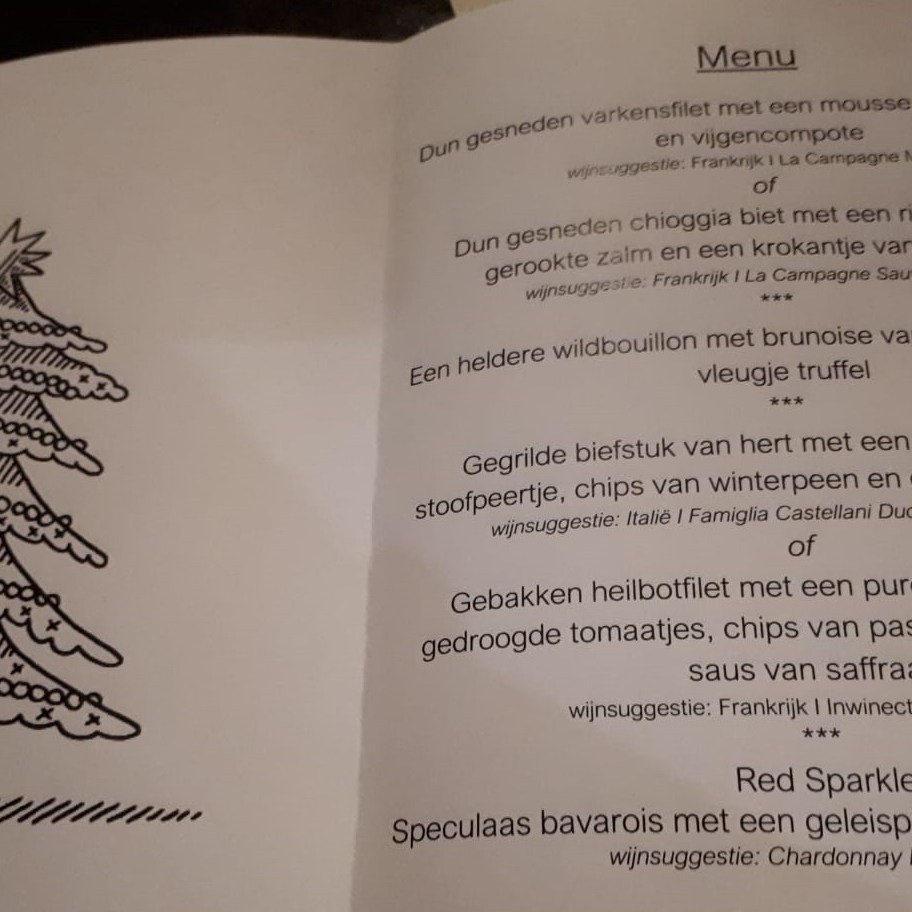 Vandaag eten we aan de gezellige ronde tafels. Tot onze verrassing komt er een koor kerstliederen zingen. Wat een fijn begin van de kerstavond. Het menu ziet er weer heerlijk uit, de wijn smaakt goed en de gesprekken zijn onderhoudend.