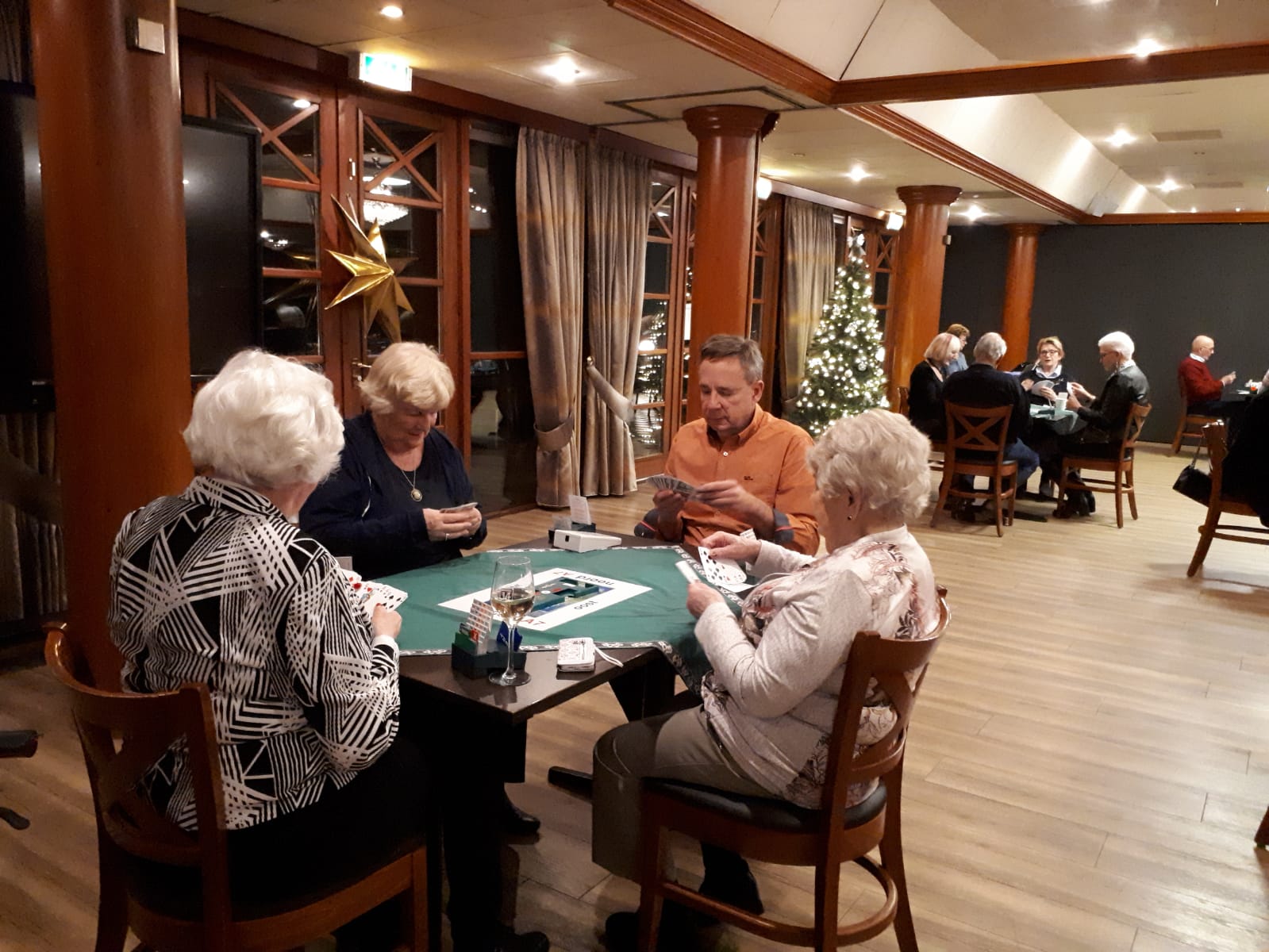 Na de wandeling was iedereen om stipt 13.30 uur in de bridgezaal, voor de laatste ronde van het bridgen. De strijd is nog open, wie zullen de winnaars worden van de kerstbridge in Nunspeet? Koffie, thee en water staan weer klaar. De spellen worden geschud en weer ingevoerd door Anja die deze dagen op deskundige wijze geleid heeft. Ook de hapjes vinden gretig aftrek, na het ontbijt lust men ondertussen wel weer een kleinigheidje.