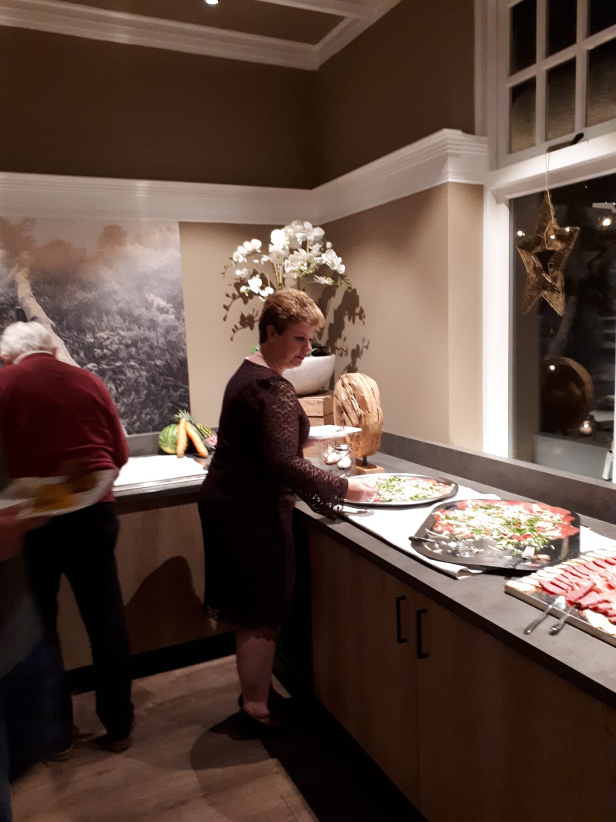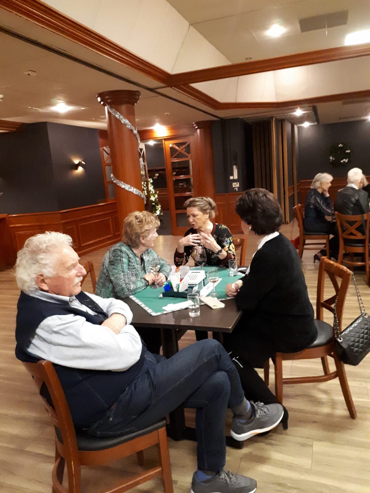 Onze gasten heten we rond 17.30 uur welkom met een lekker drankje. Hierna gaan we aan tafel. Het diner liet ons allen goed smaken. Na het dessert gaan we naar de bridgezaal voor de eerste competitieronde.
