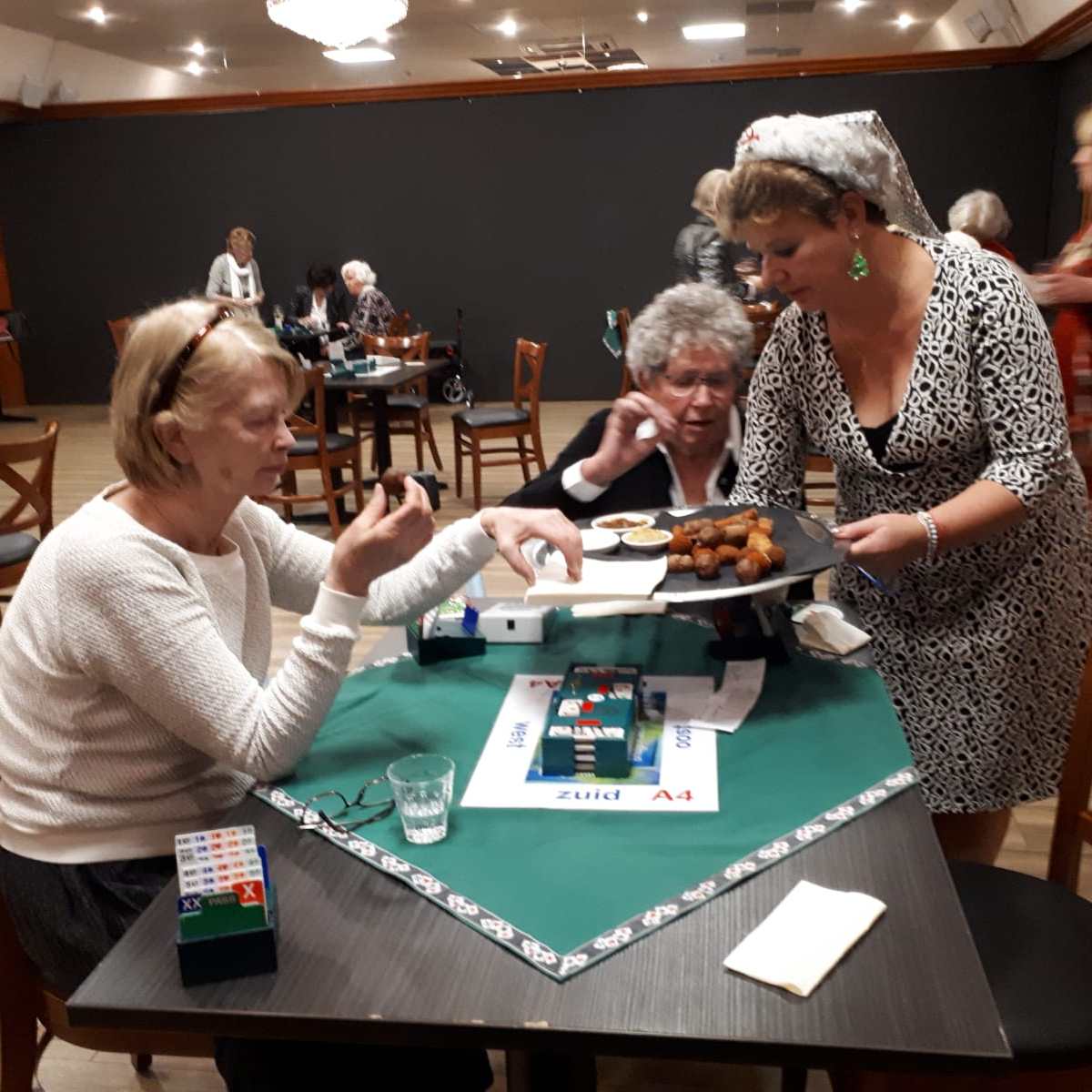 Het bridgen gaat in een fijne sfeer. De zaal leent zich er ook uitermate goed voor. Naast koffie en thee kunnen we de hele avond drankjes halen aan de bar in onze bridgezaal. Ook komt er nog tweemaal de bittergarnituur voorbij.