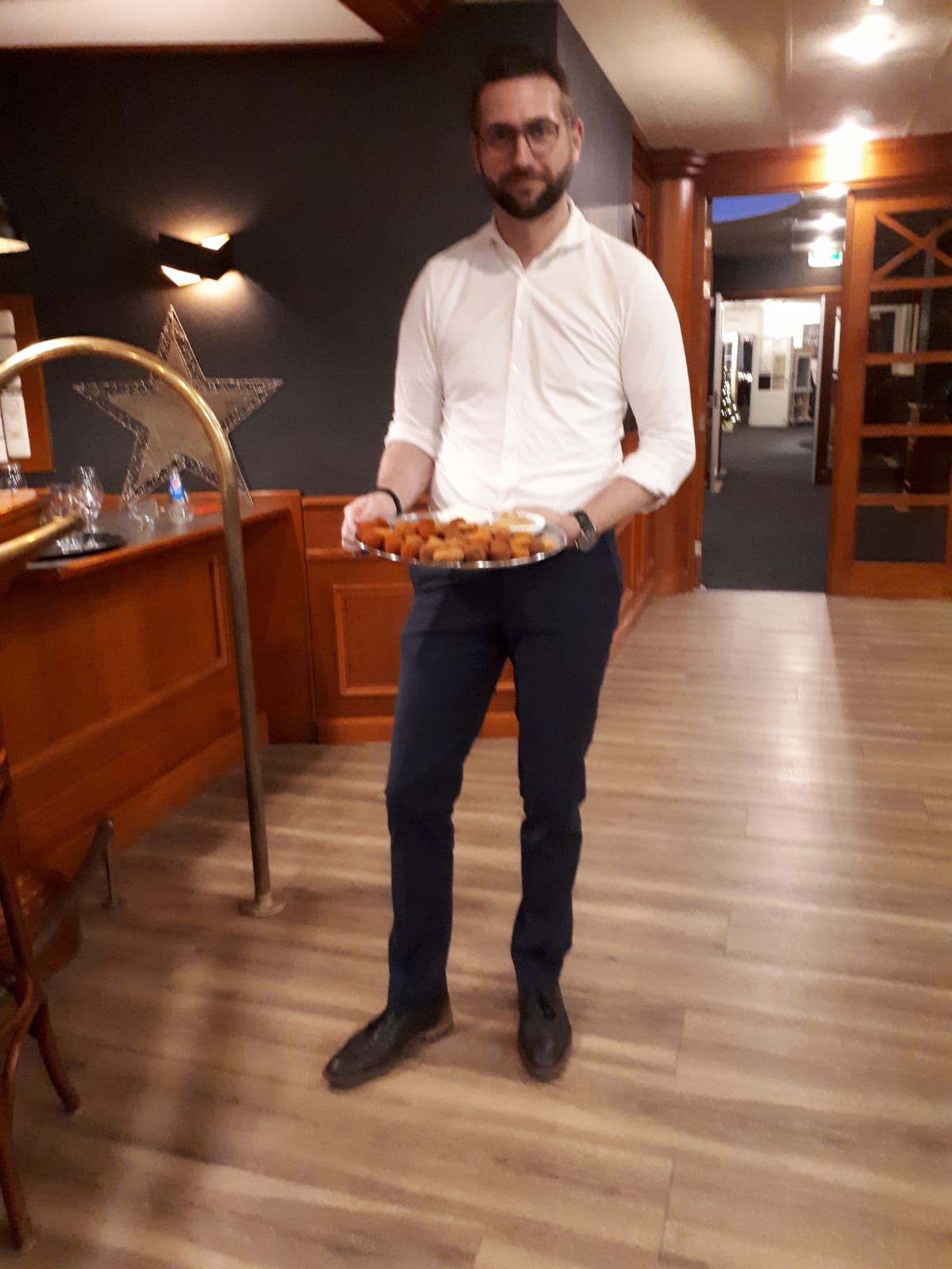 Het hotel is sfeervol aangekleed. Diverse leuke kerstbomen en daarnaast overal mooie en gezellige versiering. De gasten komen langzamerhand allemaal aan. Op de balie staat kerstkrans en daarnaast ontvangen we allemaal een bon voor warme chocolademelk. De kamers worden bezocht, de koffers uitgepakt en de kerstkleding in de kast gehangen. Buiten staat een vuurkorf te branden.