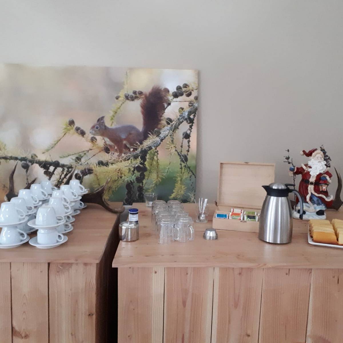 Na afloop van de wandeling staat er koffie en thee klaar met cake in het bezoekerscentrum. Het wandelgroepje is niet zo groot, maar 27 man/vrouw komen koffie drinken en het bezoekerscentrum bekijken. Er worden nog wat leukigheidjes aangeschaft. Daarnaast is er een expositie over de Wolf. Ook op de Veluwe is de wolf gespot en het is een leerzame excursie.