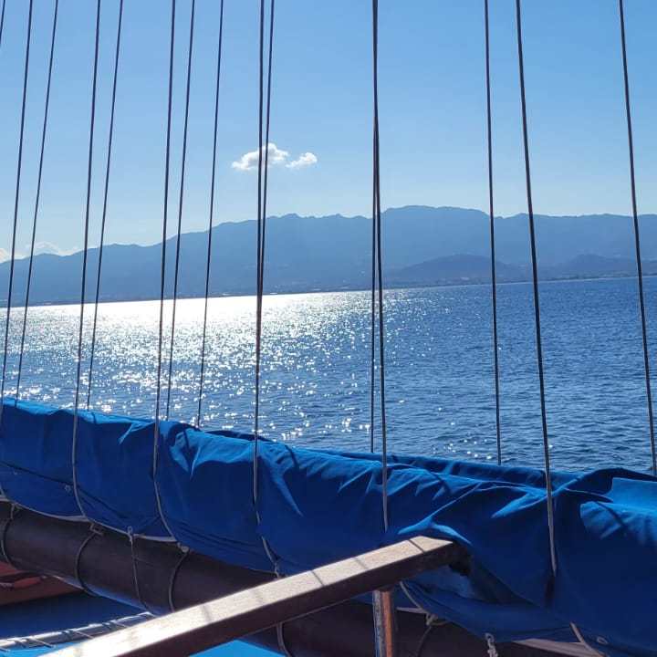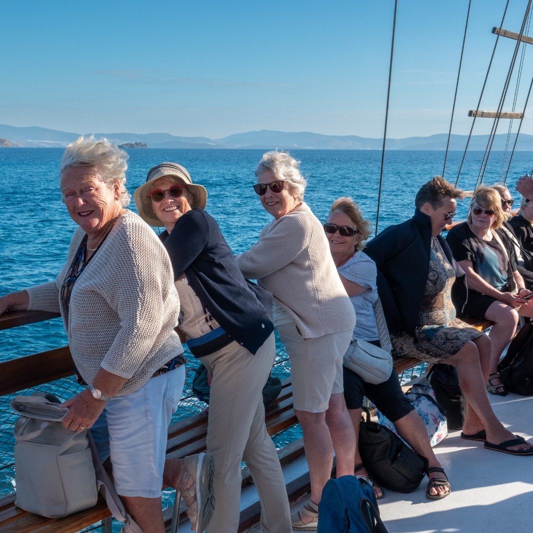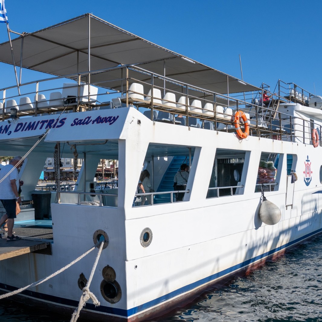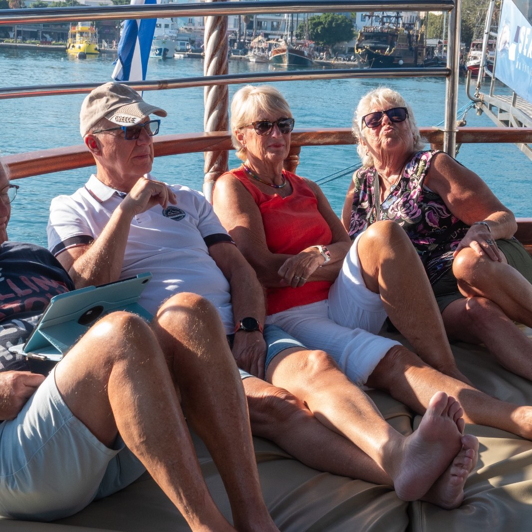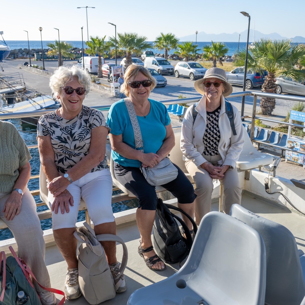 Om 15.30 uur stappen we weer op de boot en vertrekken terug naar Kos. Er staat een stevige wind, wat we duidelijk merken aan de golven. Af en toe krijgen we een flinke plens water over ons heen die tot op het bovendek spat, maar dat mag de pret niet drukken. Al met al een leuke en avontuurlijke overtocht!