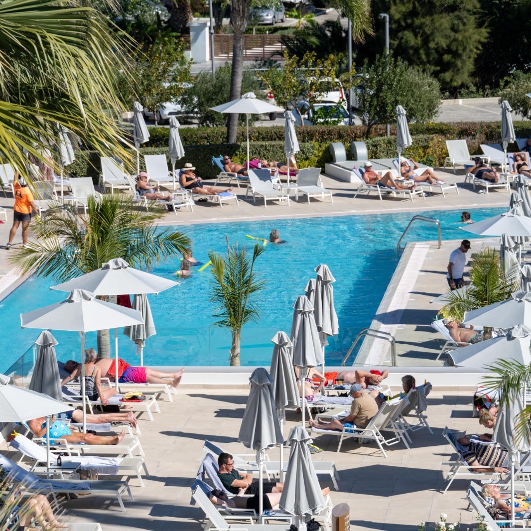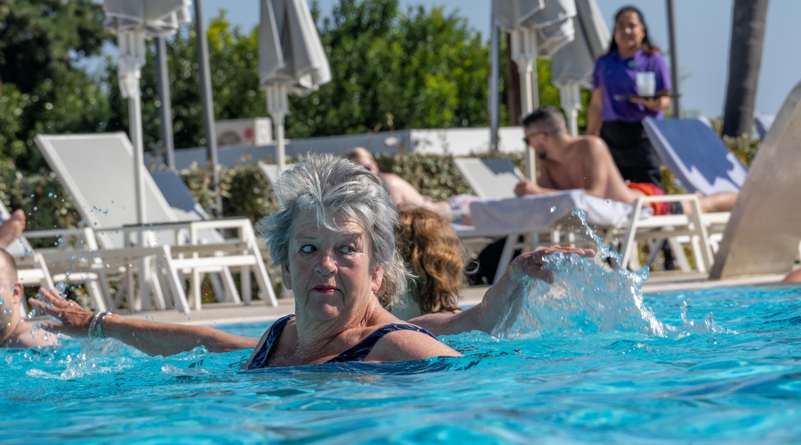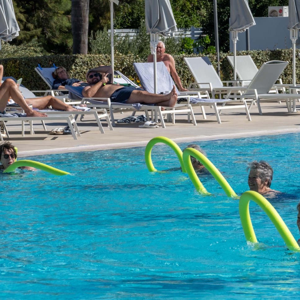 Maar natuurlijk zijn er ook gasten die lekker een puzzeltje maken bij het hotel. Anderen doen weer enthousiast mee met de aquagym, terwijl sommigen er de voorkeur aan geven om aan zee te liggen met een boekje. En ja — zwemmen in de zee is toch echt fijner dan in het zwembad, want het zeewater is een stuk warmer.