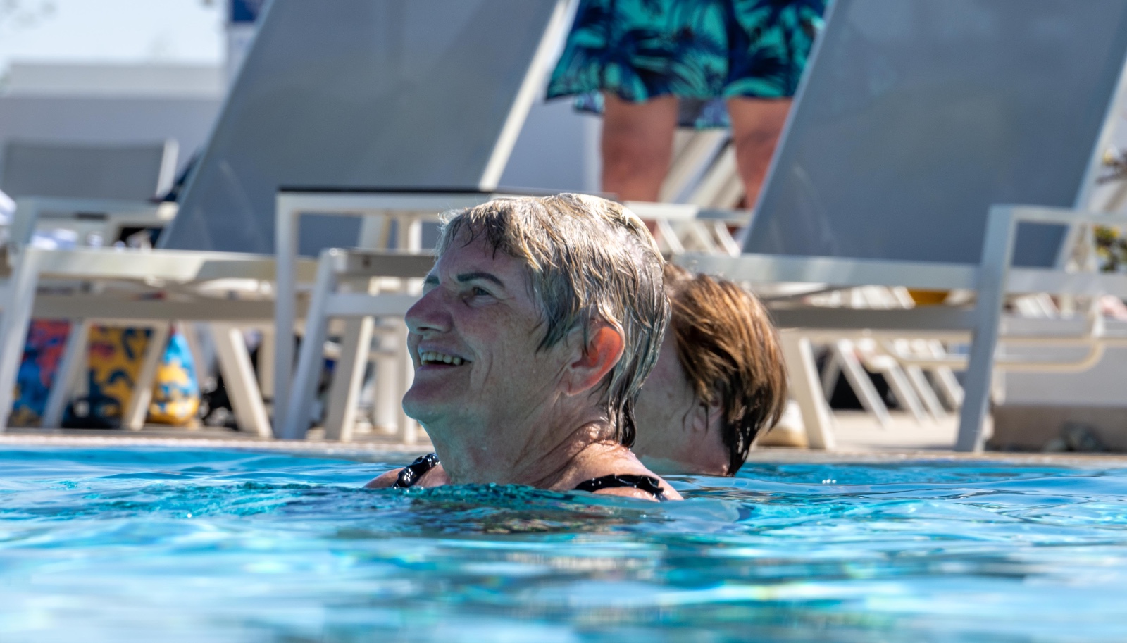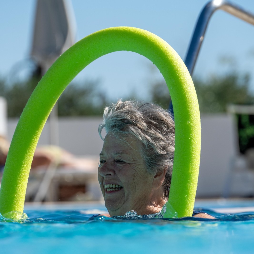 Na twee dagen excursies was het heerlijk om gewoon even te relaxen aan het zwembad of bij de zee. Clementine, Tonny, Katrien en Maria huurden ook een auto en trokken eropuit. Anderen deden enthousiast mee aan de aquagym — lekker actief in het water!