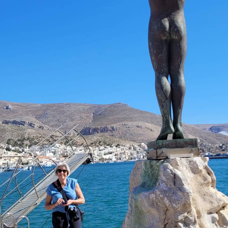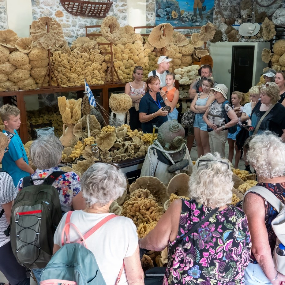 Het eerste eiland Kalymnos is het sponzeneiland. Het ligt vrij dichtbij Kos. Daar bezoeken we een sponzenwerkplaats. Martine onze gids vertelt over de sponzen. Ook laat de ondernemer zien hoe ze de sponzen wit maken, eerst een bad met kaliumpermanganaat waar hij rood uitkomt daarna peroxide waardoor hij bleekt. De witte sponzen gaan niet zo lang mee maar sommige mensen vinden de witte mooier. Normaal gaat een spons zeker 10 jaar mee als je hem goed behandeld.