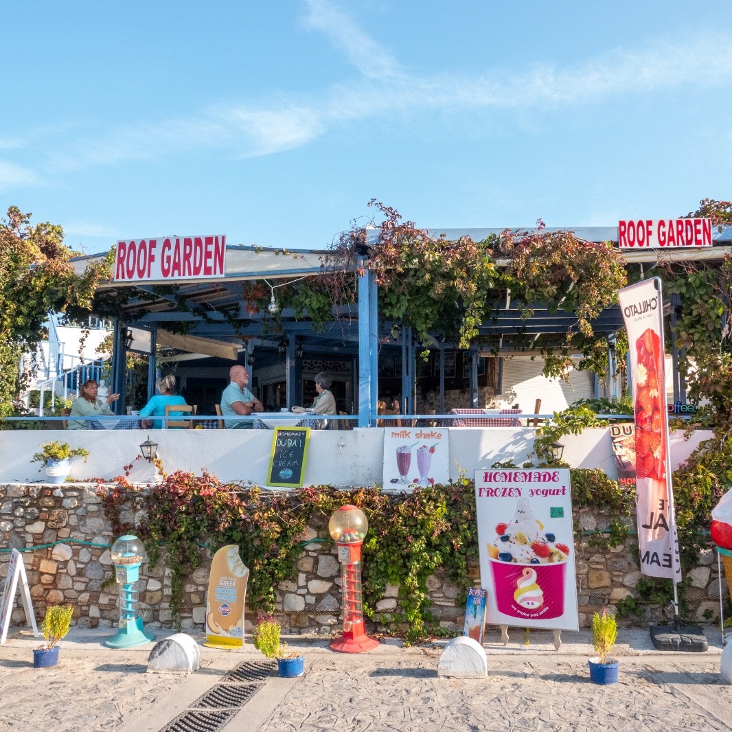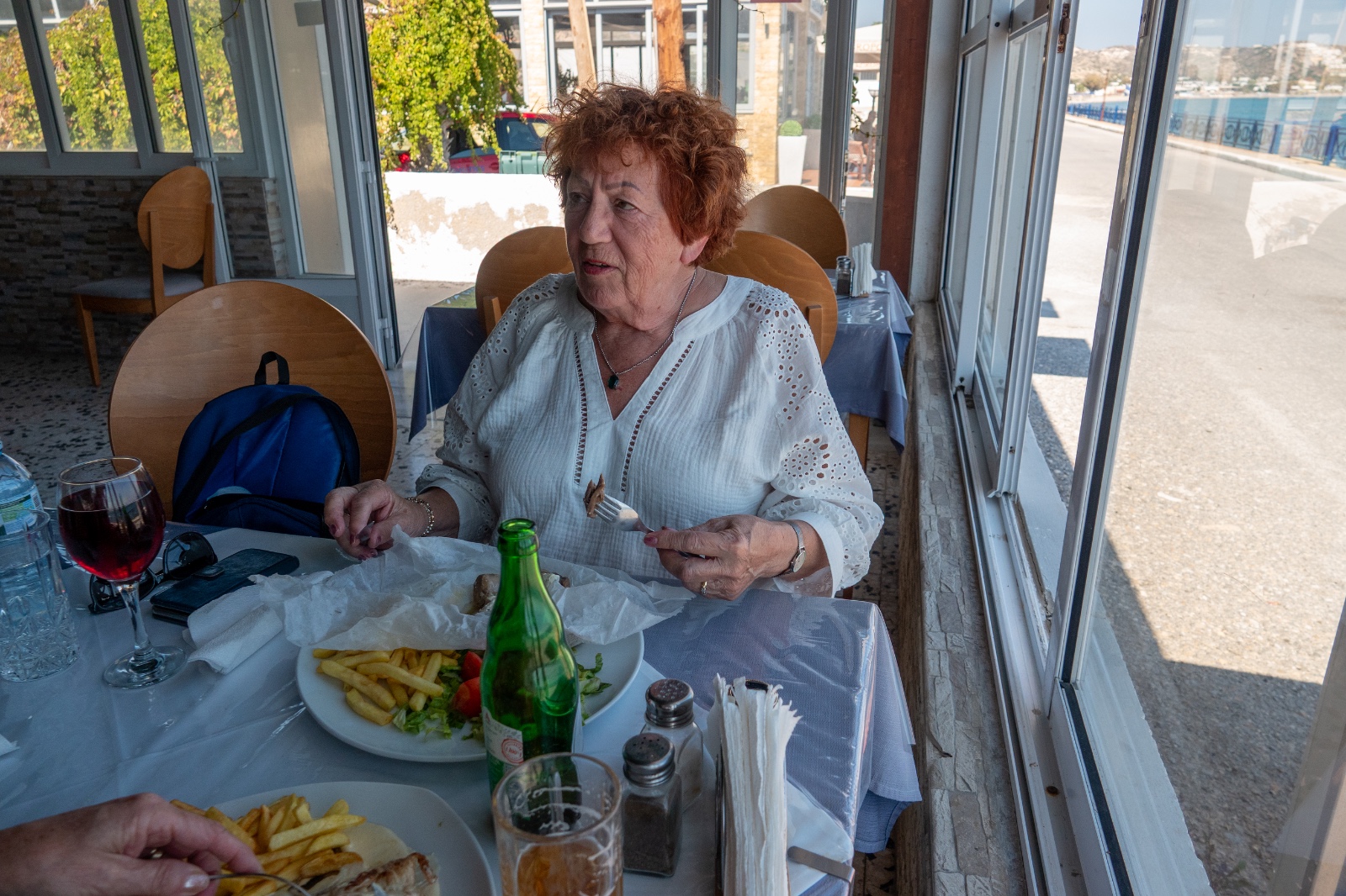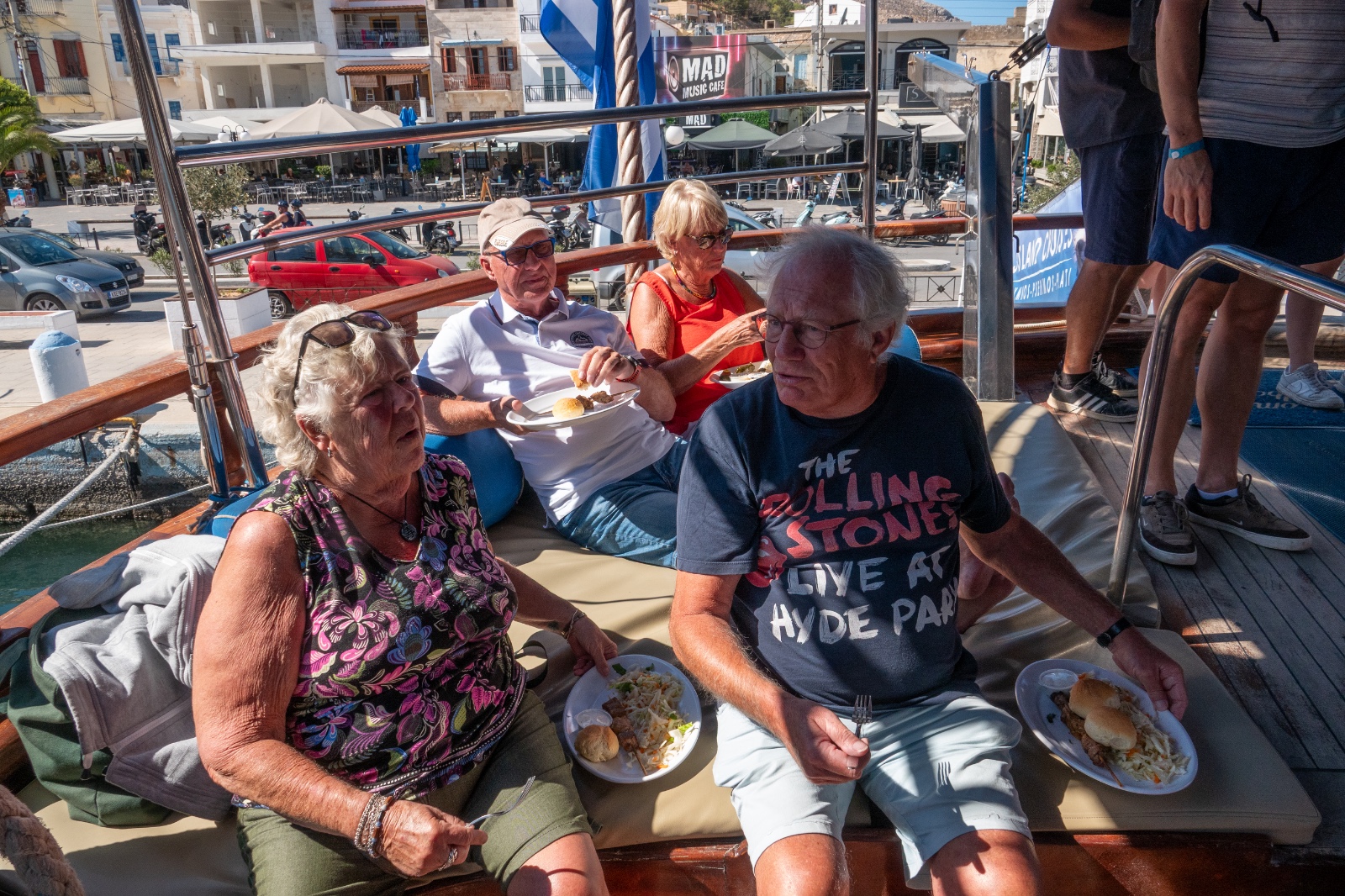In Kefalos genieten we van een heerlijke lunch. Sommigen nemen kleftiko – een pakketje van papier gevuld met lamsvlees, champignons en kaas. Anderen kiezen voor een souvlaki of moschari stifado (kalfsvlees dat langzaam is gestoofd met ui, geserveerd met salade en frietjes). Alle gerechten gaan natuurlijk vergezeld van een frisse salade en frietjes.