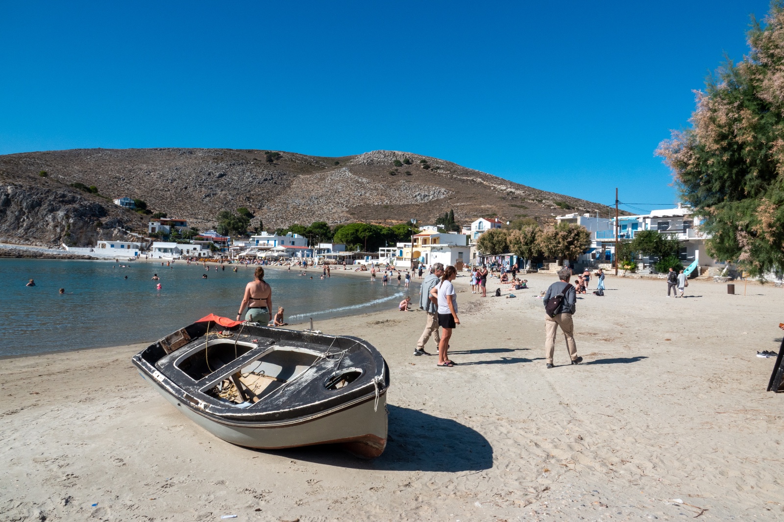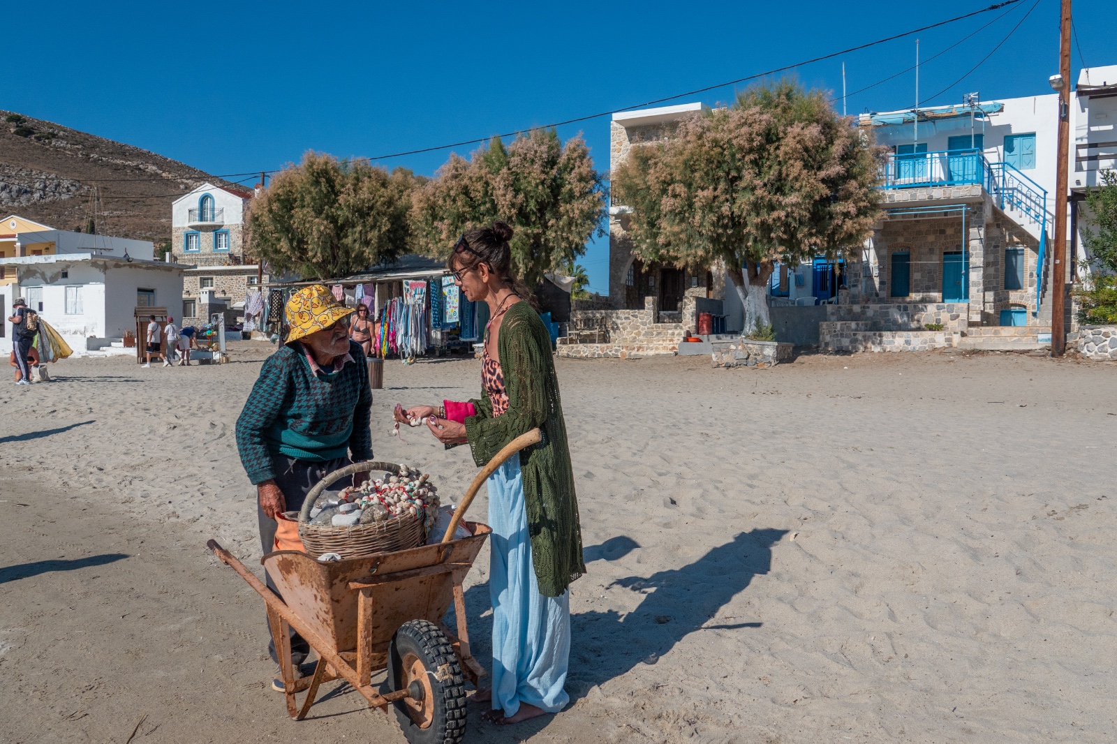 Na het bezoek aan Kalymnos voeren we verder naar het rustige eiland Pserimos. Witte huisjes, een zandstrand en een paar gezellige tavernes vormen het hart van het dorpje. We hadden hier weer wat tijd voor onszelf. We lopen naar het kerkje, maar helaas gesloten. Even later komt er een oud mannetje met een kruiwagen aangelopen die schelpen verkoopt. Natuurlijk hebben we wat gegeven voor de schelpen.