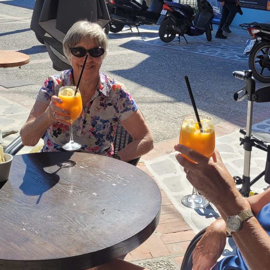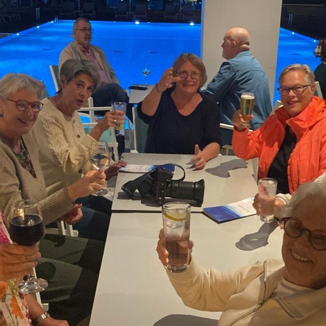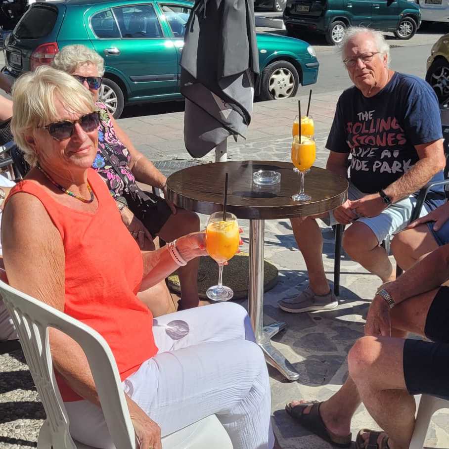 Laat in de middag kwam de zon door. We hebben nog even aan het zwembad gezeten en zijn vervolgens naar ons balkon verhuisd. Na een heerlijk avondeten met als thema Grieks, haha o.a. heerlijke gyros, hebben we samen met de gasten die al aanwezig zijn alvast een beetje geoefend met 5 rondjes van 3 spellen. Henny en Dorith zijn als winnaars uit de bus gekomen. Deze overwinning is alvast binnen 🙂 .