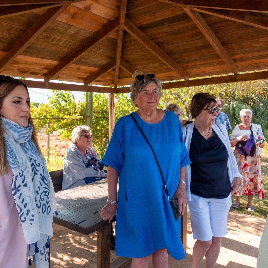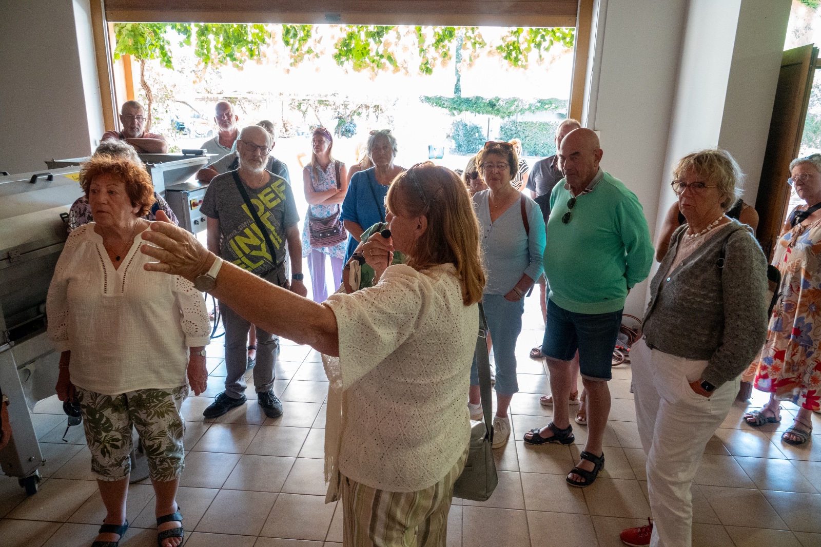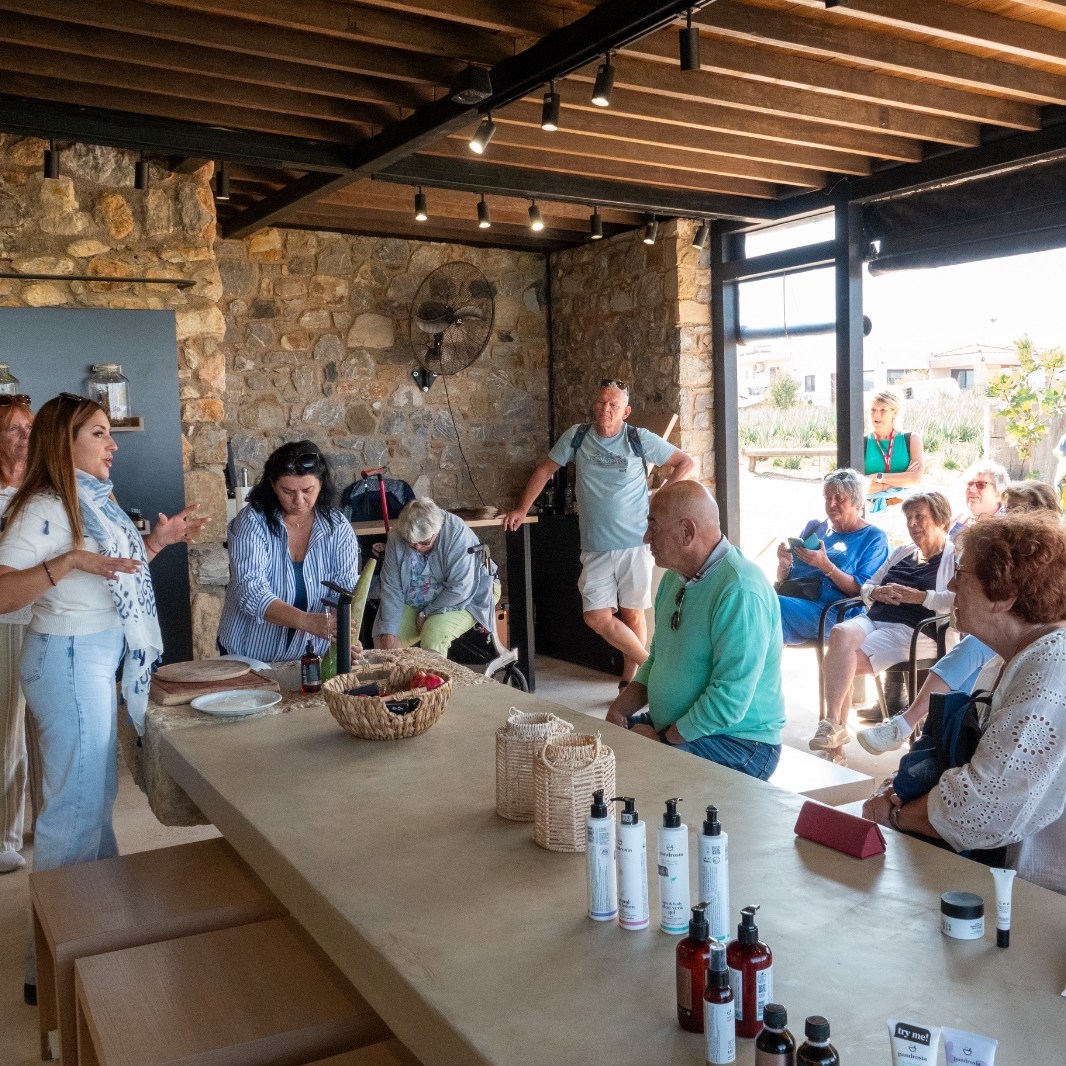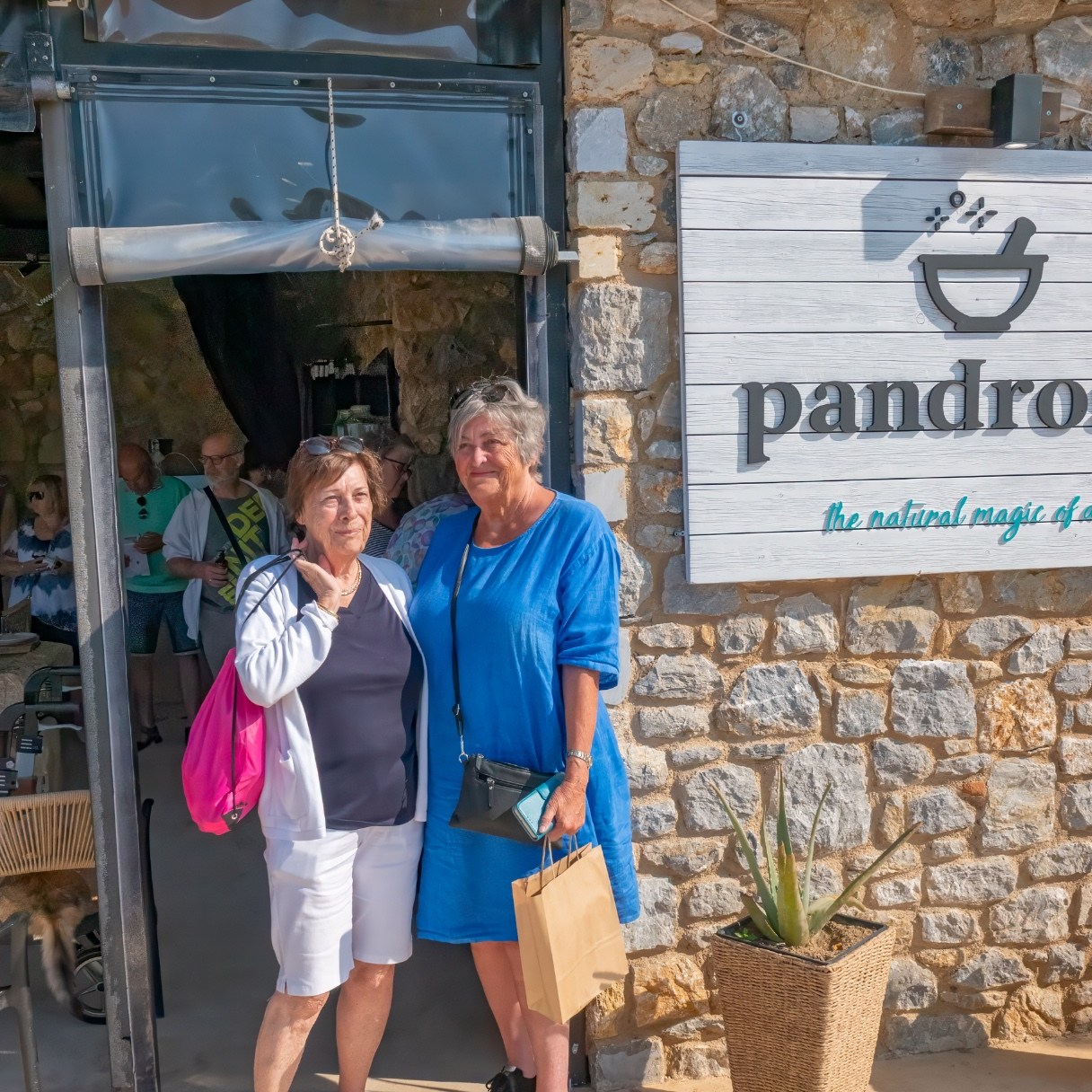 De bus rijdt vervolgens naar boven waar we een super mooi uitzicht hebben. De gids Martine vertelt mooie verhalen over het eiland. Dan volgt nog een wijnproeverij en een olijfpers. Wijnmakerij Skevofilax is een familiebedrijf dat in 2010 met wijnbouw is begonnen en verbouwt diverse druivenrassen, zowel inheemse Griekse variëteiten als internationale klassiekers.