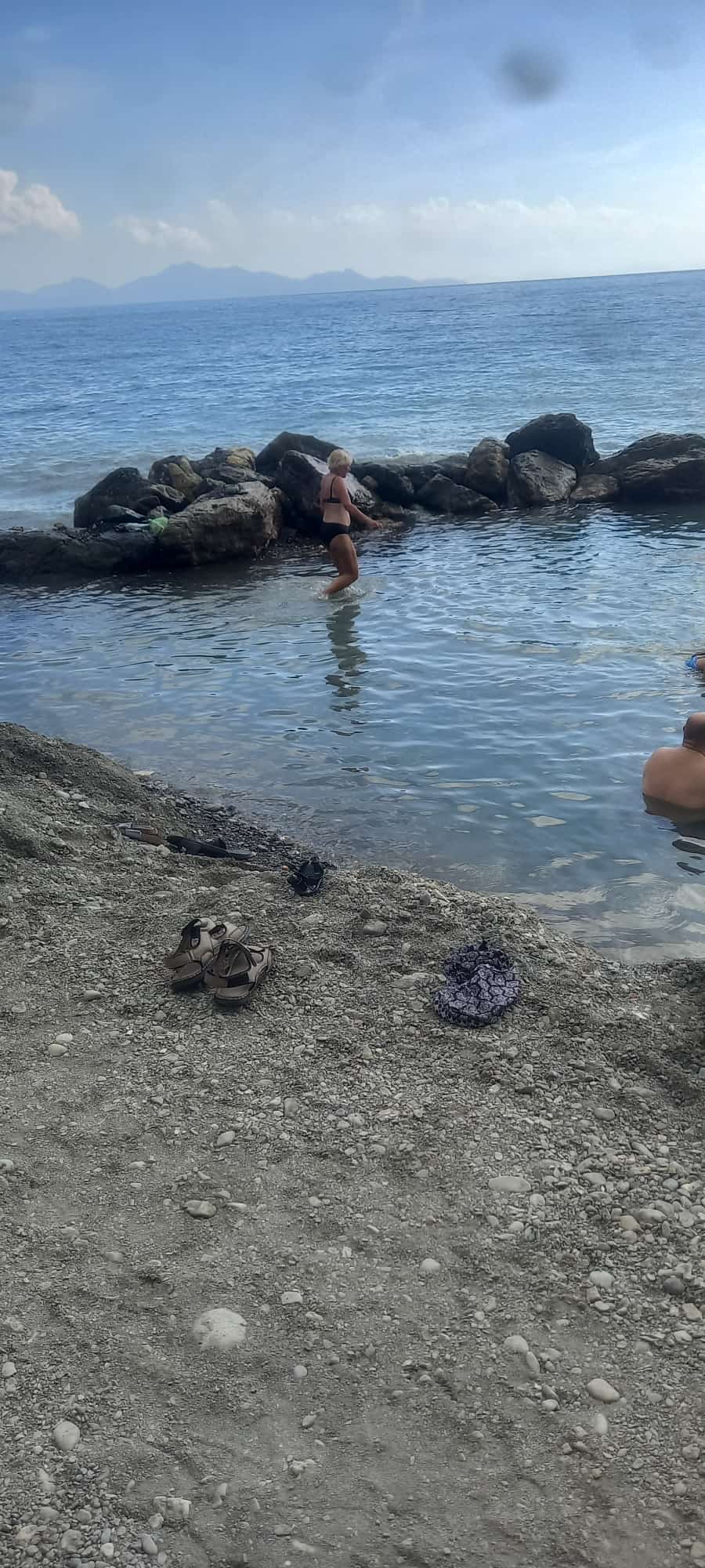 Gelukkig hebben we allemaal waterschoentjes meegenomen, zo heb je geen hinder van de keitjes. Verder wordt het wel snel diep dus echt warm is het zeewater niet maar het is wel perfect voor verkoeling en even zwemmen want er waren nauwelijks golven. Uit de zee komen was soms wel een dingetje want het gaat een beetje steil en dan op die keitjes die weg rollen. 😳