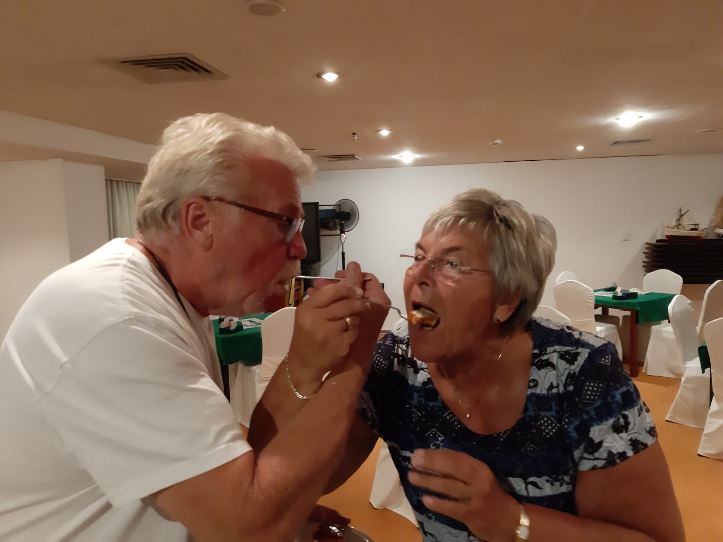 Na het diner gaan we naar de bridgezaal en spelen onze 1e competitieronde. De airco is met ingang van 30 september 2019 stilgelegd. Voor ons mag de airco aan want ondanks de oktobermaand is het erg warm. Morgen extra waaiers plaatsen en de ramen extra wijd open zetten. De speelavond verloopt zonder problemen onder het genot van een drankje en een hapje. Jacques en Francisca eindigen als eerste. Zij ontvangen de BT-dagprijs. Gefeliciteerd! Naar de uitslag.